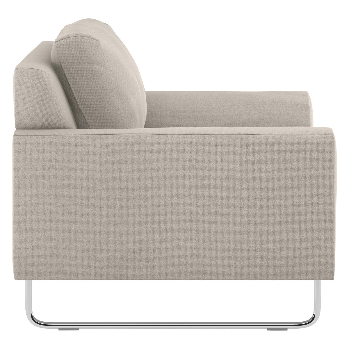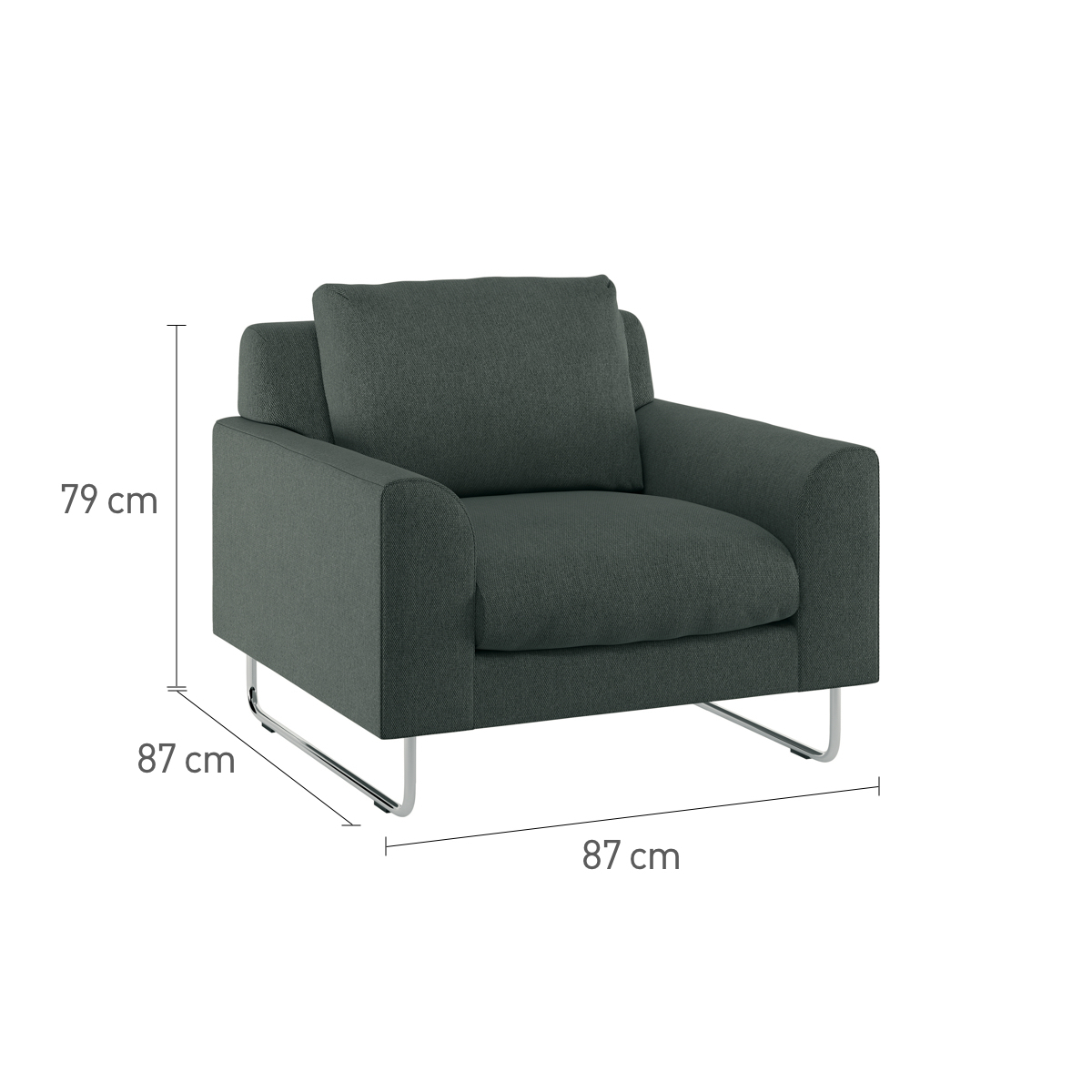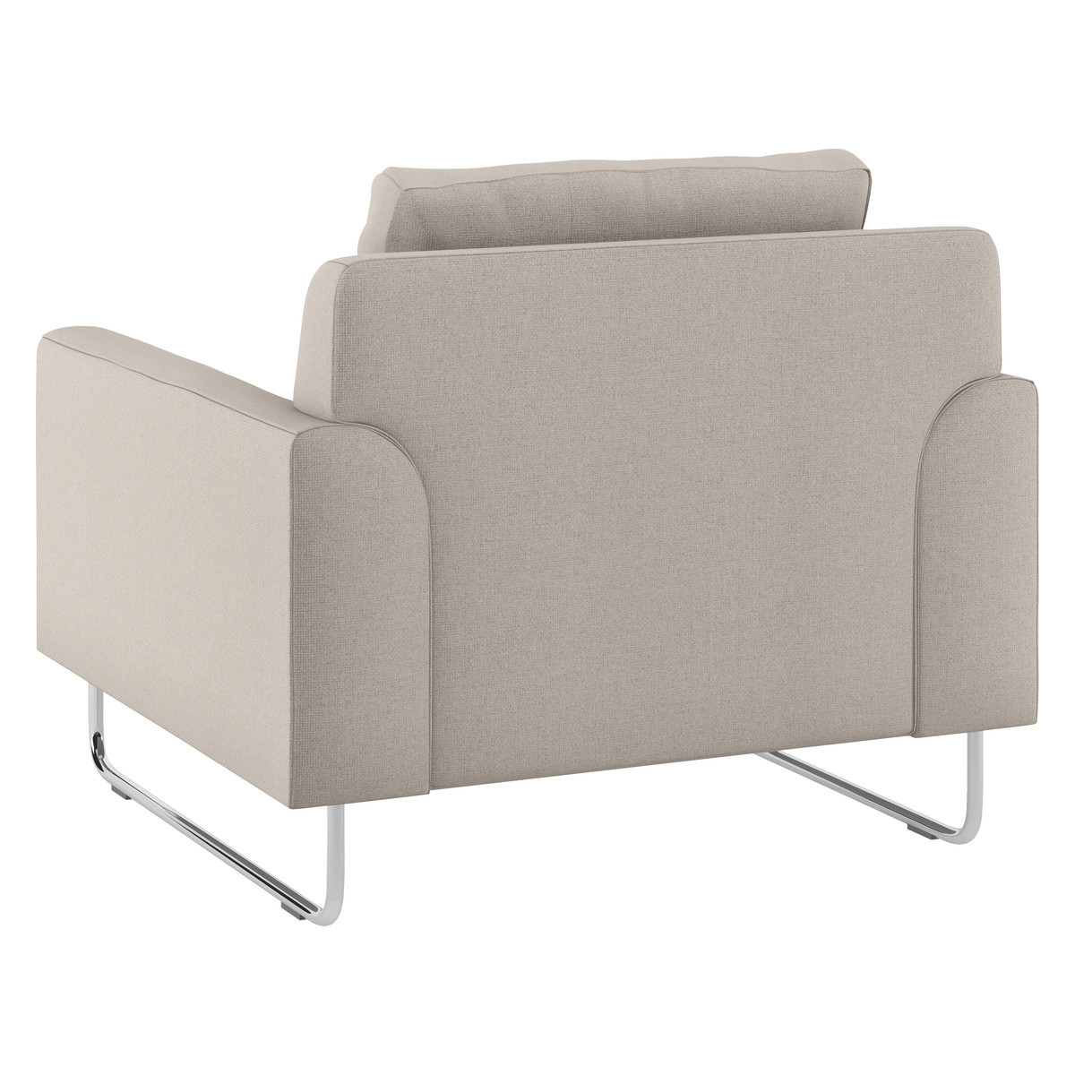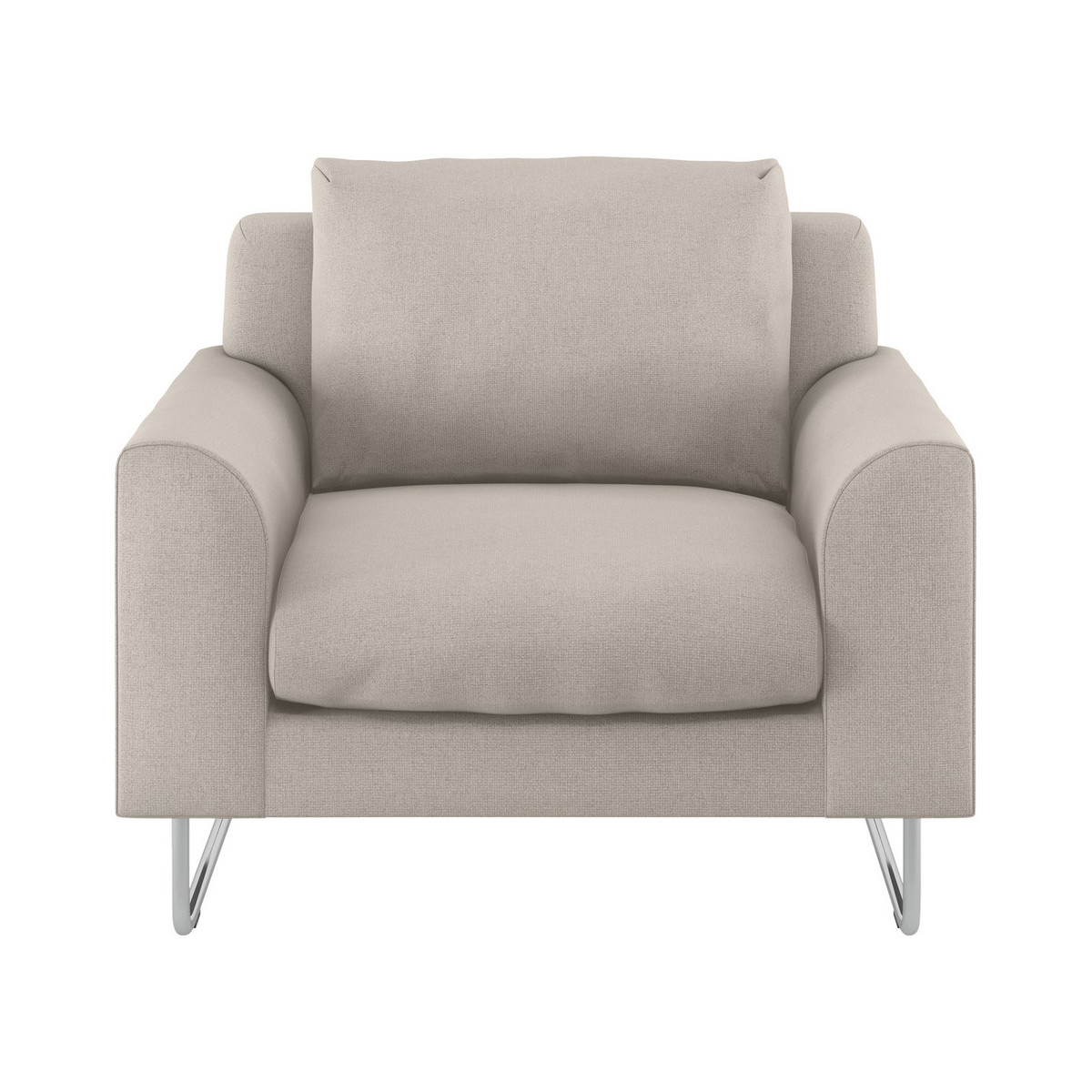 With large, squashy cushions and curved arms that soften its angular lines, the Lyle natural textured fabric armchair is a relaxed, contemporary design. Perched on chromed ski legs, the inviting armchair's narrow frame allows a generous seat for its size;its cushions have a neat tucked detail on their corners and are removable for regular plumping. The armchair is hand made to order and is part of the Lyle range, available in various sizes with fabric or leather upholstery in a choice of colours.