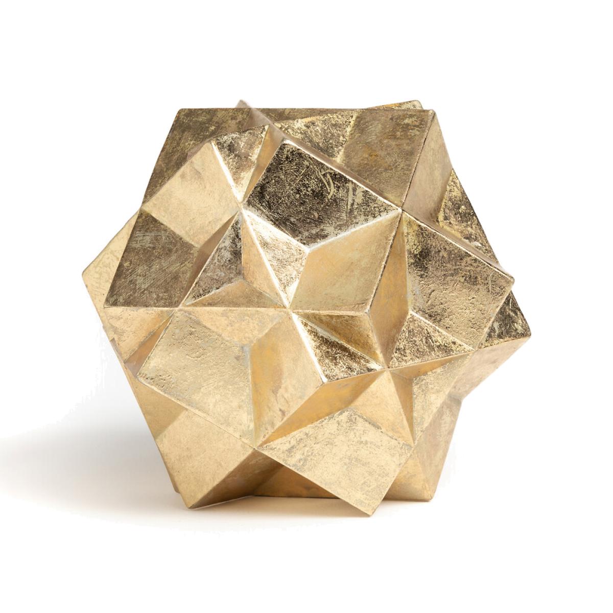 I love this geometric sculpture because of its striking, modern aesthetic and reflective finish, which adds a touch of sophistication to any space. It works particularly well in contemporary and minimalist interiors, where its bold form can serve as a statement piece on sideboards, coffee tables, or open shelving. For practical styling, consider pairing it with neutral tones to highlight its metallic sheen, or combine with textured materials like wood or fabrics to create visual contrast. Keep in mind its sculptural nature and avoid overcrowding with other decor, allowing it to stand out as a focal point.
