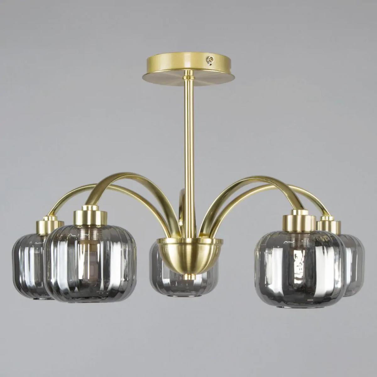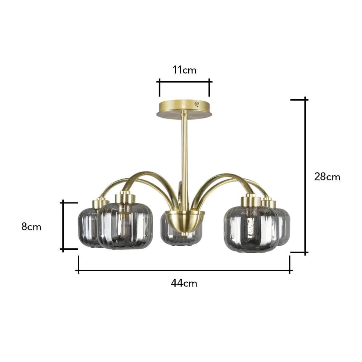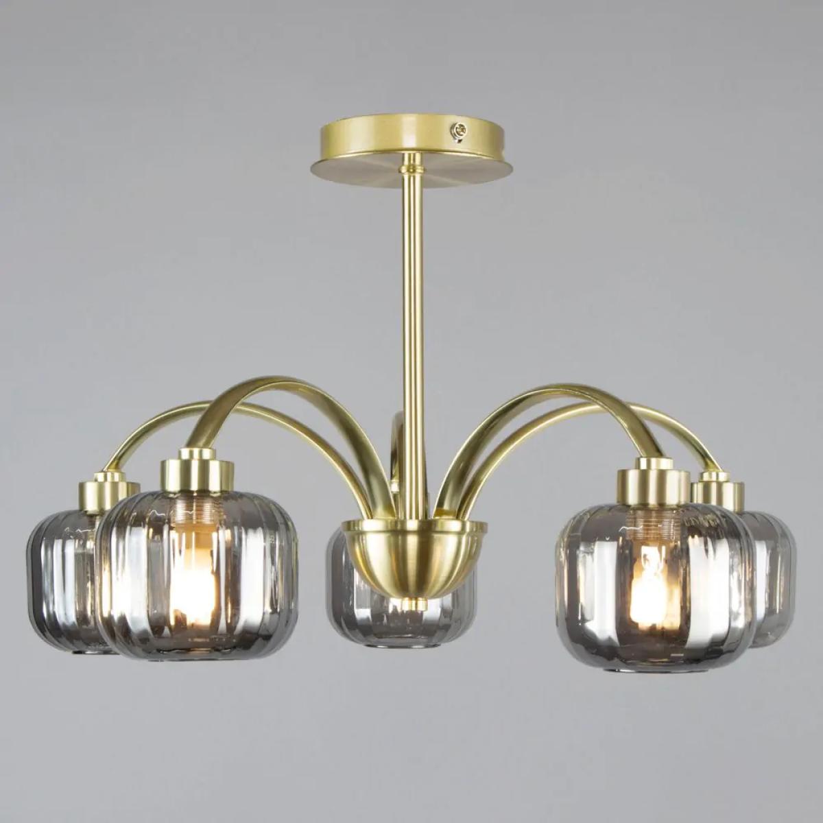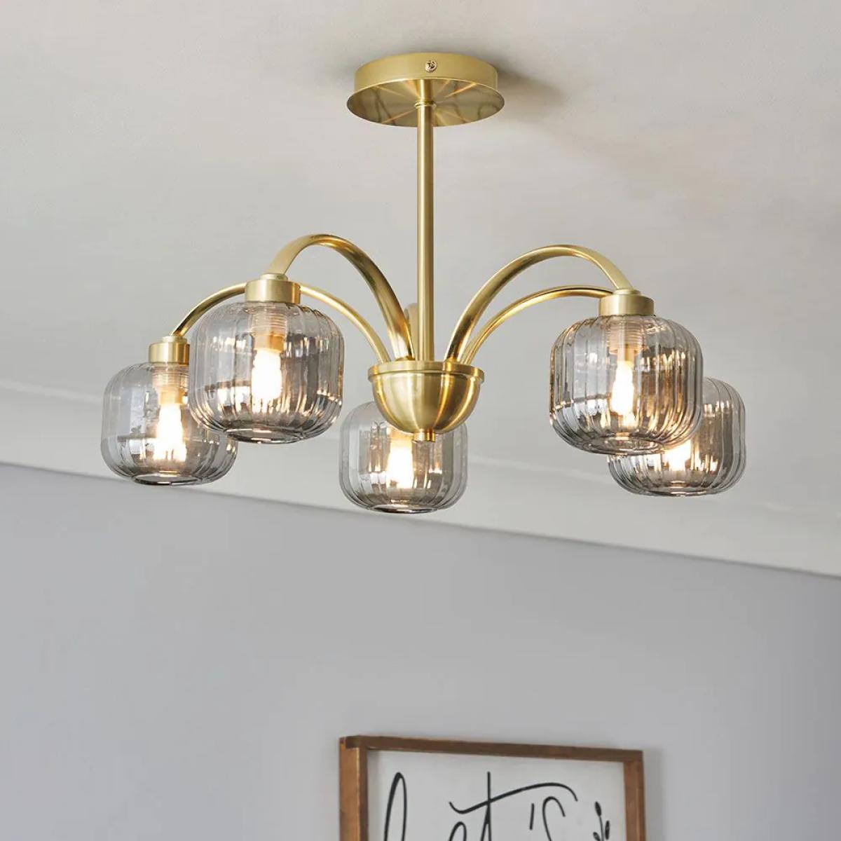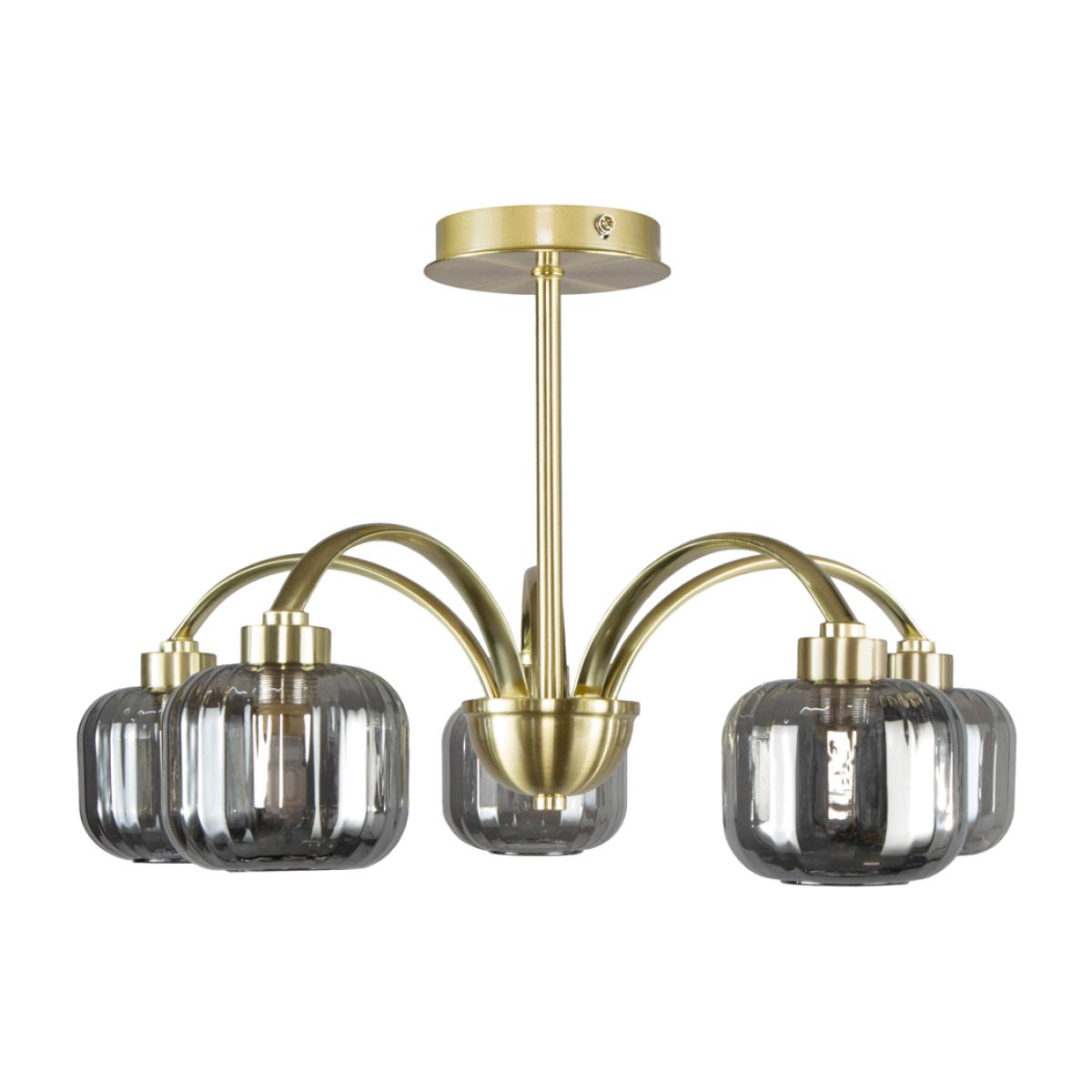 Bring the roaring 20s into your home with the Lyna Large Semi Flush Ceiling Light with Smoked Glass Shades. This art deco ceiling light is accentuated by the smoked glass shades and the satin brass finish. The five lights of this semi-flush ceiling light will flood any room with light.