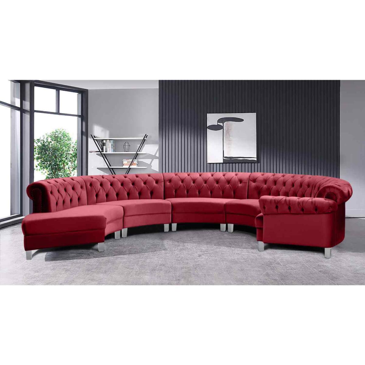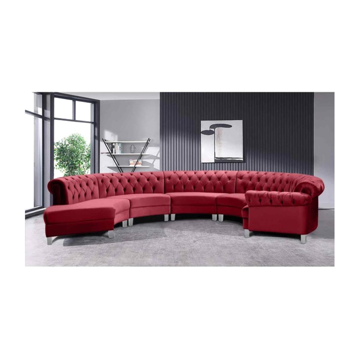 I love this corner sofa in the velour fabric with fabric buttons-it's a statement piece that offers both comfort and sophisticated style. The rich red adds warmth and vibrancy, making it ideal for creating cosy, inviting living spaces or adding a bold splash of colour to more neutral interiors. It works particularly well in modern or eclectic interiors, where its plush texture can complement smooth finishes and minimalistic decor. Practical styling tips include pairing with neutral or monochrome cushions to let the sofa stand out, and using subtle metallic accents or sleek side tables for a contemporary touch. Its sizeable form also lends itself well to larger rooms, making it a focal point for socialising and relaxing.