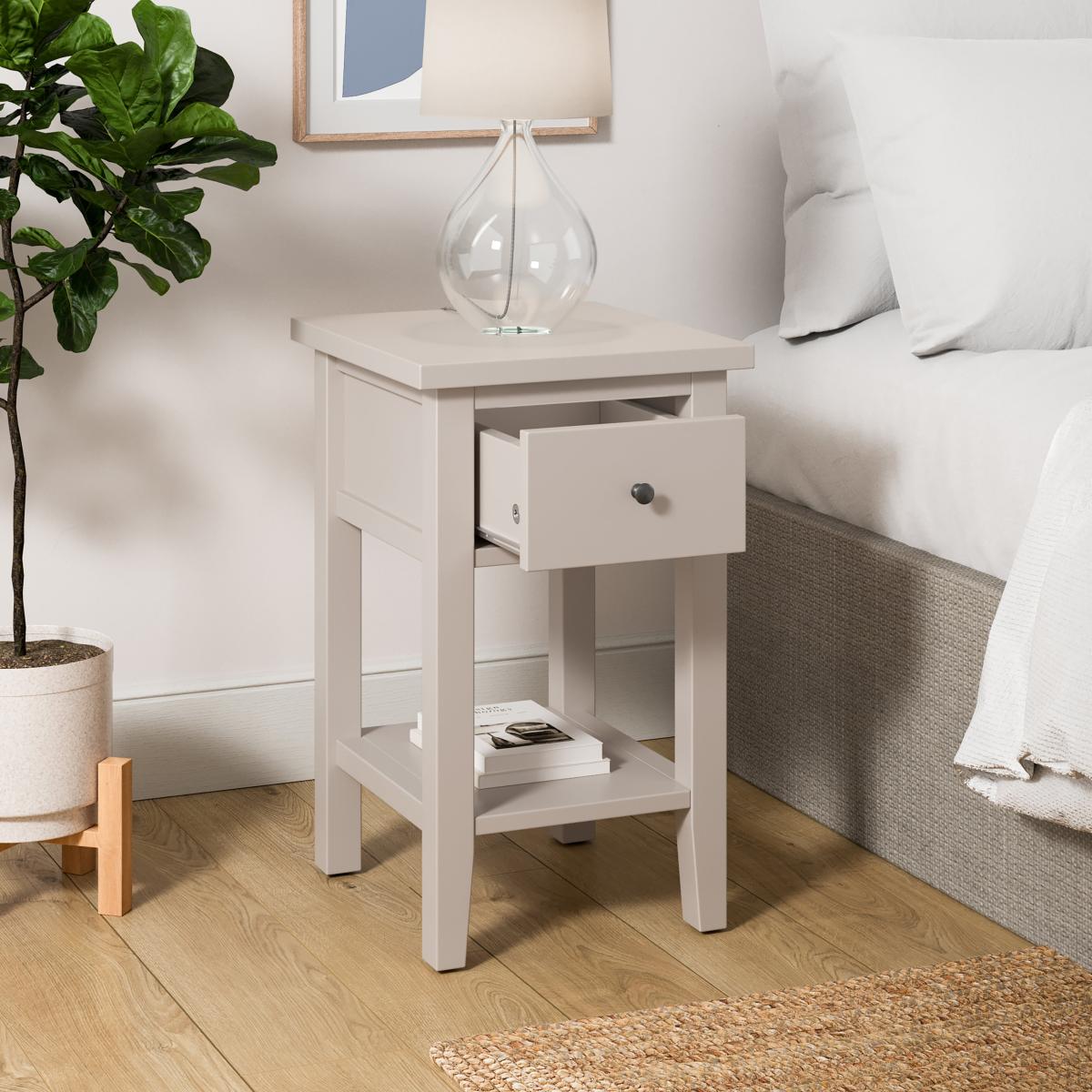 Dunelm Exclusive - Designed and Developed by Dunelm* Painted finish* Compact, slimline size* Black metal handle Perfect as a bedside table or side table in the living room, hallway, or office, the Lynton will suit any space in your home! The slim, compact design works especially well in smaller rooms, guest rooms, and apartments to better utilise space and provide a storage solution. The Scandi-inspired minimal design works with a wide range of décor, so you can be sure it’ll fit right into your existing style. The handy drawer is ideal for bedtime essentials or reading glasses and books, while the shelf space is great for decorating and making this piece your own.