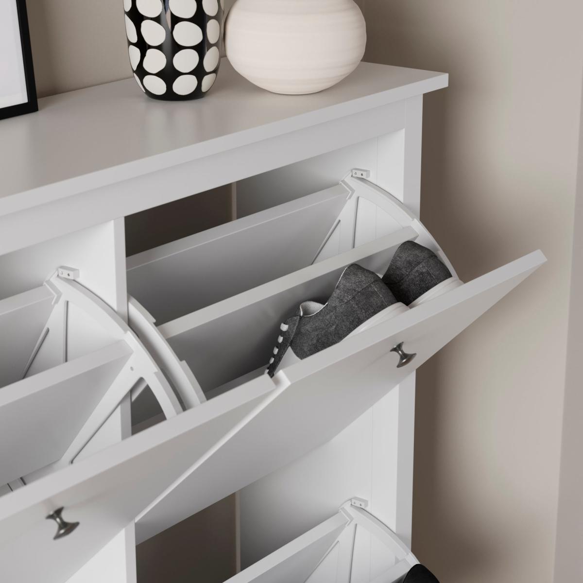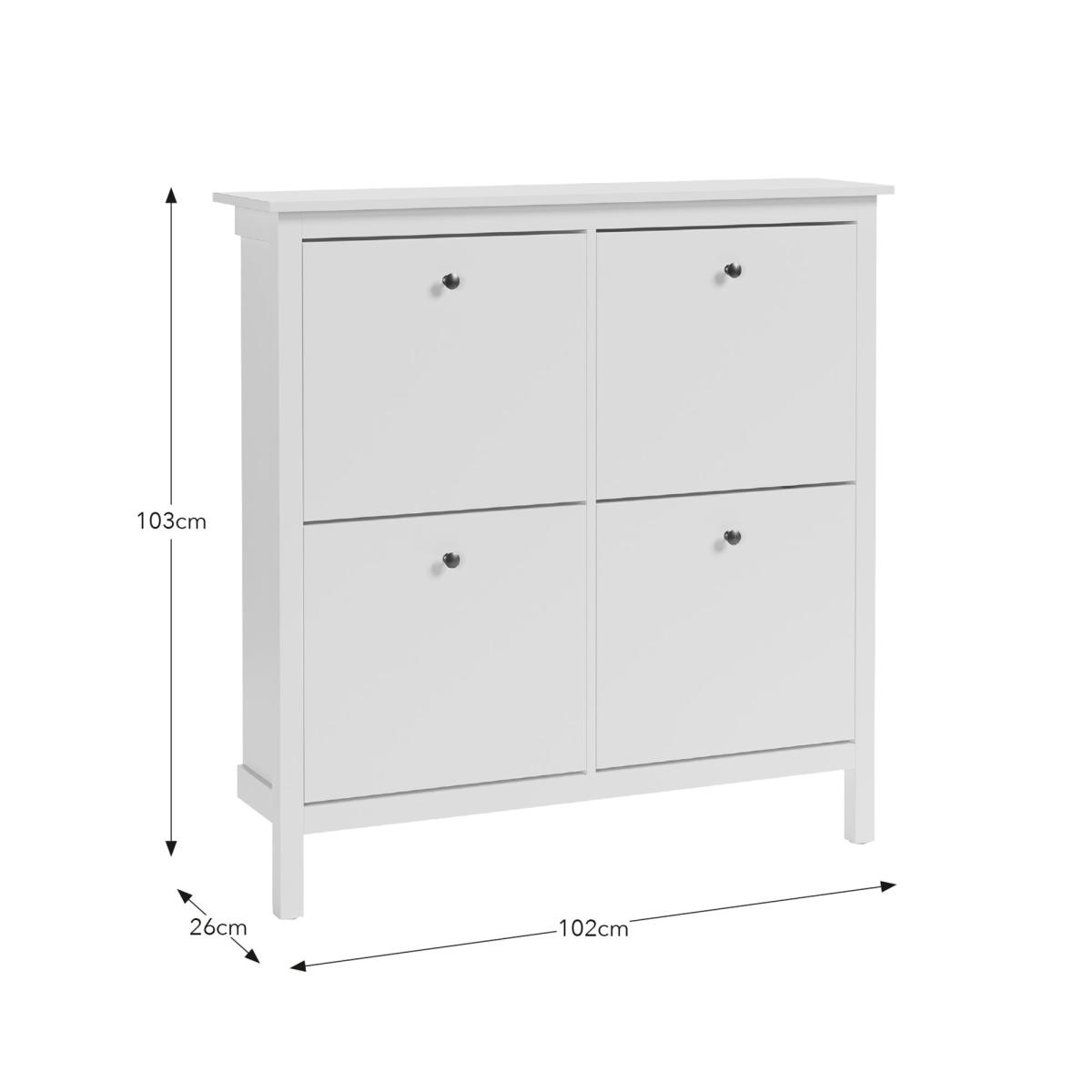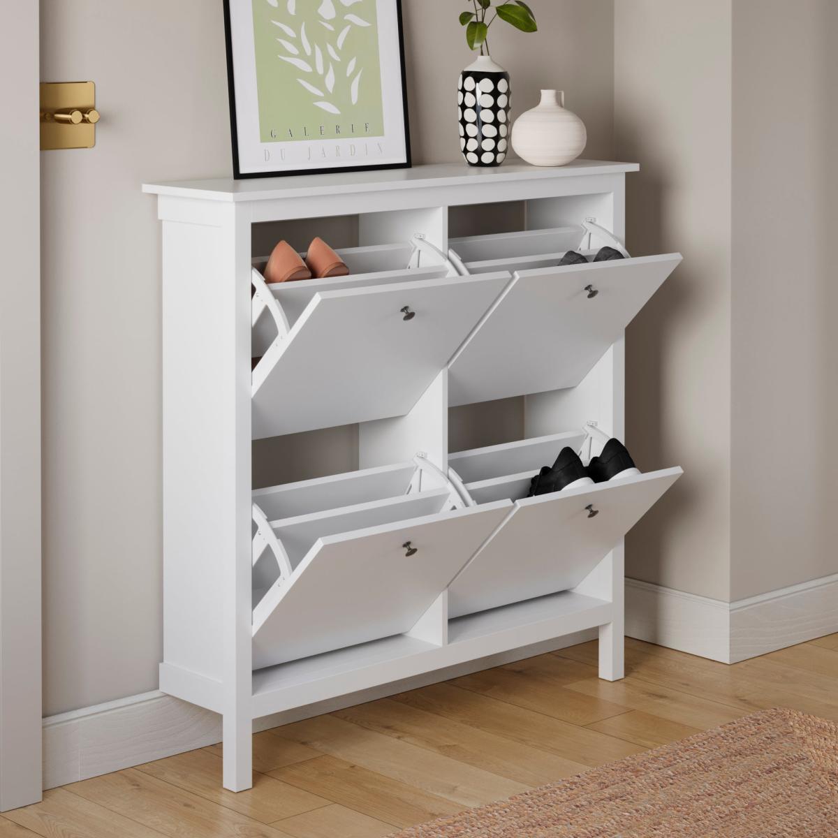 This 4 door shoe drop offers a stylish solution to shoe storage. Available in three beautiful colours (Green, Grey, White), this piece seamlessly fits into your decor. With four doors concealing ample shelving, it keeps your footwear organized and out of sight. Its elegant design, combined with versatile colour options, adds an element of refinement to your home, transforming the shoe storage experience into an art form.