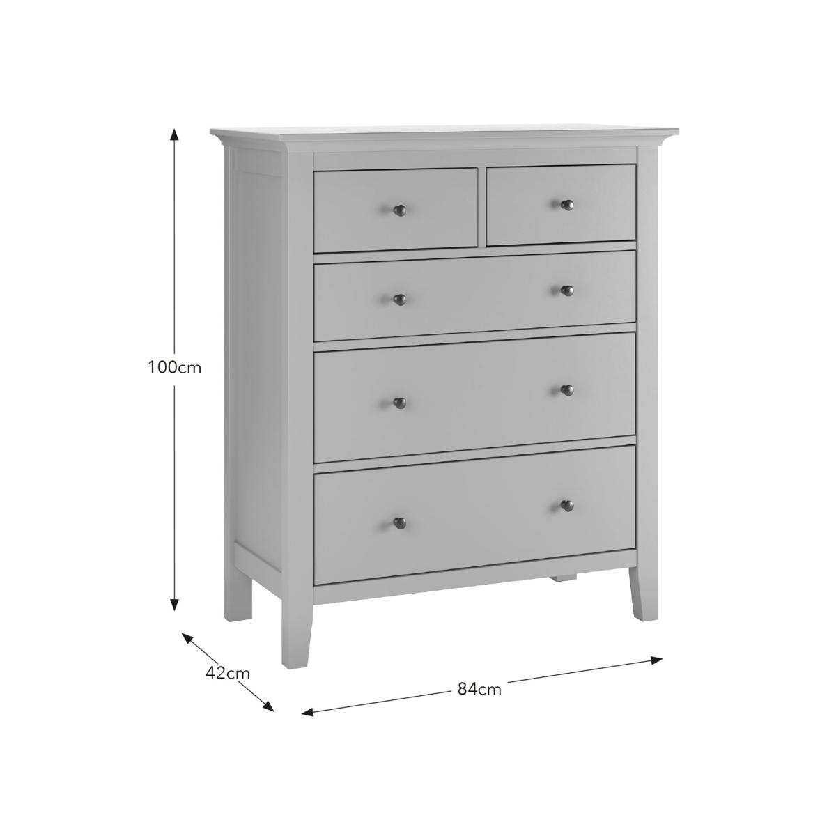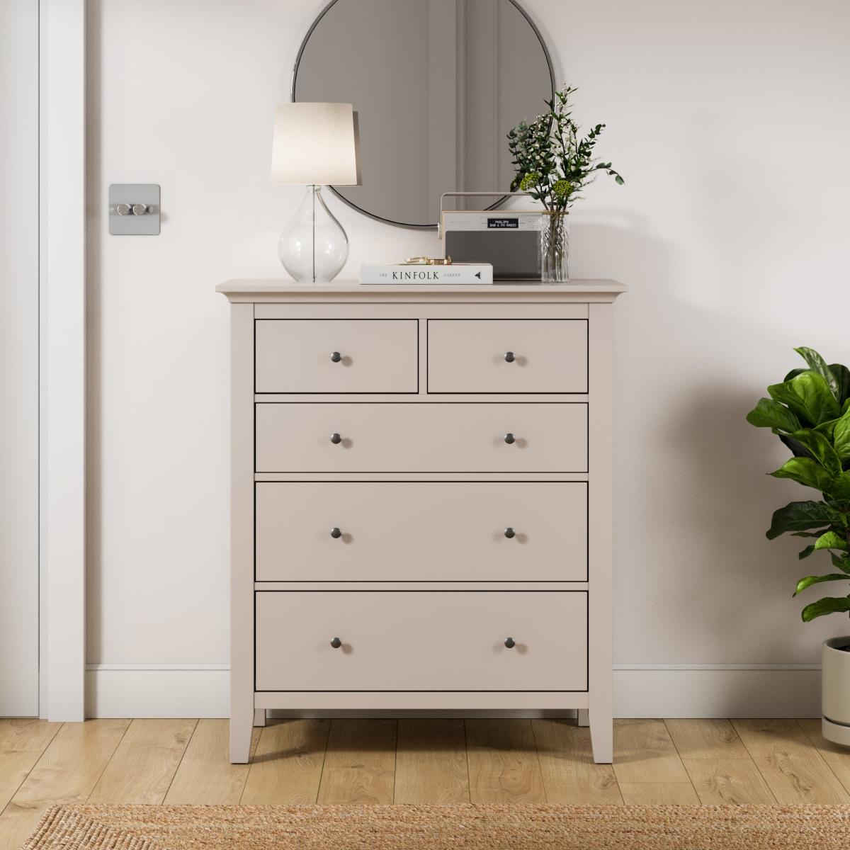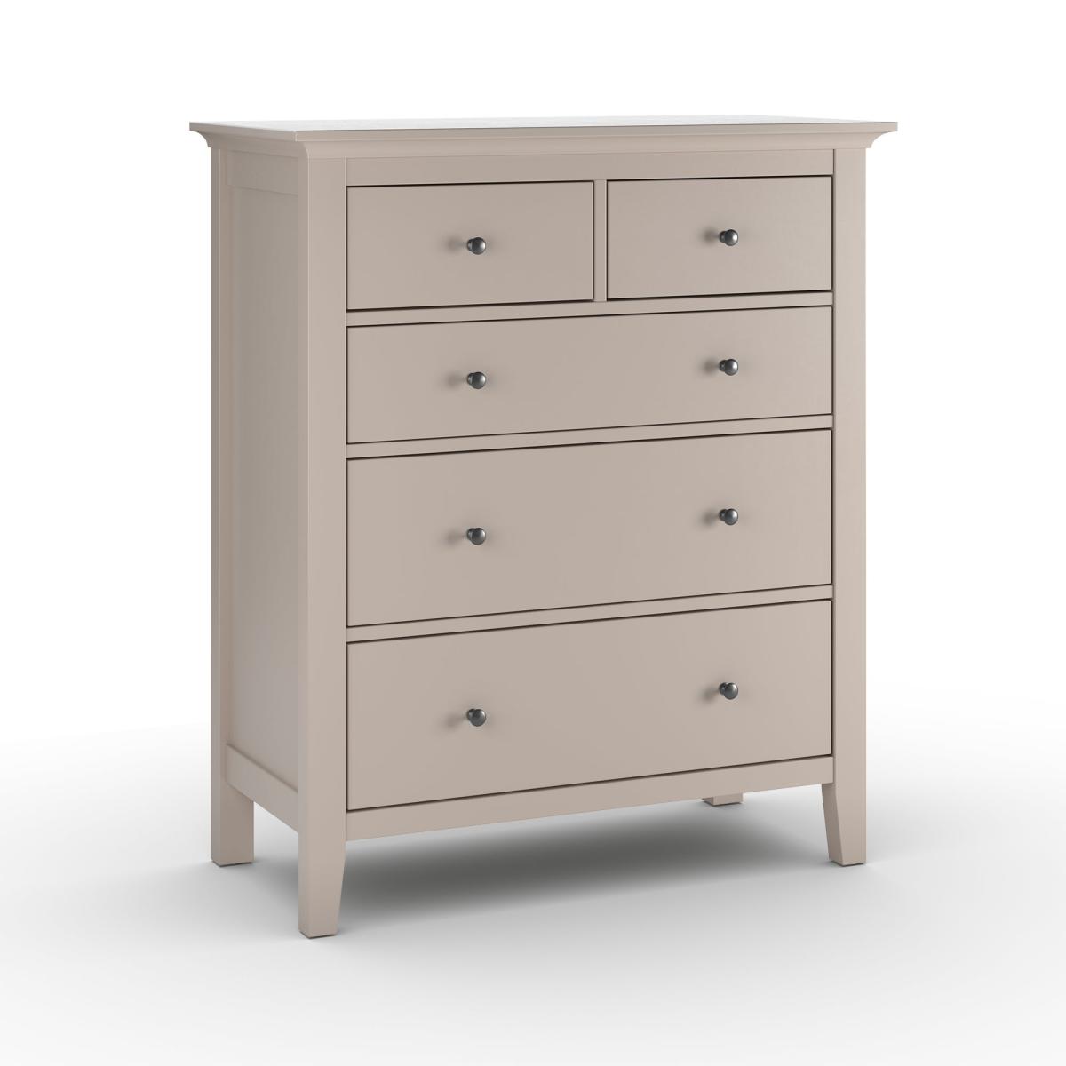 Dunelm Exclusive - Designed and Developed by Dunelm Beautifully crafted in a seamless lacquer coated finish, the Lynton range offers a classic country house styling with a simplistic design. This self-assembly range is sure to add an elegant and a traditional touch to your home. This chest of drawers features three larger drawers and two small drawers, to provide a generous storage space. This chest of drawers comes complete with full extension runners, grey drawer internals and brushed grey metal handles. This Range is also available in Black and Grey.