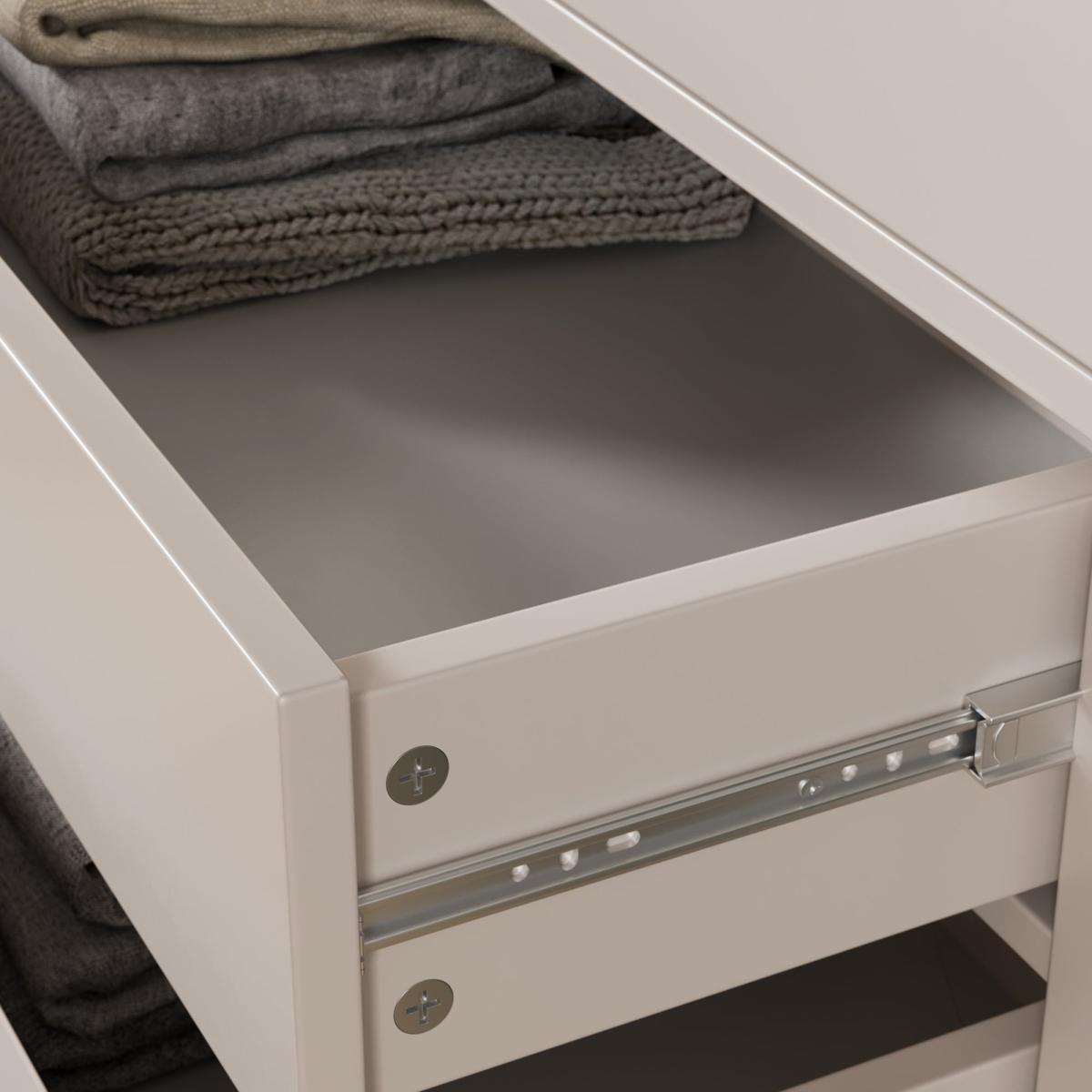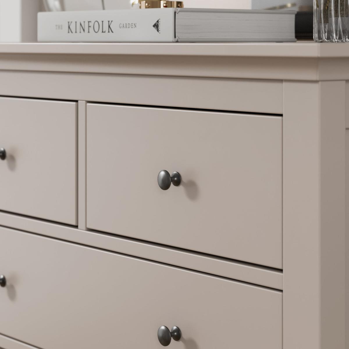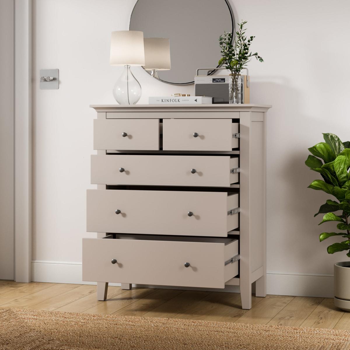 Dunelm Exclusive - Designed and Developed by Dunelm Beautifully crafted in a seamless lacquer coated finish, the Lynton range offers a classic country house styling with a simplistic design. This self-assembly range is sure to add an elegant and a traditional touch to your home. This chest of drawers features three larger drawers and two small drawers, to provide a generous storage space. This chest of drawers comes complete with full extension runners, grey drawer internals and brushed grey metal handles. This Range is also available in Black and Grey.