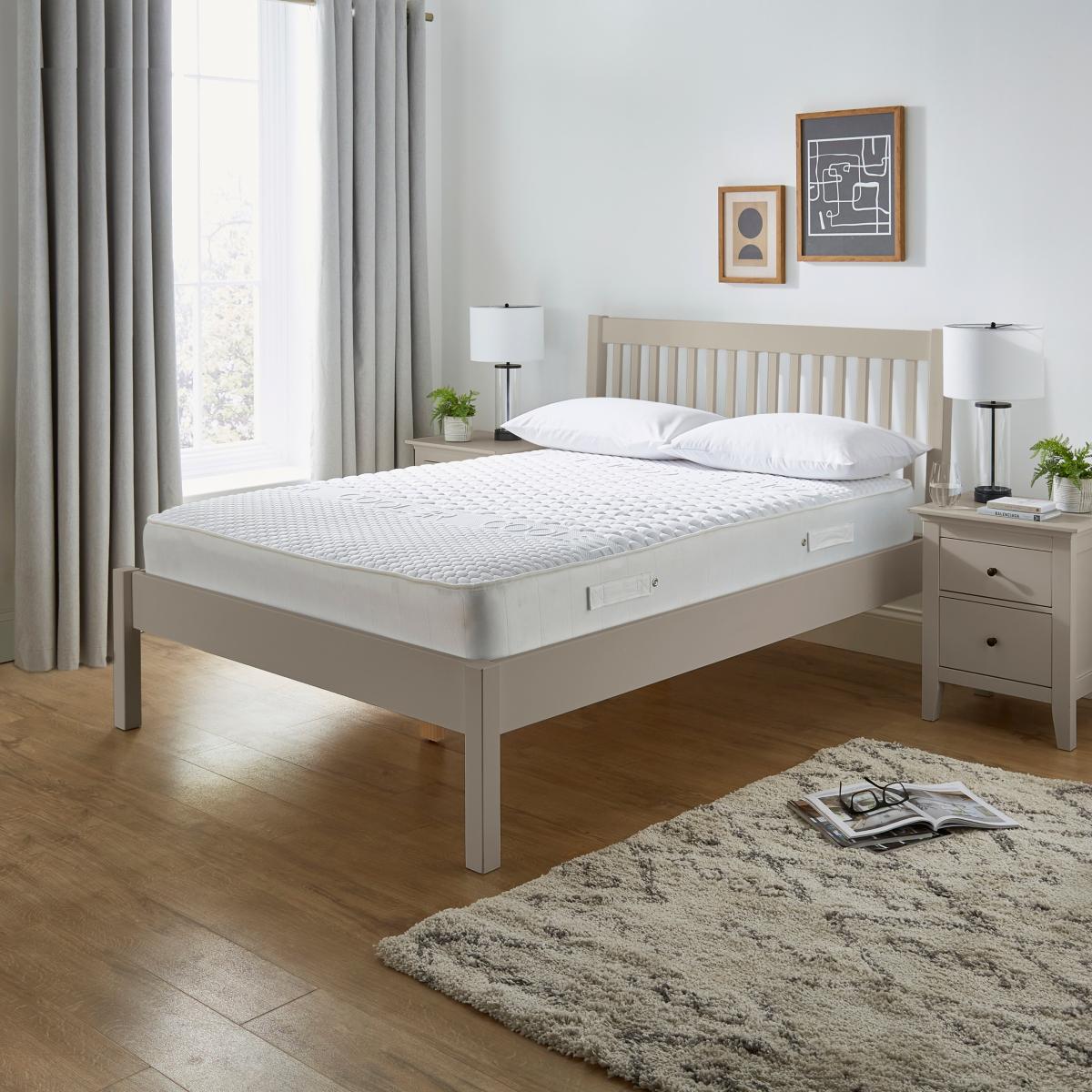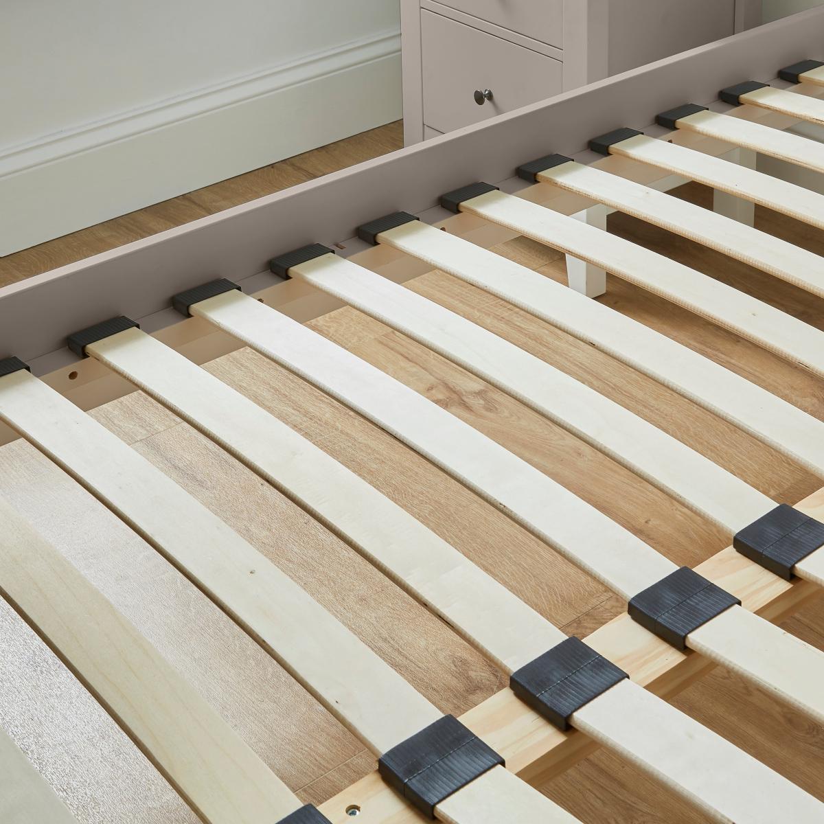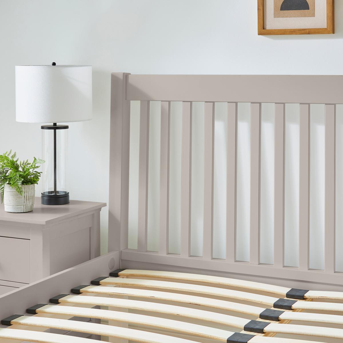 * Beautiful pine construction* Sprung slatted base- for added support and comfort* Stunning and elegant painted headboard in a choice of colours The Lynton Bed has been beautifully crafted from pine. This bed is available in three stylish colourways so you can find the perfect bed for your bedroom. A sprung slatted base provides firmer support and allows air to circulate beneath the mattress. Sturdy and durable, the bed is designed to give you a great night's sleep for years to come.*Please note that the Single bed does not come with a Sprung Slatted base. Please note that slight colour variation and visible grain is possible due to the natural qualities of real wood.