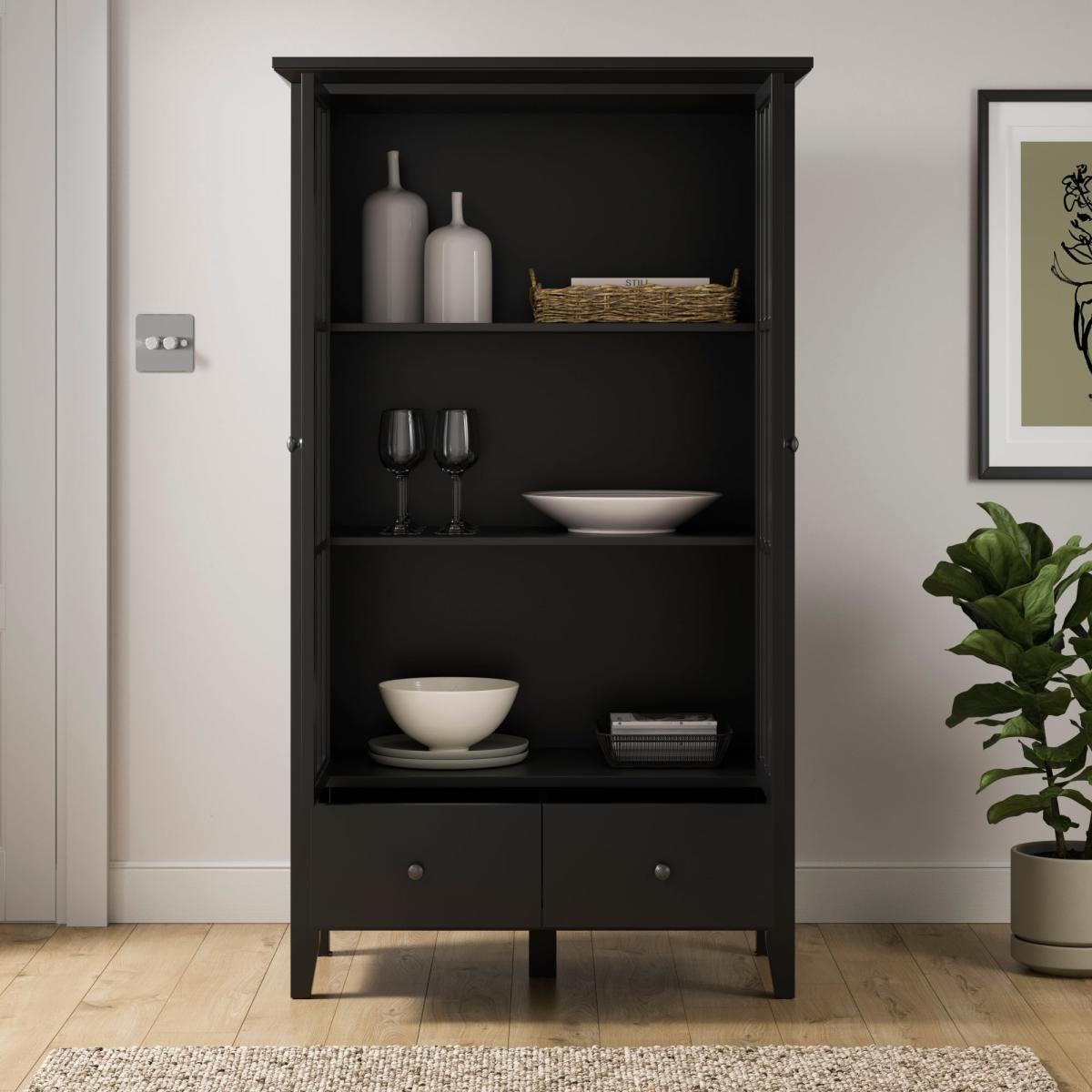 Dunelm Exclusive - Designed and Developed by Dunelm* Glass Display Cabinet* Painted Finish* Soft-close Doors Embodying a seamless blend of contemporary design and functional elegance, this cabinet is a timeless addition to your home decor. The striking black finish exudes a sense of modern sophistication, while the glazed doors offer a touch of refinement and allow you to display your treasured items with style.
