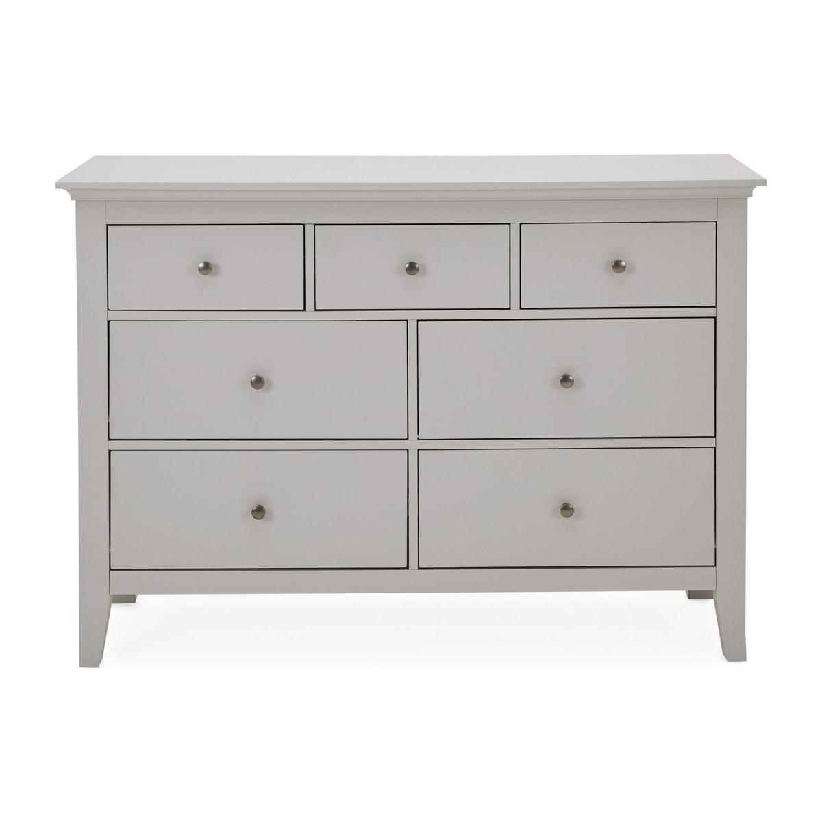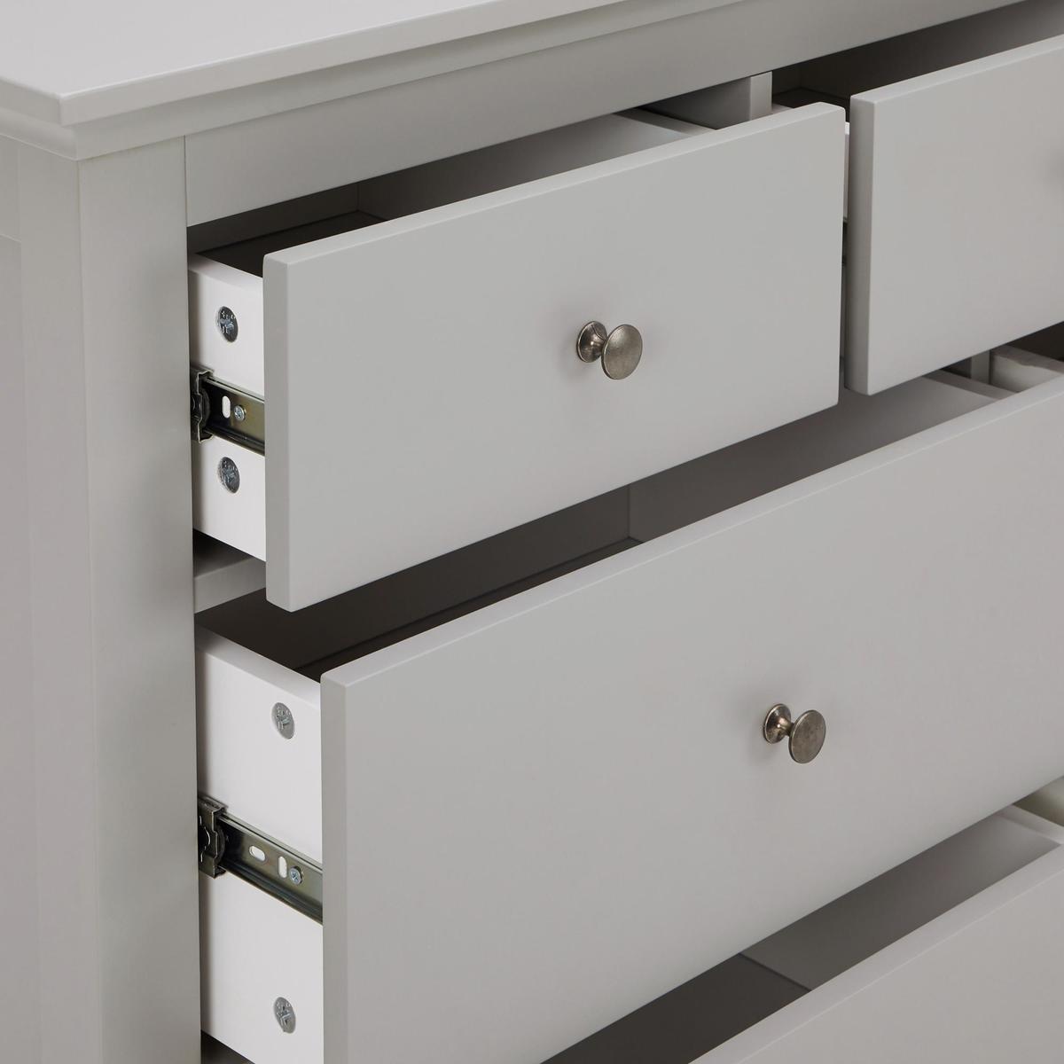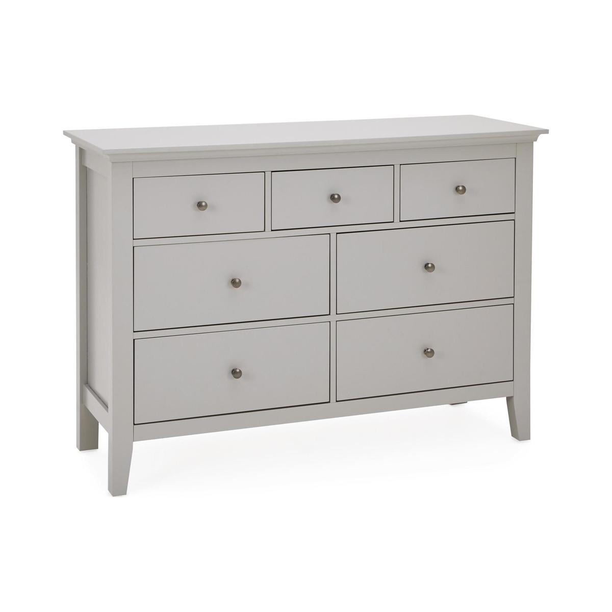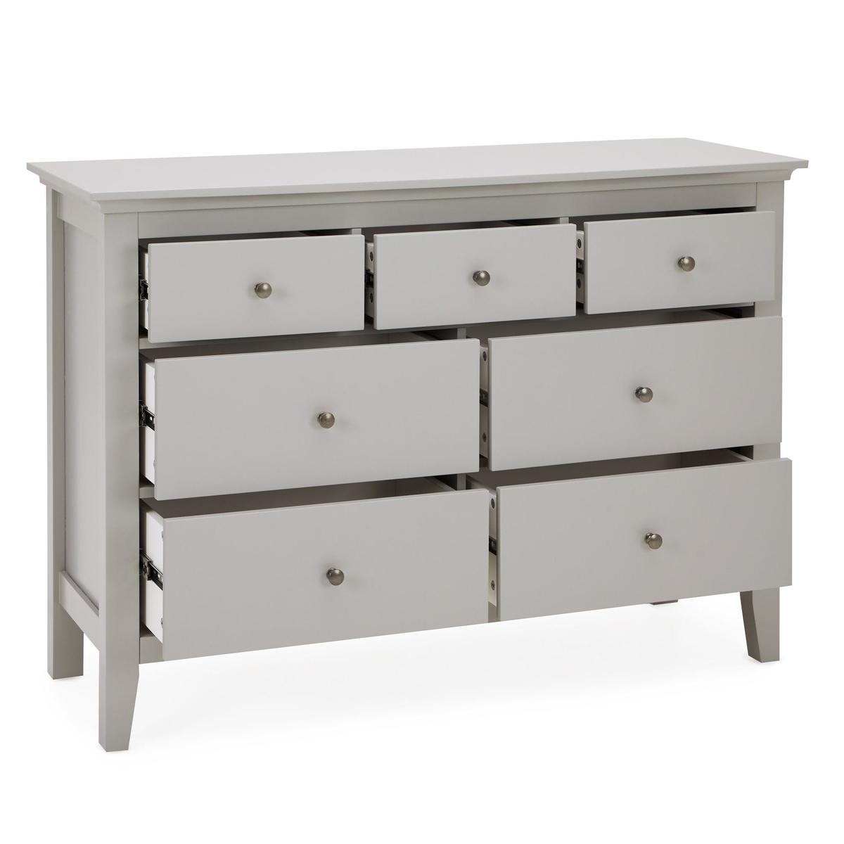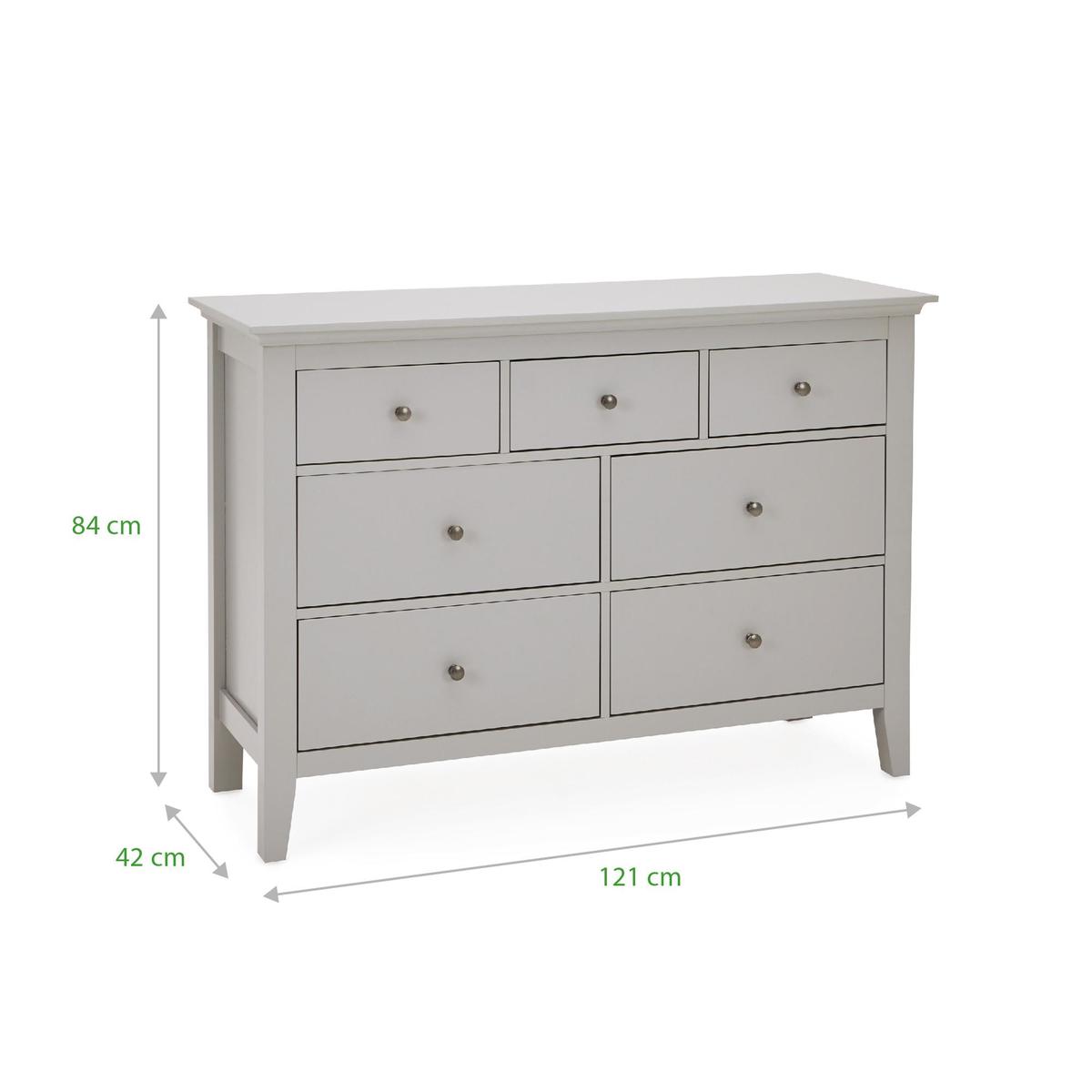 Dunelm Exclusive - Designed and Developed by Dunelm. Beautifully crafted with a seamless lacquer coated finish, the Lynton range offers a classic country house styling with a simplistic design. This self-assembly range is sure to add an elegant and traditional touch to your home. Fashioned in a grey colourway, this chest of drawers features four larger drawers and three small drawers, to provide generous storage space. This chest of drawers comes complete with full extension runners and brushed grey metal handles. Care Instructions: Only clean using a damp cloth and mild detergent, do not use bleach or abrasive cleaners. From time to time check that there are no loose screws on this unit. Remove any spills immediately to avoid staining and dust regularly with a soft lint free cloth or duster. This Range is also available in. White. And. Black.