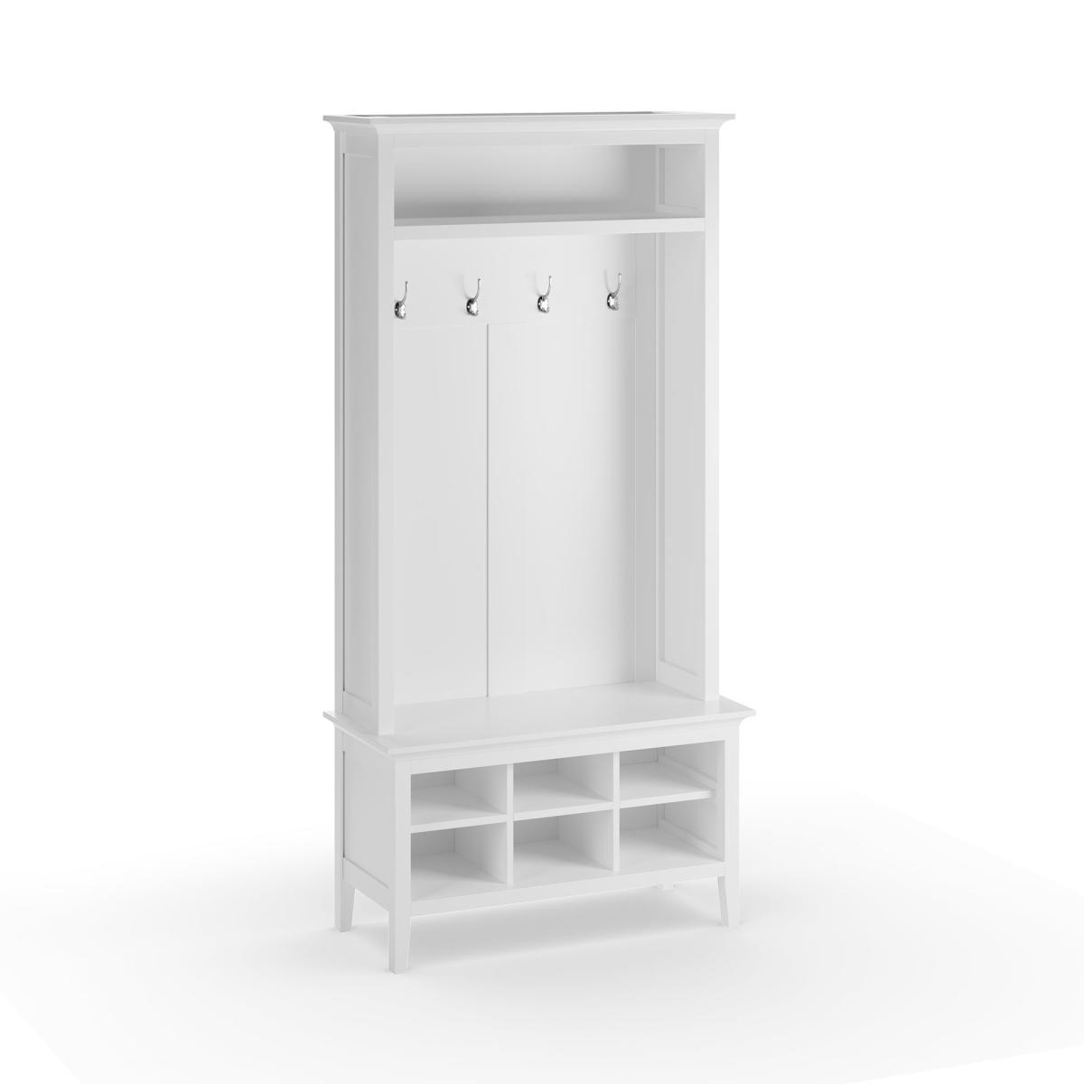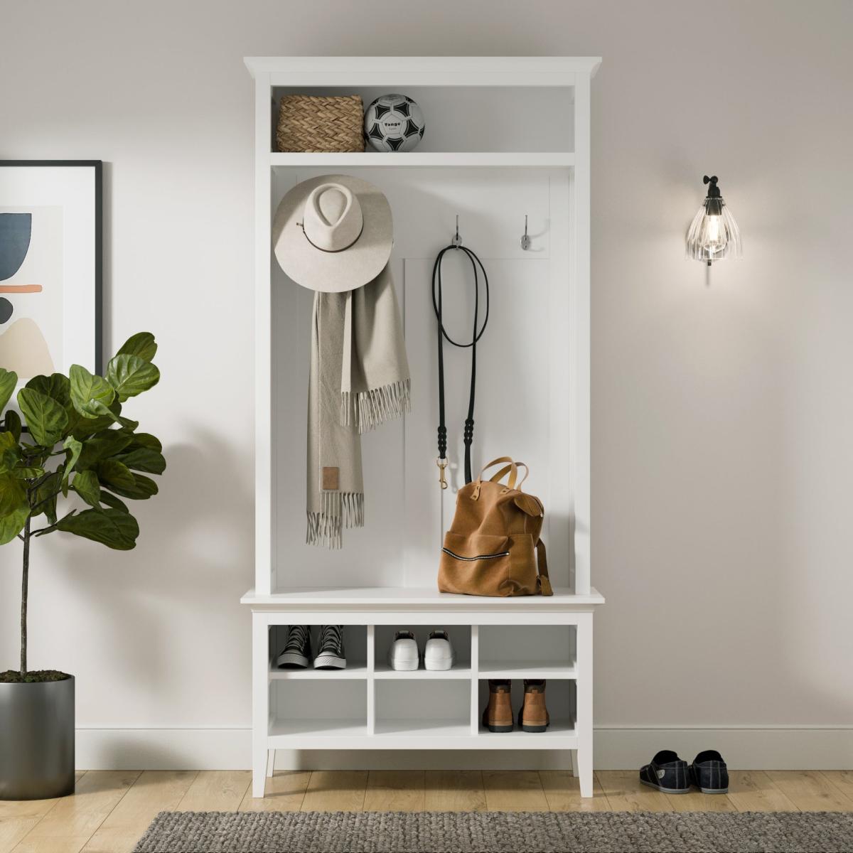 Need a place for your coat and shoes? Look no further. This storage bench has it all: six shoe cabinets, one spacious shelf, four hanging hooks, and a bench to sit on while you're getting ready.