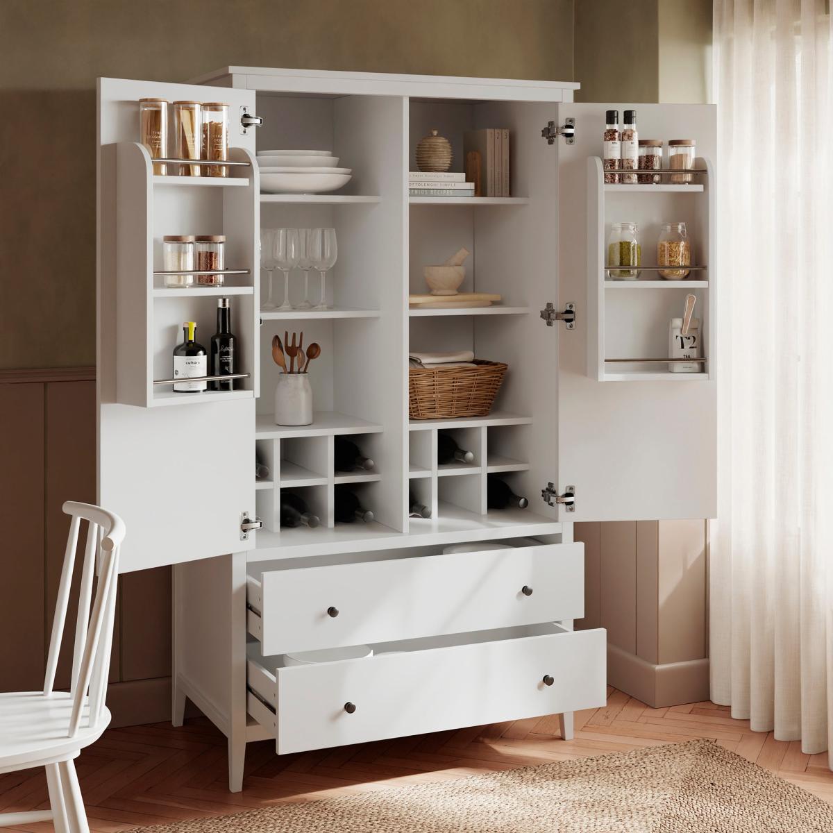 I’m a fan of the Lynton larder unit because its simple Shaker-style detailing and soft cream finish slot straight into a variety of schemes - from Scandi-inspired minimalism to modern farmhouse. Its slim frame and raised legs make it feel less bulky than a full kitchen cabinet but still offer generous storage behind two doors and in the twin drawers below. Styling-wise, treat it as both pantry and display: keep everyday staples in clear glass jars on sturdy wooden shelves inside, then use the top surface for a statement piece - perhaps a ceramic jug of kitchen herbs or a neat stack of cookbooks. In the drawers you can stash table linens or tea towels. Pair with natural textures (wicker baskets, stoneware bowls) and muted accents to maintain a calm, organised look.