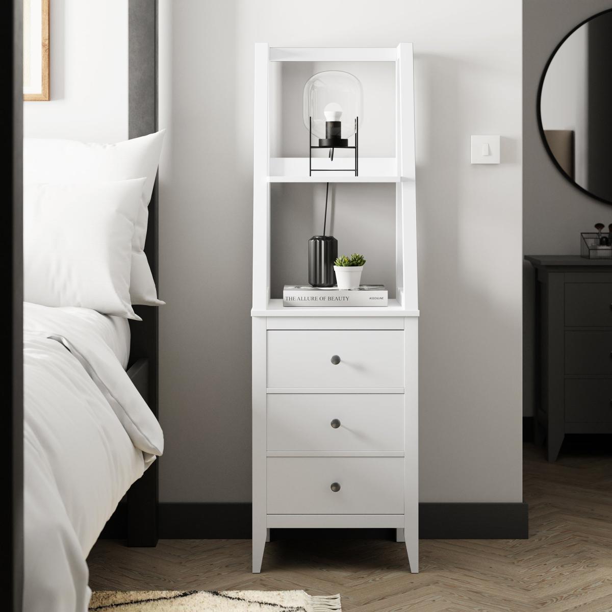 I love this bedside table because of its clean, minimalist design and versatile white finish, which makes it easy to incorporate into a variety of interiors-from Scandi-inspired schemes to coastal or modern spaces. The open shelving offers practical storage for bedside essentials or decorative accessories, while the drawers provide concealed storage for a tidy look. I recommend styling it with a small plant or a statement lamp on top, and keeping the shelves light and uncluttered to enhance its airy feel. It works particularly well in bedrooms with neutral tones or soft colour palettes, but can also contrast beautifully against darker walls for a fresh, contemporary vibe.