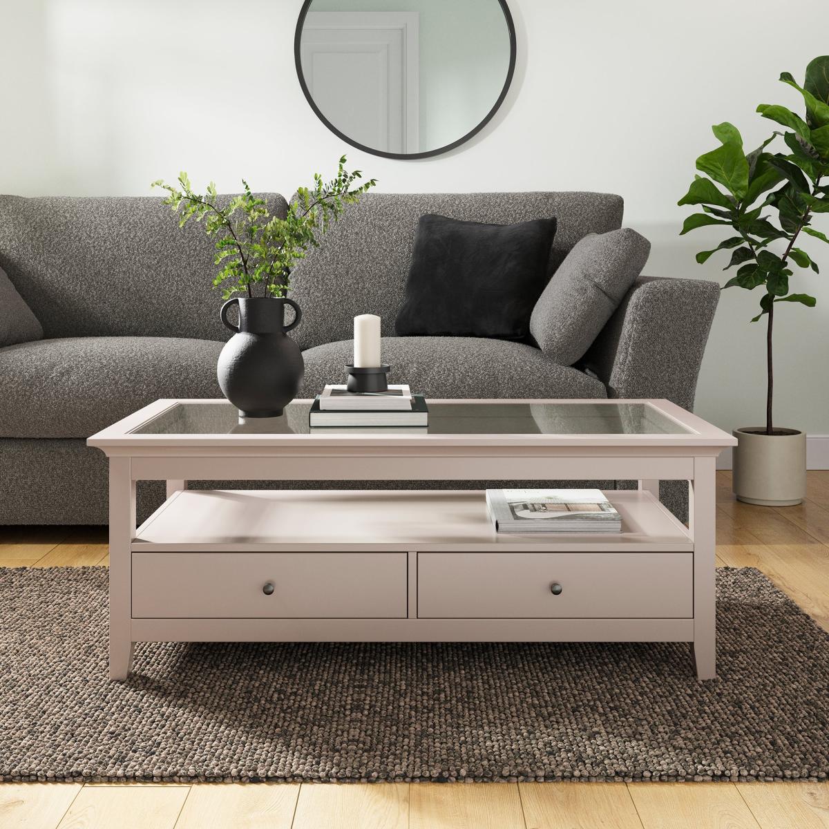 Dunelm Exclusive - Designed and Developed by Dunelm * Painted finish * Metal handles * **Please note**: Your new furniture will arrive flatpacked and requires DIY assembly, but don't worry - assembly is easy! The Lynton Rectangle Coffee Table brings a touch of modern elegance to any living space. Featuring a sleek glass tabletop, it adds an airy, sophisticated feel while keeping your room light and open. Two spacious drawers provide handy storage for remotes, magazines, and everyday essentials, keeping your space neat and organised.