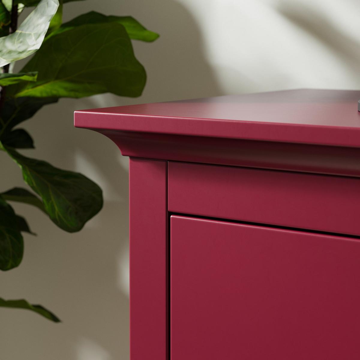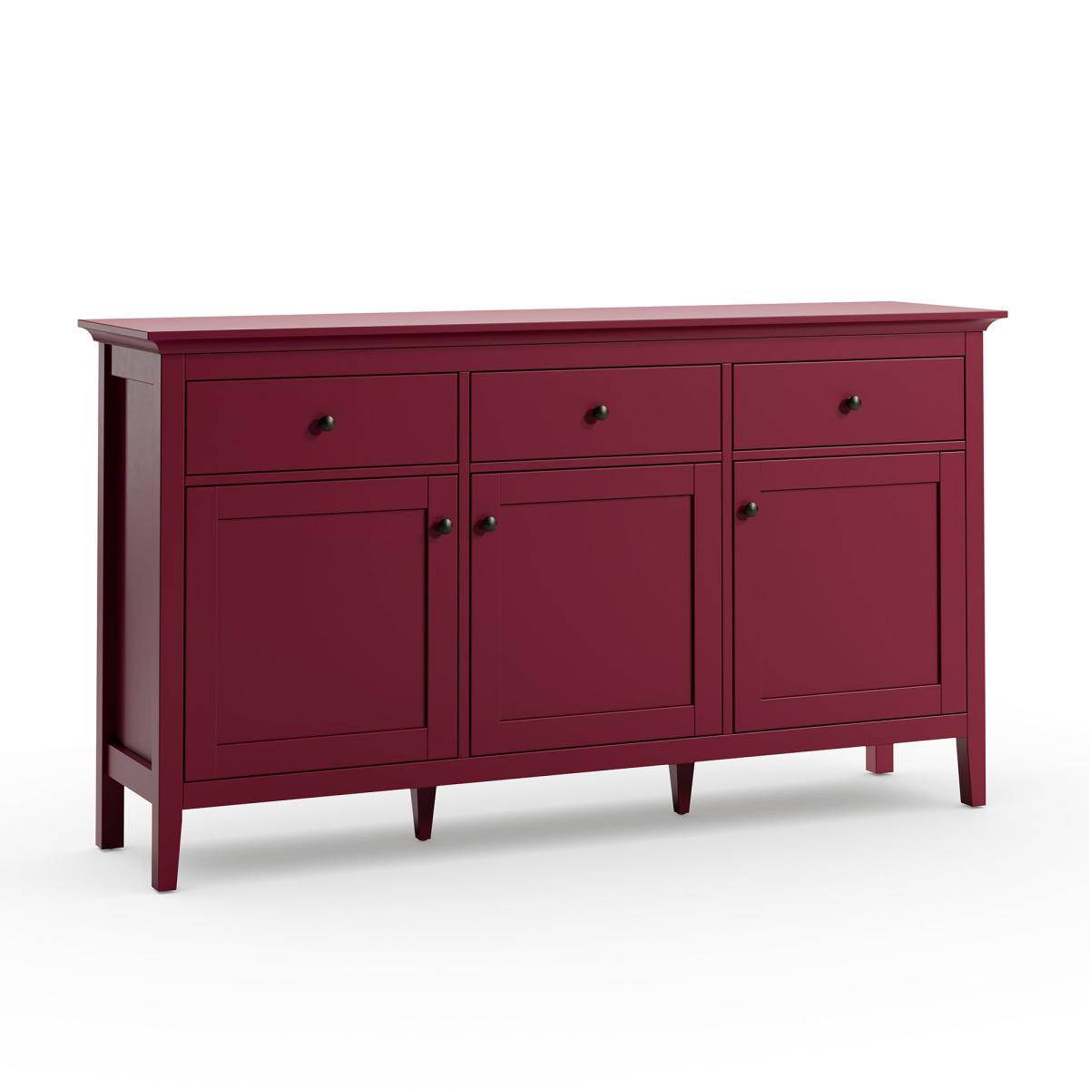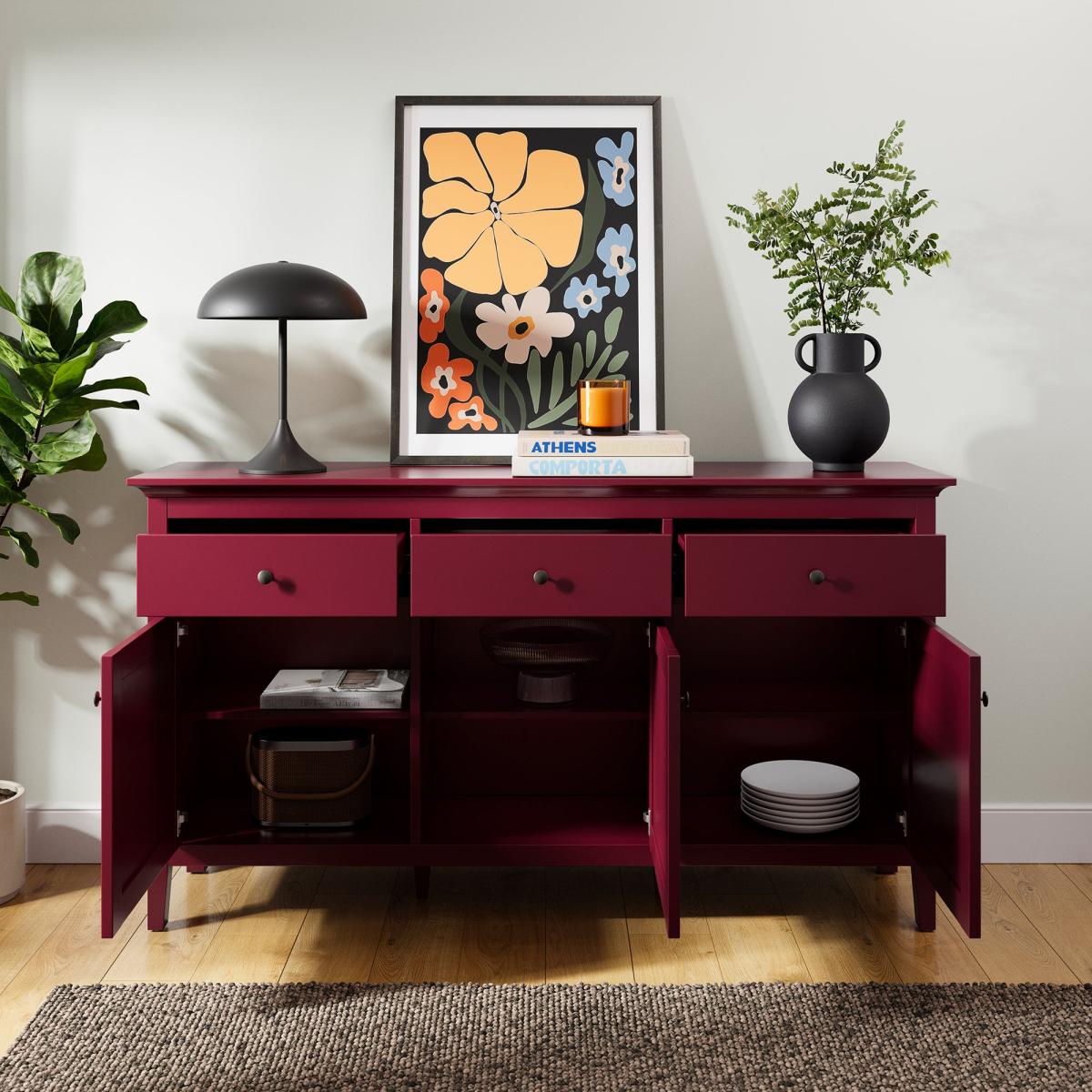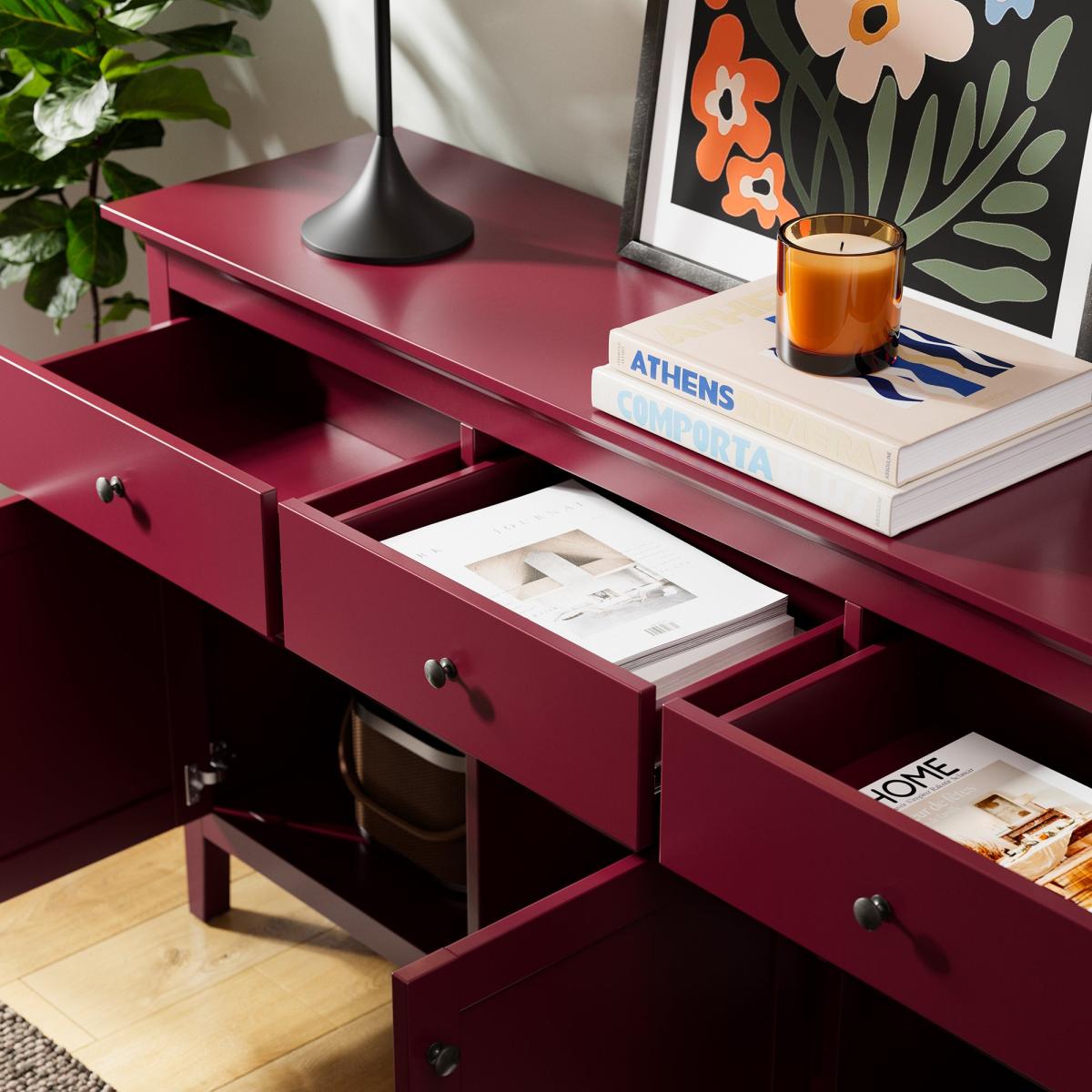 I’m a fan of this wide sideboard for its clean lines and rich burgundy finish - it injects warmth without feeling bulky. It works equally well in a modern flat or a more traditional setting, especially when paired with muted walls or natural wood. For styling, keep the top simple: a couple of ceramic vases, a low-profile lamp and a small stack of art books. Inside, use matching baskets or trays to keep cutlery and linens organised, then let a sculptural plant sit beside it to balance the structure.