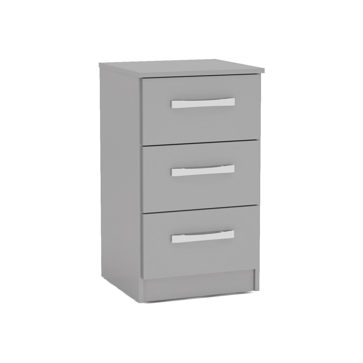 Modern and sleek, the Lynx 3 drawer bedside combines a high-gloss finish with bold silver detailing to make any space feel contemporary. Constructed from MDP (multiple density particleboard), this high-quality bedside is available in a choice of four high-gloss lacquer colour options white grey, black, white, or black white, or alternatively there are an additional colour option combining high-gloss lacquered panels with walnut paper foil walnut black. The top panel of this bedside can support up to 5 kg of weight and each drawer can support up to 2.5 kg.