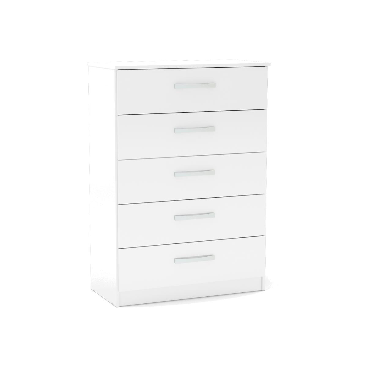 Modern and sleek, the Lynx 5 drawer chest combines a high-gloss finish with bold silver detailing to make any space feel contemporary. Constructed from MDP (multiple density particleboard), this high-quality bedside is available in a choice of four high-gloss lacquer colour options white grey, black, white, or black amp white, or alternatively there are an additional colour option combining high-gloss lacquered panels with walnut paper foil walnut black. The top panel of this chest can support up to 8 kg of weight and each drawer can support up to 5 kg.