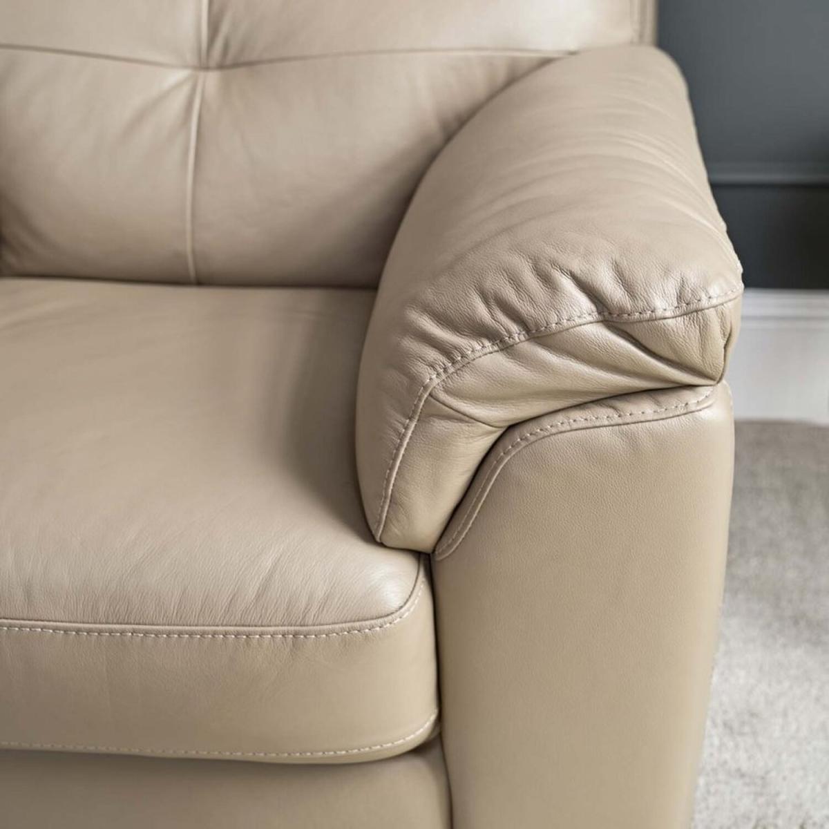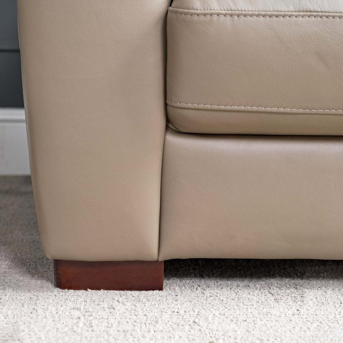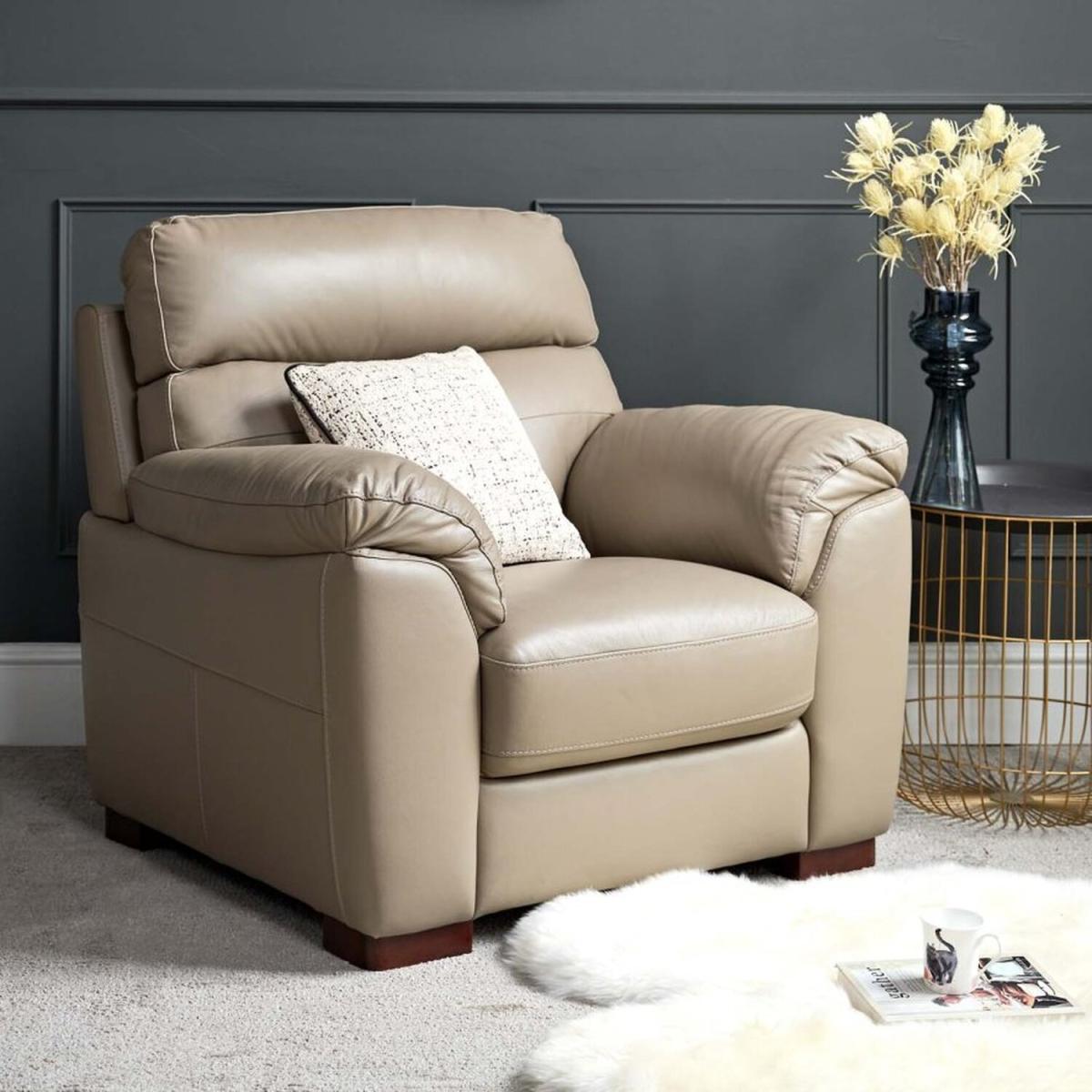 The Lyon Armchair is the best of traditional style. With beige 'mocha' coloured faux leather upholstery and block feet, this classic design will bring sophistication and class to any living room. This armchair is a super comfortable individual seat, with its sleek neutral tone making it the perfect fit for any lounge area.