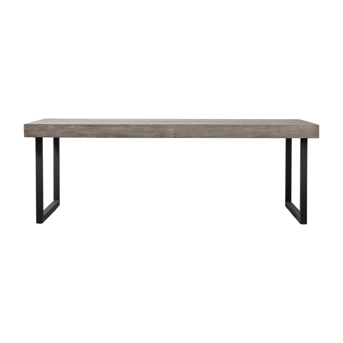 A beautiful chunky wood table top sits upon metal legs to give this table its modern look. Style the table with chairs of your choice to bring a contemporary look into your outdoor space. The weather resistant teakwood and powder coated iron composition allows the table to be suitable for outdoor use.