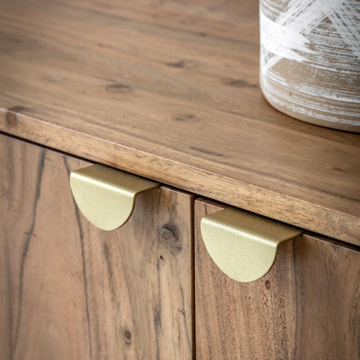 I’ve been reaching for the Lyon for its warm grain and clean lines - it sits comfortably in both Scandi-inspired and mid-century modern schemes. The solid acacia finish adds natural texture without overpowering a room, and the slim brass handles give just enough polish to lift a neutral palette. Styling it is straightforward: keep surfaces uncluttered with a pair of low-profile vases or a sculptural lamp, then layer in a mix of books and a trailing plant to soften the straight edges. Inside, use matching baskets or fabric boxes to corral cables, linen napkins or board games, making it as practical as it is pleasing.