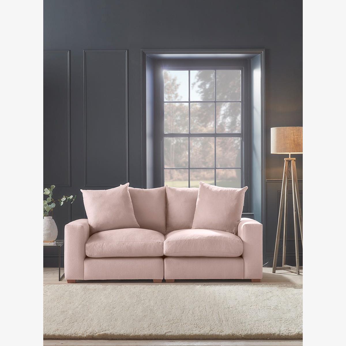 Our most extensive made to order range, the Lyon collection has something for everyone, with combinations to suit all homes, from open plan contemporary living spaces to cosy cottages and bijoux apartments. Modular in style, the Lyon range has bold and beautiful boxy lines with pillowy cushions and scatterback styling to cradle and support as you sit, recline or lounge. The Lyon two seater sofa offers luxurious comfort and room to spread out for couples and small families. The Lyon range includes a corner sofa, chaise sofa, three seater sofa, two seater sofa, loveseat and ottoman. Pictured here in our Soft Rose cotton linen, our Lyon collection can be upholstered in a choice of 34 distinctive shades and six fabrics to suit your style. Read our Upholstery FAQs View our full Upholstery Terms and Conditions