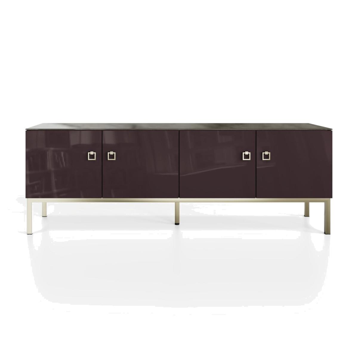 Introducing the LYRA four door TV stand or media cabinet versatile, elegant, and intelligent. The glossy fully painted finish and glass top gives as a sleek, superior look. LYRA has pendant handles and brushed metallic feet in a subtle champagne colour, add a touch of unique style to this versatile storage cabinet. Open it up, and there is ample storage space with a statement midnight purple finish, courtesy of Frank Olsen. That is not all, the cabinet has SMART integration, so you can control the LED lights with an app or just tell your SMART speaker what to do. Putting it together is easy, thanks to the quick click together system, for a solid seamless finish. This TV stand is part of the LYRA collection, including a one drawer lamp table, two door sideboard, large sideboard, and console.