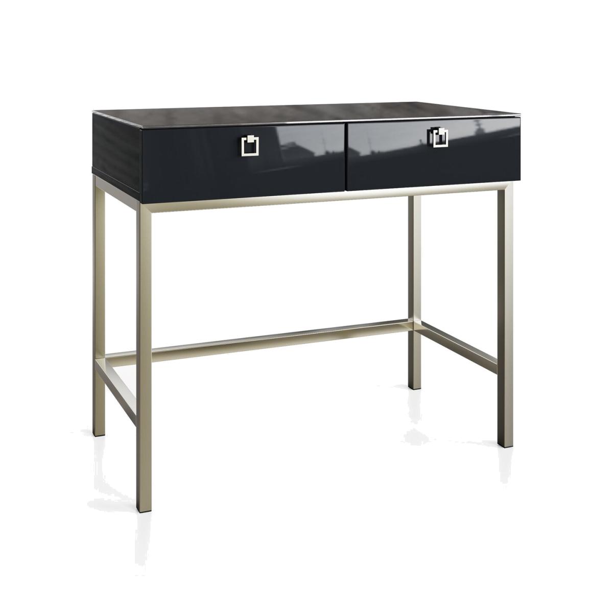 Introducing the LYRA two drawer console or hallway table, a perfect blend of sophistication and SMART functionality. The sleek, high gloss painted exterior, featuring a colour matched tempered glass top for a seamless, superior finish. LYRA has distinctive pendant handles and matching brushed metallic feet in a subtle champagne colour add a touch of uniqueness to this contemporary console. The console has two drawers which are both beautifully finished with Frank Olsen signature midnight purple interior. The LYRA console table seamlessly integrates SMART technology, allowing effortless control of LED lights through an app or voice commands with your SMART speaker. A discreet wireless charging point to power up your phone merges technology with style. Assembly is a breeze with the revolutionary click together system, ensuring a flawless finish. As part of the LYRA collection, this console table complements the range, which includes a four door media cabinet, two door sideboard, large sideboard, and lamp table.