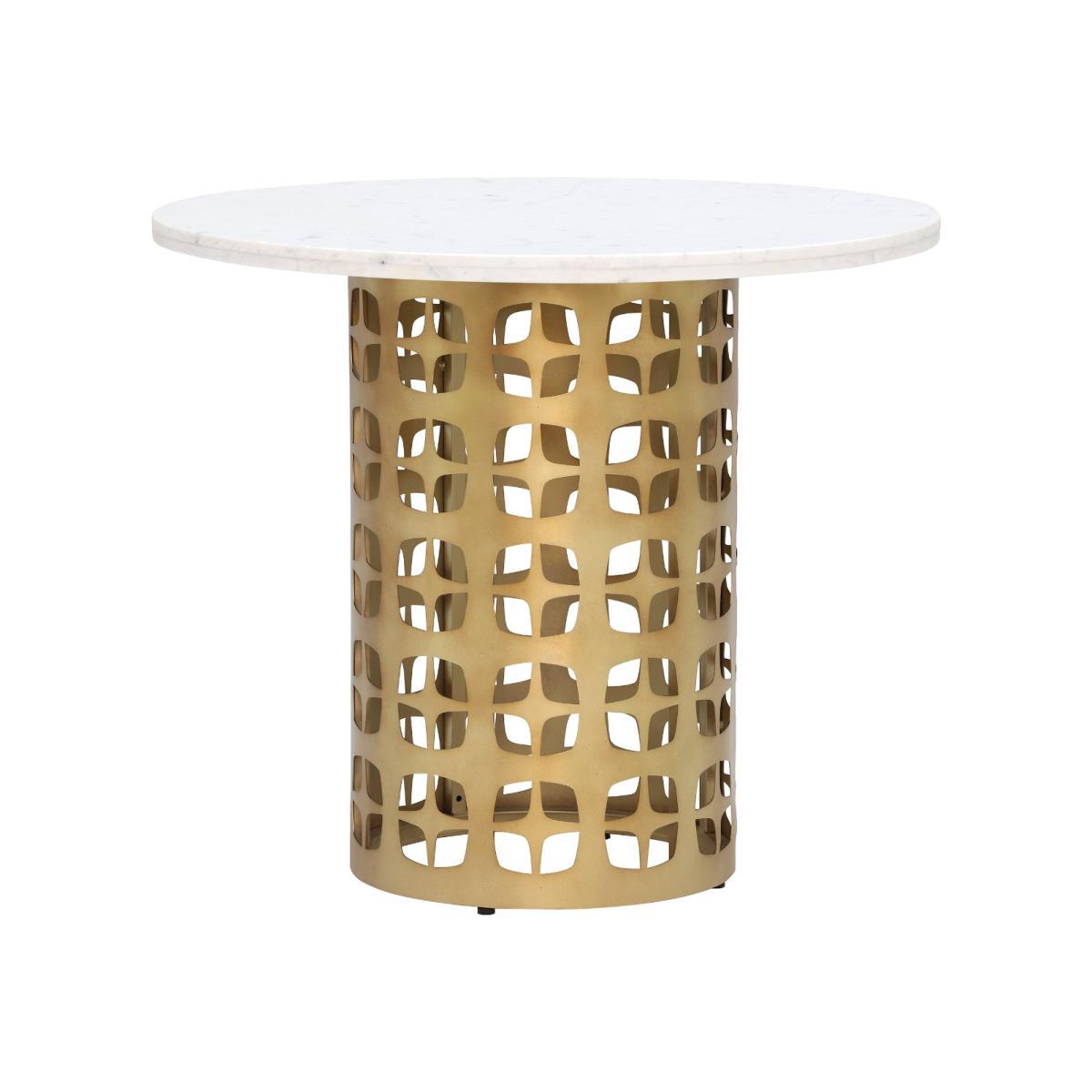 A truly unique dining table with a cylinder-shaped base featuring metallic cut out detailing. The lyra Dining Table will add depth and texture to your space with its mix of materials and busy design. Lyra has a beautiful contemporary white marble top that compliments the antique brass base, creating a modern industrial dining room feature that will have family and friends talking. Providing plenty of practicality, the Lyra Dining Table is an accommodating option beca