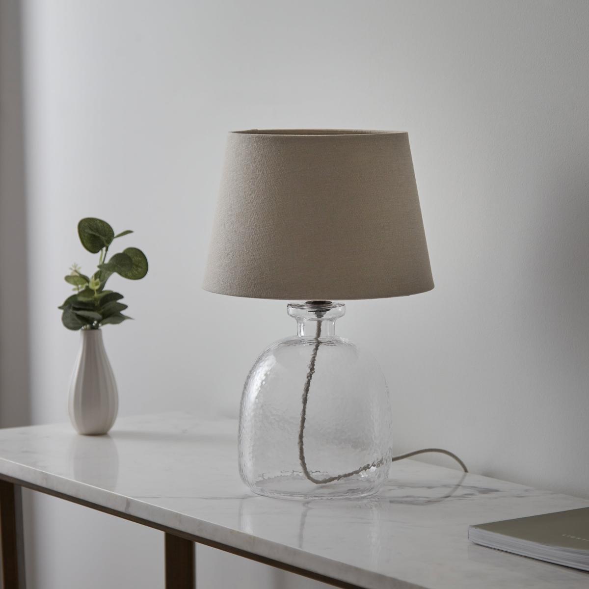 The ideal addition to relaxed classic and traditional interiors. This glass table light features a textured 'hammered' effect with matt black metal details, natural fabric flex and a grey fabric shade.