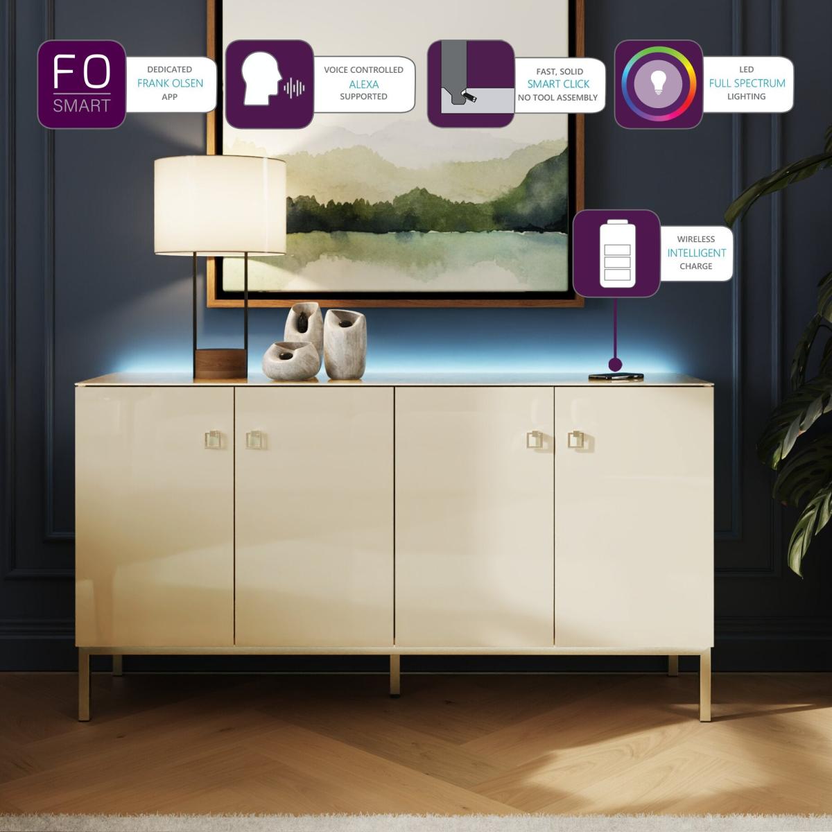 * SMART technology* High Gloss finish* Glass top* Pendant handles* Metallic feet This four-door sideboard combines elegance with smart functionality, featuring a high gloss painted exterior and a sleek glass top. The pendant handles and brushed metallic feet in a subtle champagne colour enhance its unique style. This sideboard also includes smart features like app-controlled LED lights and discreet wireless charging for your phone. Assembly is easy with the click-together system, ensuring a flawless finish. As part of the LYRA collection, this piece complements other items like the lamp table and media cabinet. Delivery is limited to mainland UK, excluding remote regions in Scotland and the Scottish Highlands, with no services available to Northern Ireland, Ireland, Isle of Man, Channel Islands, and similar overseas destinations.