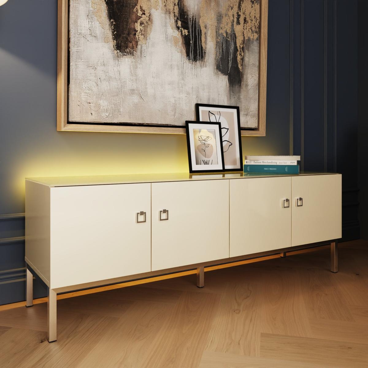 * SMART technology* High Gloss finish* Glass top* Pendant handles* Metallic feet This TV Unit is an elegant and intelligent piece for your home. The glossy finish and matching glass top create a sleek, superior look, while the pendant handles and brushed metallic feet in a subtle champagne colour add a unique touch of style. This cabinet isn't just stylish; it features SMART integration, allowing you to control the LED lights with an app or voice commands via your SMART speaker. Assembly is a breeze with the quick click-together system, ensuring a seamless finish. Part of the LYRA collection, this cabinet pairs perfectly with the one-drawer lamp table, two-door sideboard, large sideboard, and console. Delivery is limited to mainland UK, excluding remote regions in Scotland and the Scottish Highlands, with no services available to Northern Ireland, Ireland, Isle of Man, Channel Islands, and similar overseas destinations.