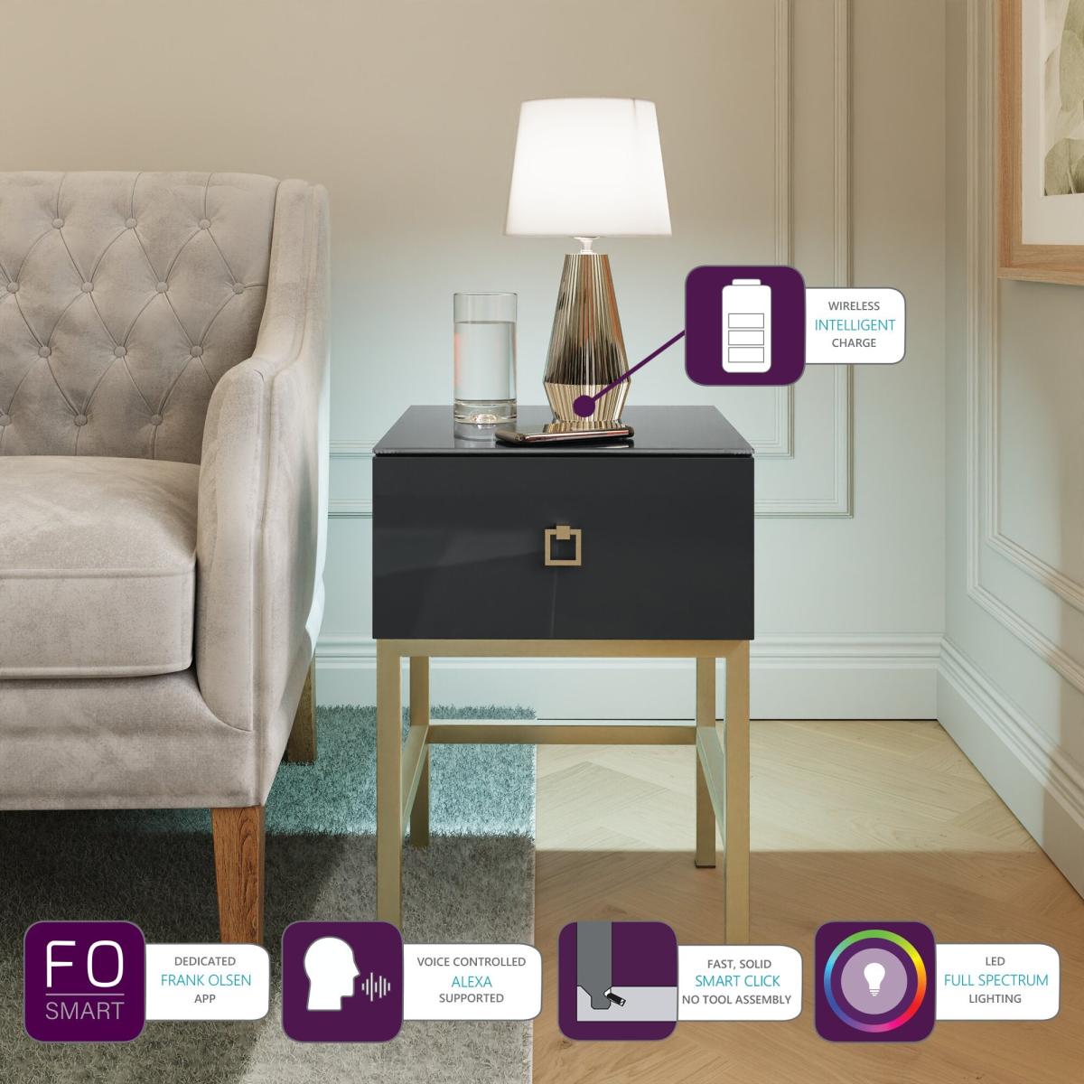 * SMART technology* High Gloss finish* Glass top* Pendant handles* Metallic feet This side table features a blend of chic simplicity and SMART features. The high-gloss paint finish, paired with a seamlessly matched glass top, offers a sleek and superior look. Unique pendant handles and brushed metallic feet in a subtle champagne shade add a touch of elegance, making this versatile side table a standout addition to any space. This lamp table includes SMART integration. You can easily control the integrated LED lights through an app or with voice commands via your SMART speaker. Plus, a discreet wireless charging point allows you to effortlessly power up your phone without the need for cables. Delivery is limited to mainland UK, excluding remote regions in Scotland and the Scottish Highlands, with no services available to Northern Ireland, Ireland, Isle of Man, Channel Islands, and similar overseas destinations.