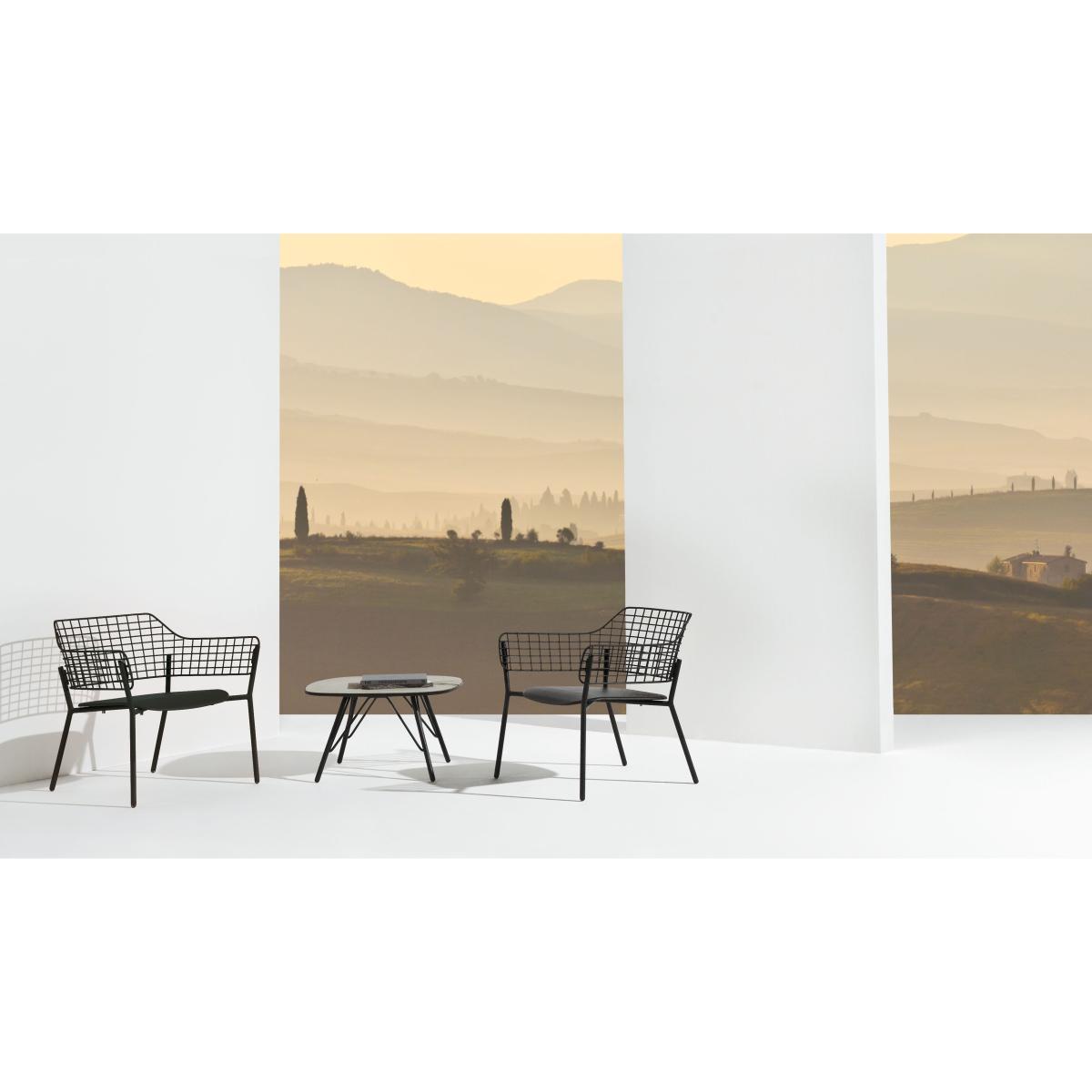 A graphic and contemporary style for this elegant armchair in varnished aluminum and stainless steel. From the Lyze collection, this chair plays the contrasts: a full seat with soft curves is accompanied by a checkered file which allows the light to pass.