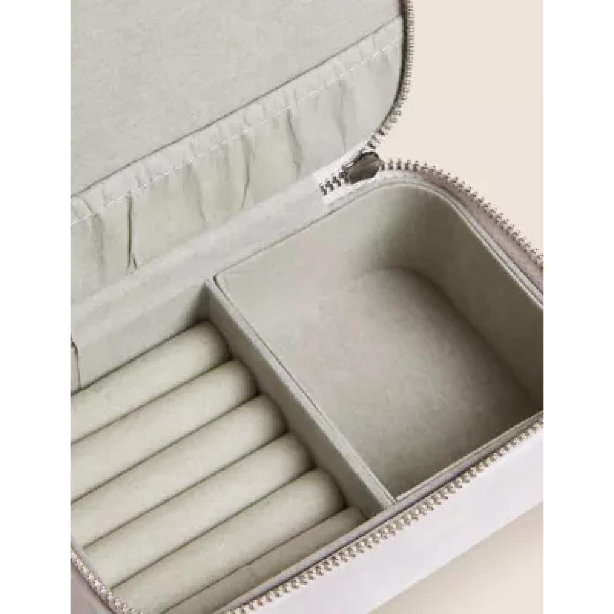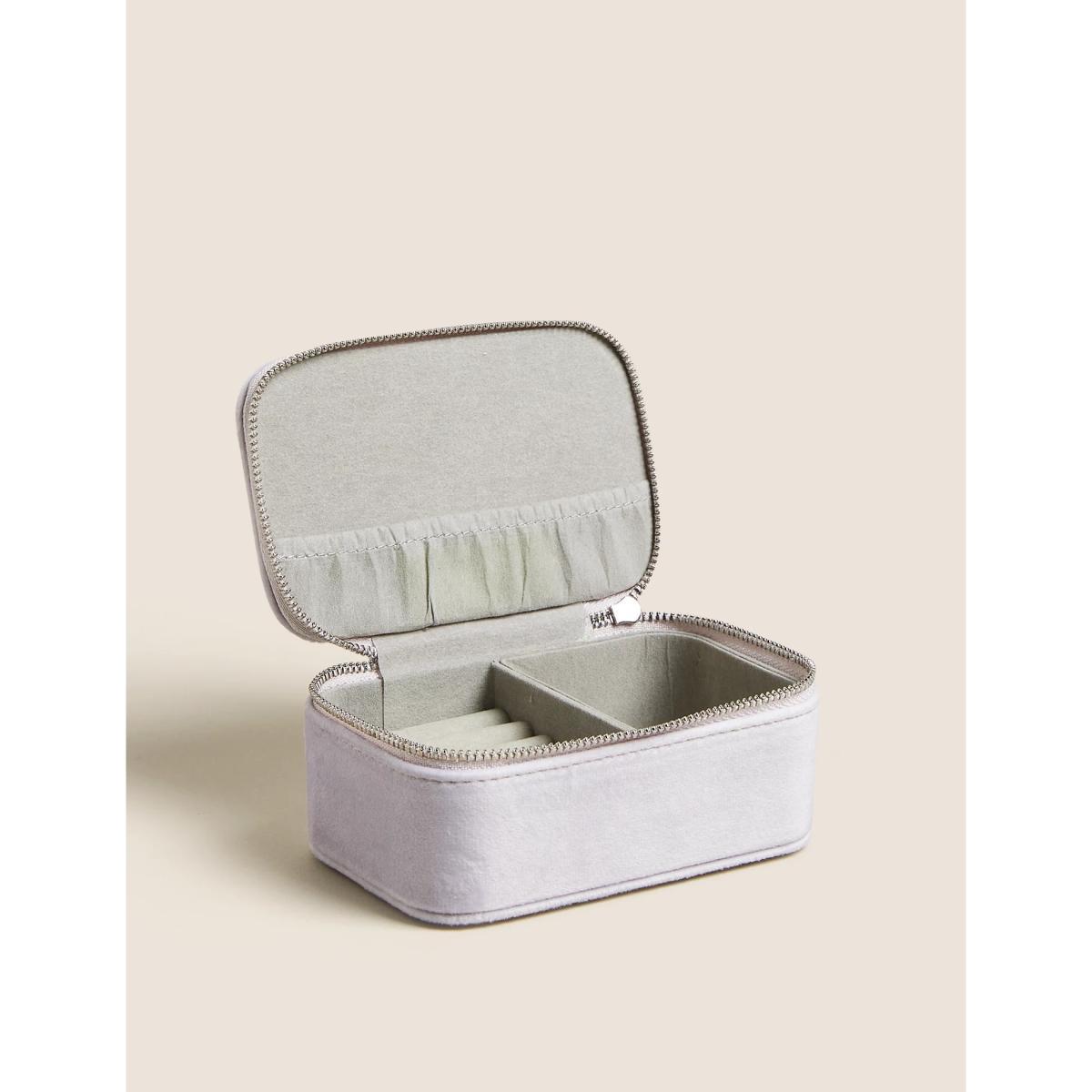 Keep your favourite jewellery safe in this elegantly designed box. It's finished with luxuriously soft velvet and silver metallic embroidered lettering on the top. The box comes with ring and earring rolls and a larger compartment for easy organisation. A zip fastening makes it perfect for travel.