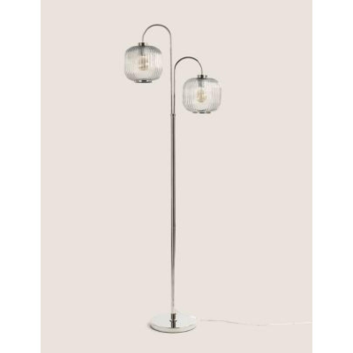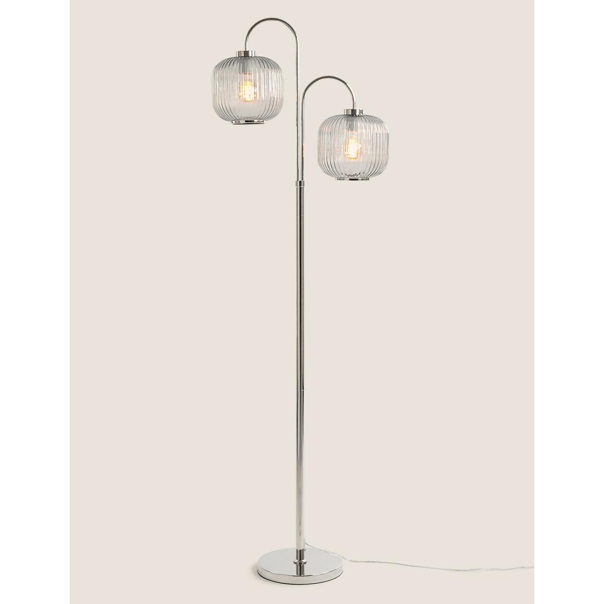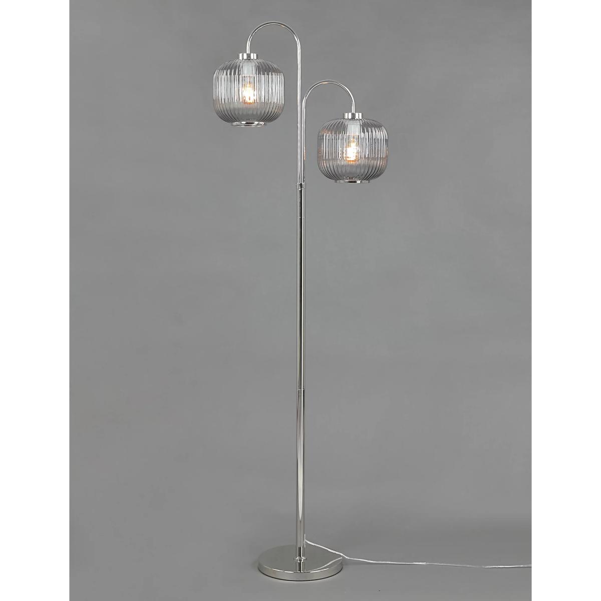 Brighten up your living space with this striking polished nickel floor lamp. It features two Scandi-inspired glass pendants, set at different heights on elegant, curved arms. The glass shades are ridged for a unique look.