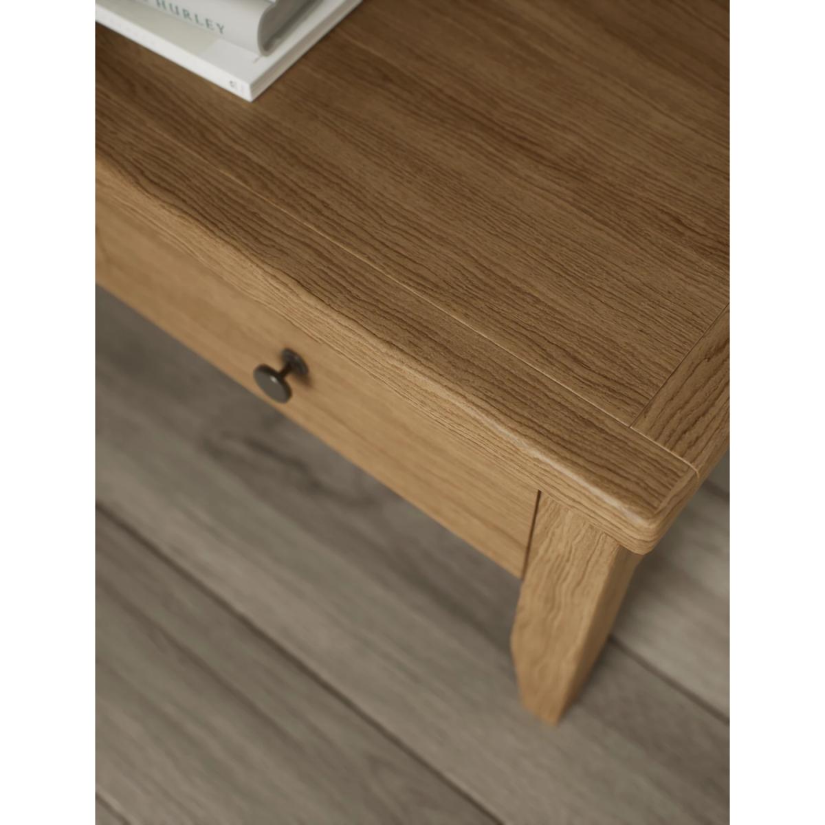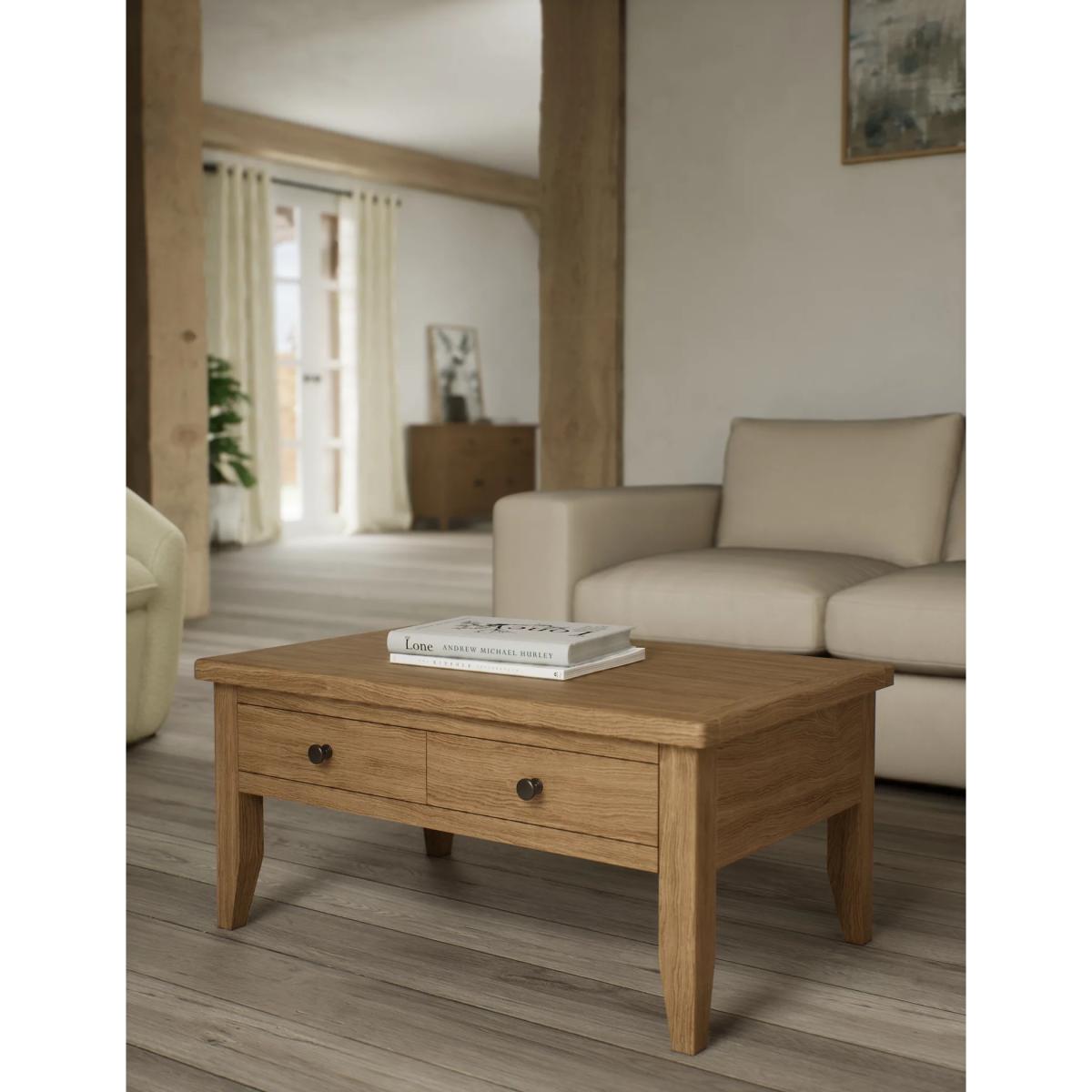 I’d call this the Amersham oak coffee table - I love its clean lines and sturdy feel. The warm oak tone blends effortlessly into Scandi, contemporary or country‐style living rooms, and the two shallow drawers are great for hiding remotes or coasters. For styling, keep a low stack of coffee-table books on one side, add a small ceramic vase or glass candle for contrast, and use a slim tray on the other side to corral smaller items. Finished off with a natural-fibre rug underneath, it brings both function and a relaxed, lived-in look to the space.