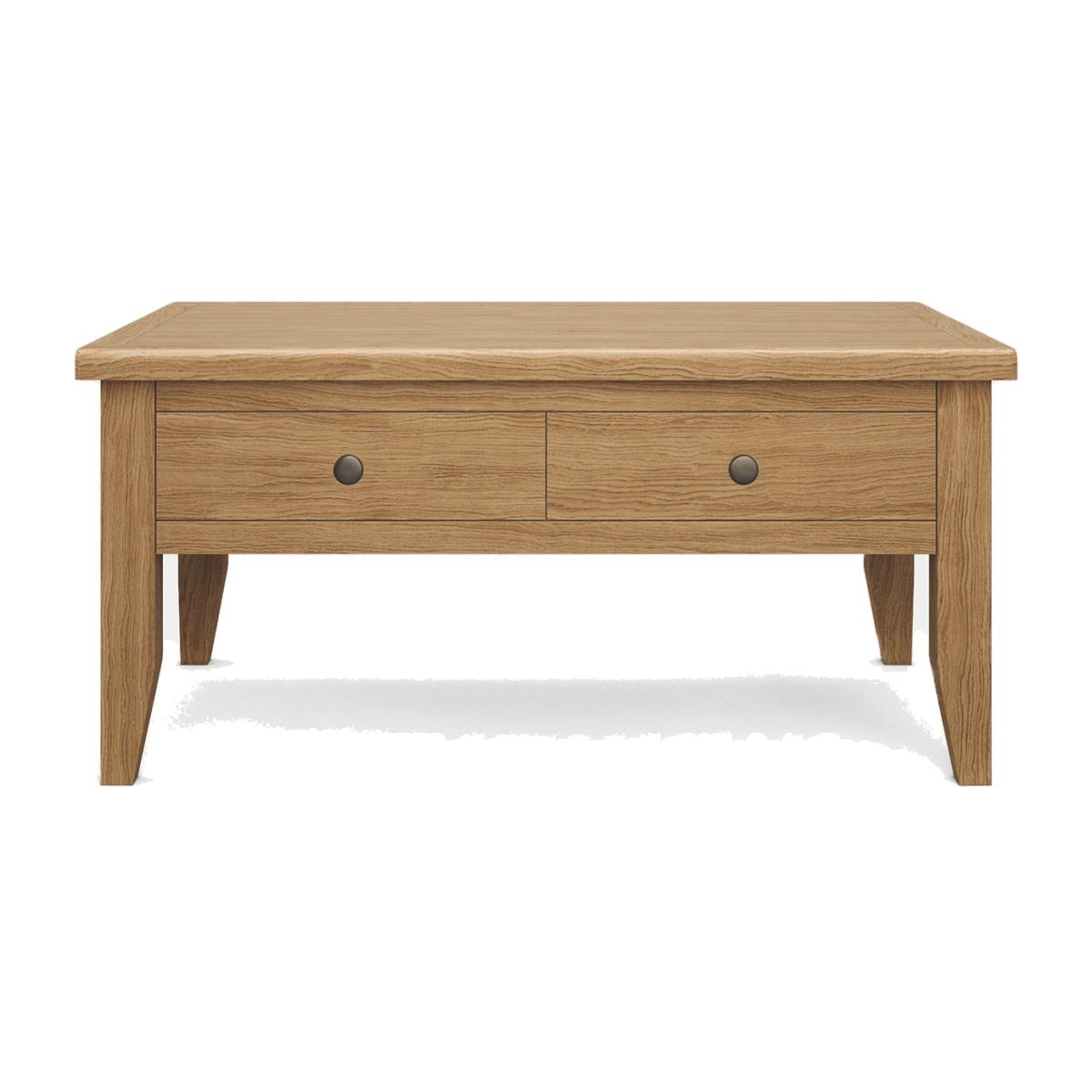 Add a timeless centrepiece to your living space with this Amersham coffee table. The design has a natural wood grain, featuring an oak veneer on the main body and wooden legs. Two drawers offer storage for remotes or chargers, while polished metal handles provide a modern finish. We’re so confident our furniture is built to last, our industry-leading guarantee covers any manufacturing failure on all furniture. That’s our promise, and why our furniture comes with a 10-year guarantee that you can trust. Excludes: outdoor furniture and any issues that are a result of normal wear and tear, improper care or accidental damage.