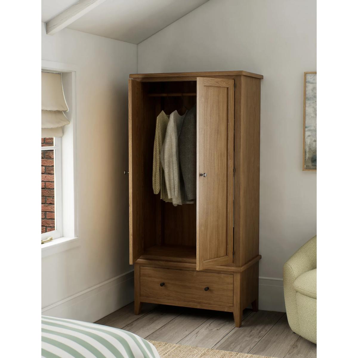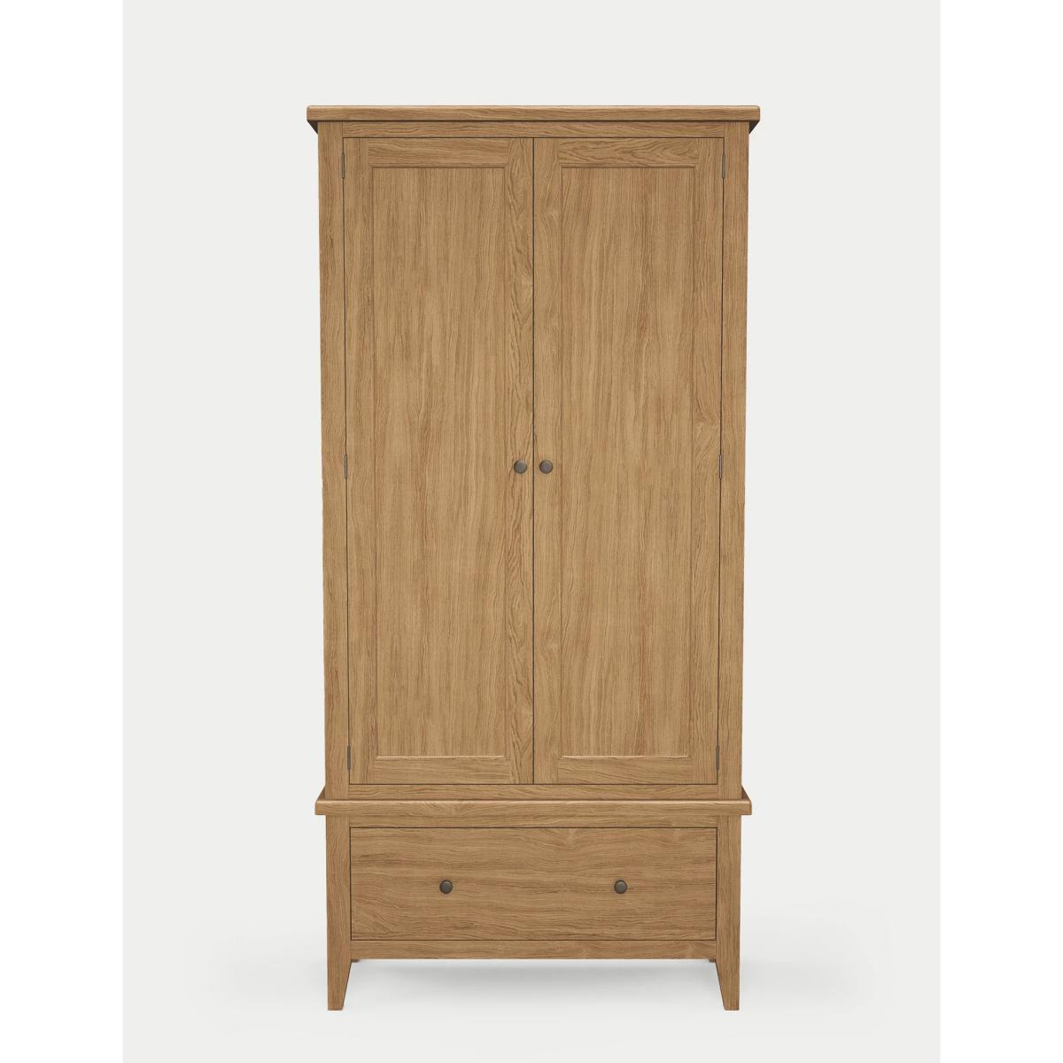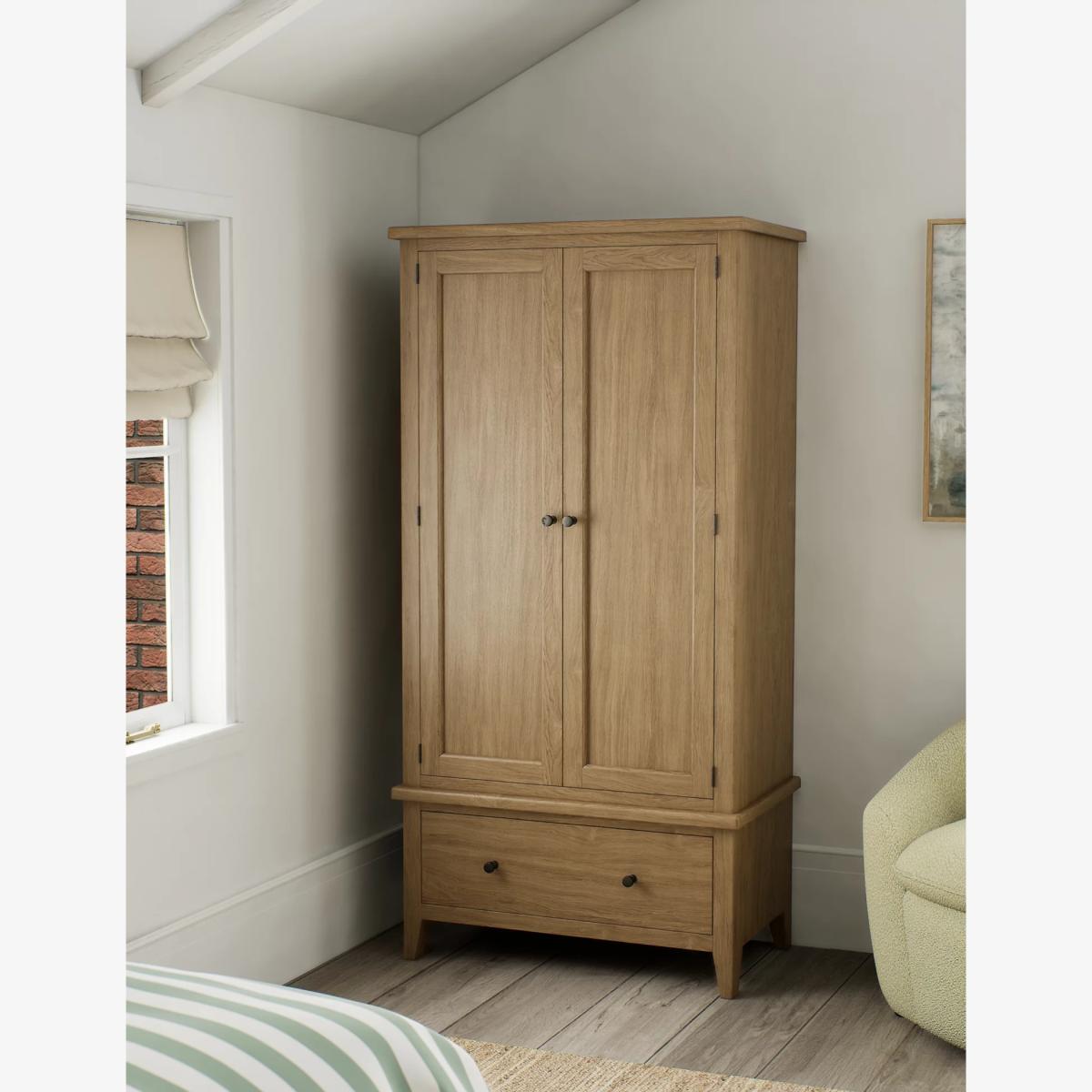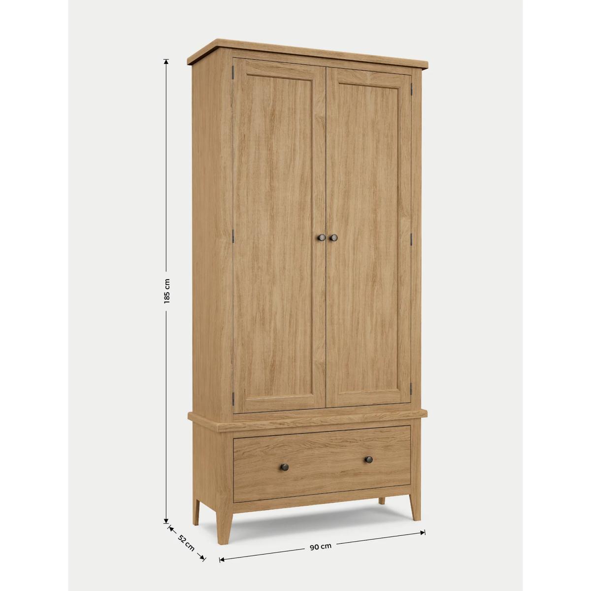 This timeless double wardrobe offers ample storage for your clothes. The design has a natural oak veneer finish and sleek wooden legs for a stylish look. Inside, there's hanging space for shirts and longer items, while the drawer is perfect for t-shirts. Polished metal handles provide a sophisticated touch. Other pieces in the Amersham range are also available. We’re so confident our furniture is built to last, our industry-leading guarantee covers any manufacturing failure on all furniture. That’s our promise, and why our furniture comes with a 10-year guarantee that you can trust. Excludes: outdoor furniture and any issues that are a result of normal wear and tear, improper care or accidental damage.