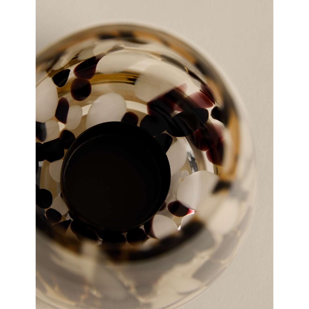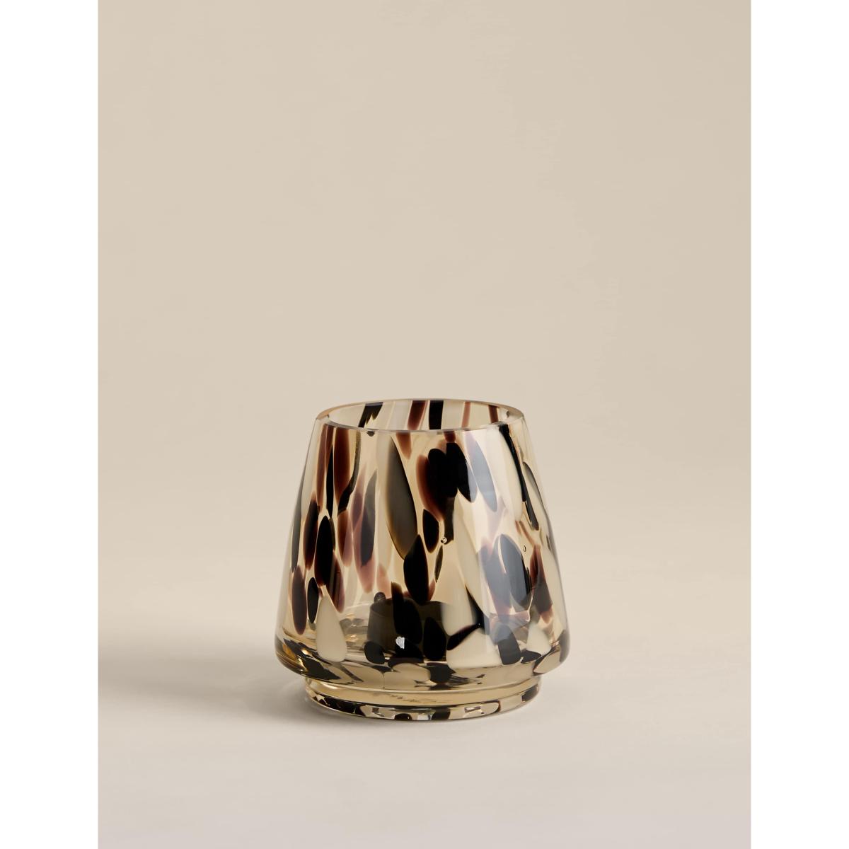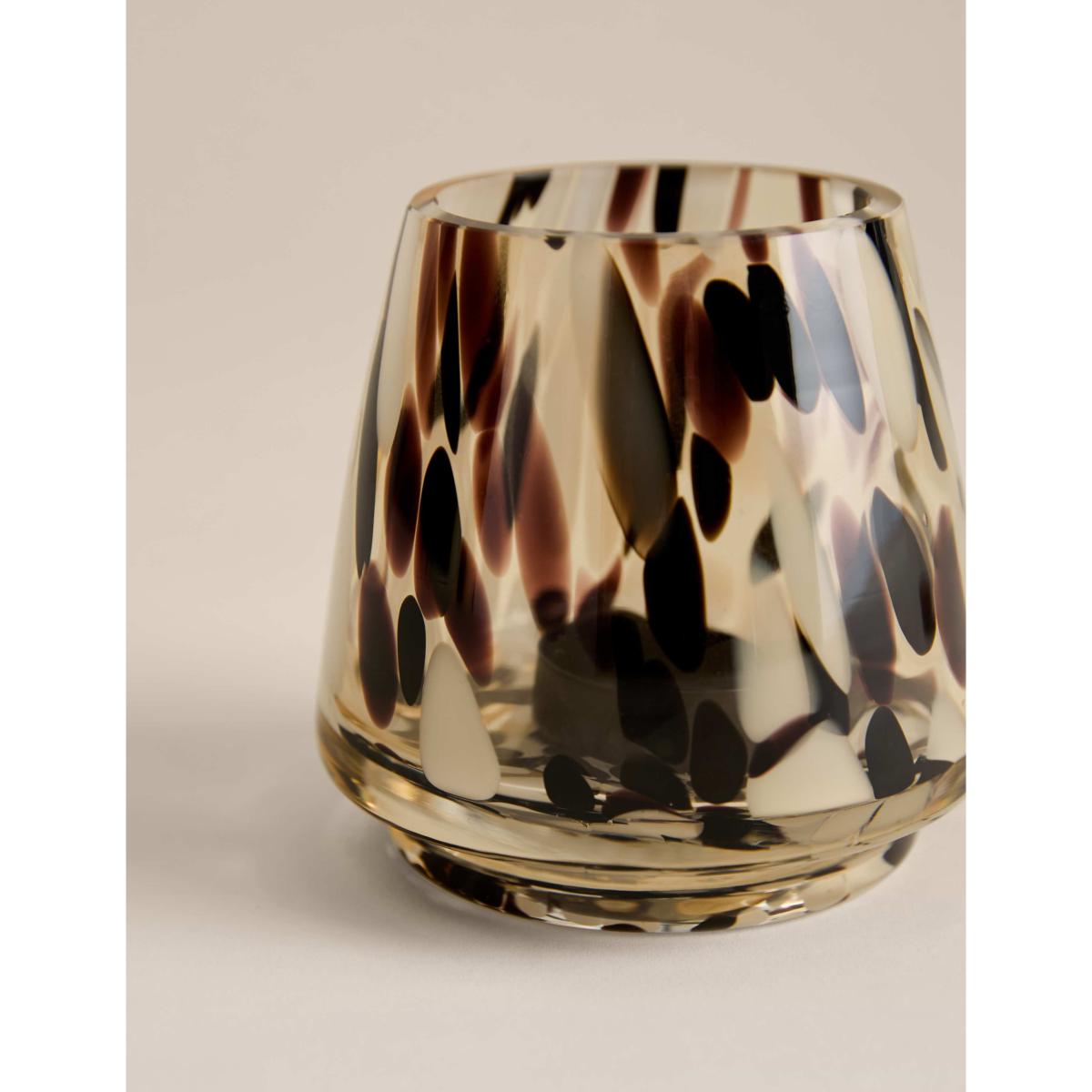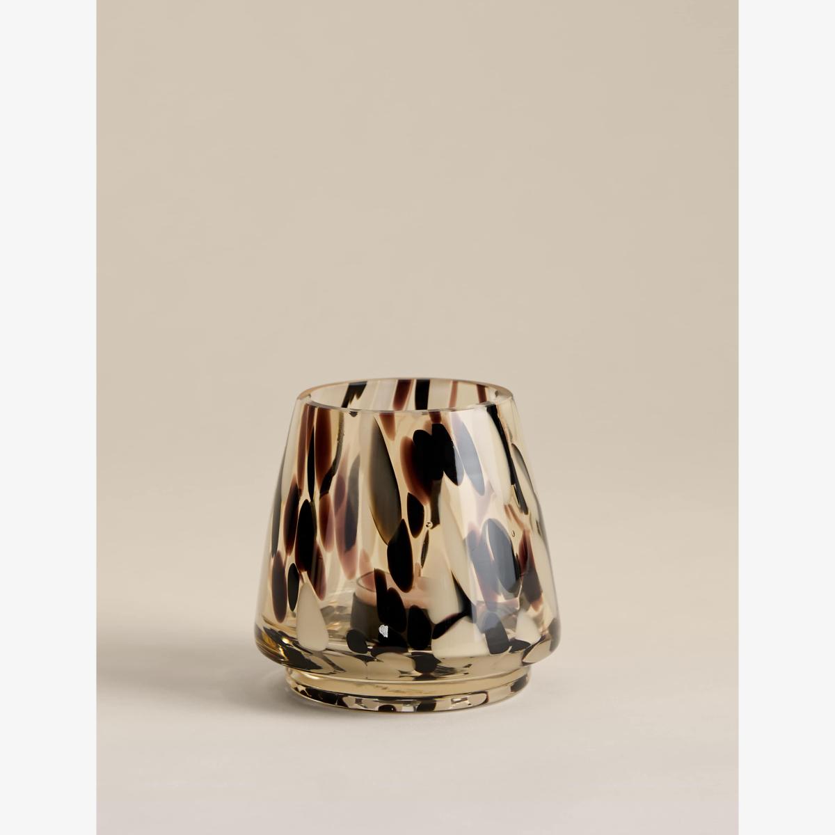 This statement candle holder features a distinctive animal-style confetti design for an eye-catching look. It's crafted from glass with sleek curved lines, and is ideal for burning tealights.