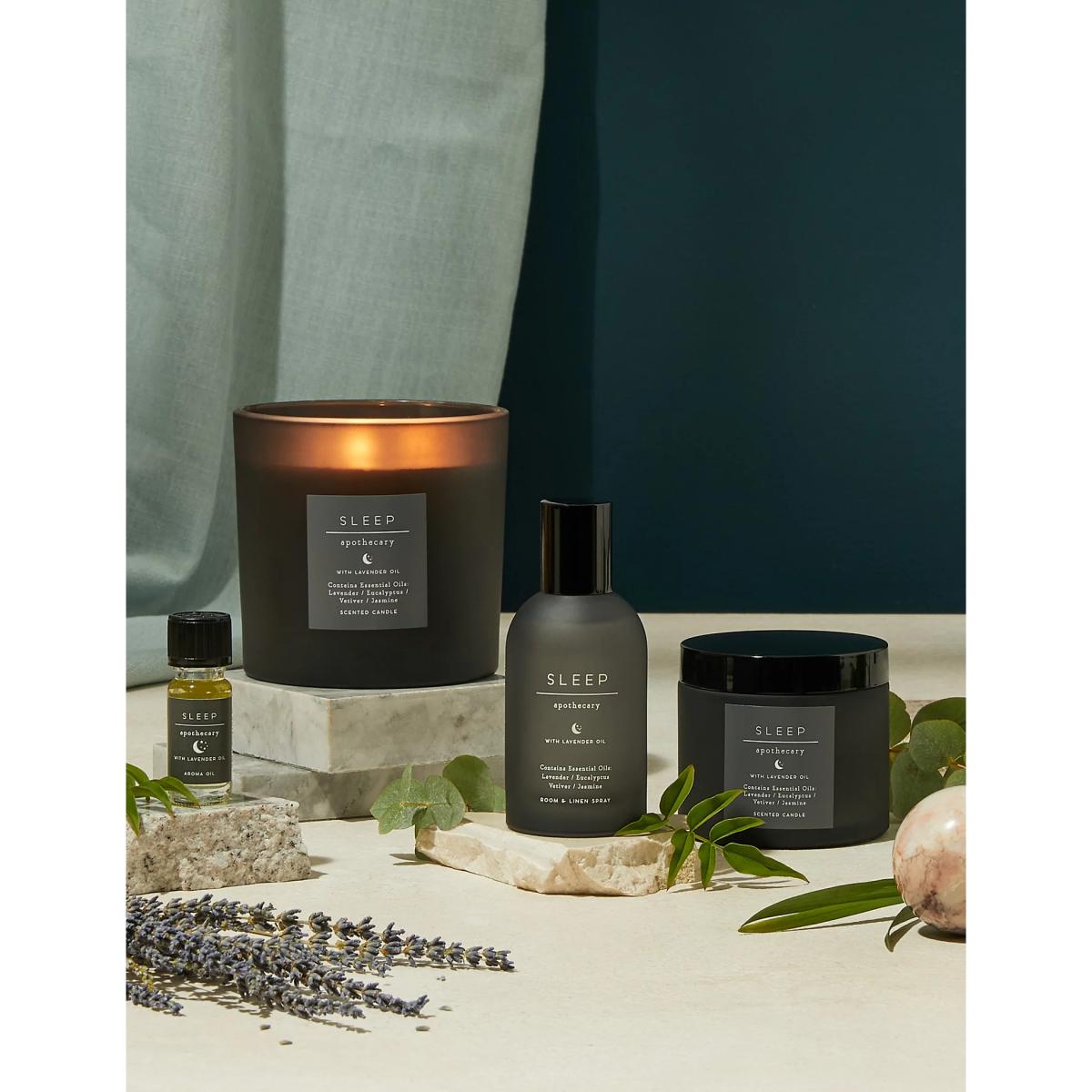 Part of our exclusive Apothecary range, this Sleep candle brings a soothing aroma to your room. This single-wick candle features a rich blend of essential oils including lavender, eucalyptus, vetiver, jasmine and chamomile. Each one of these fragrant oils is considered to have restful and relaxing qualities. An ideal gift, the candle is presented in a polished black-coloured glass holder with a lid.