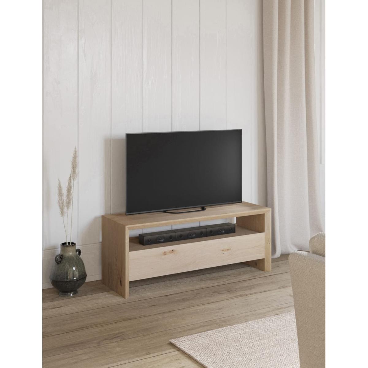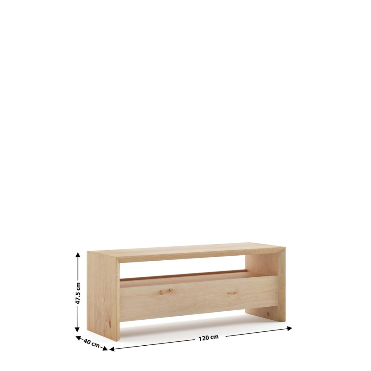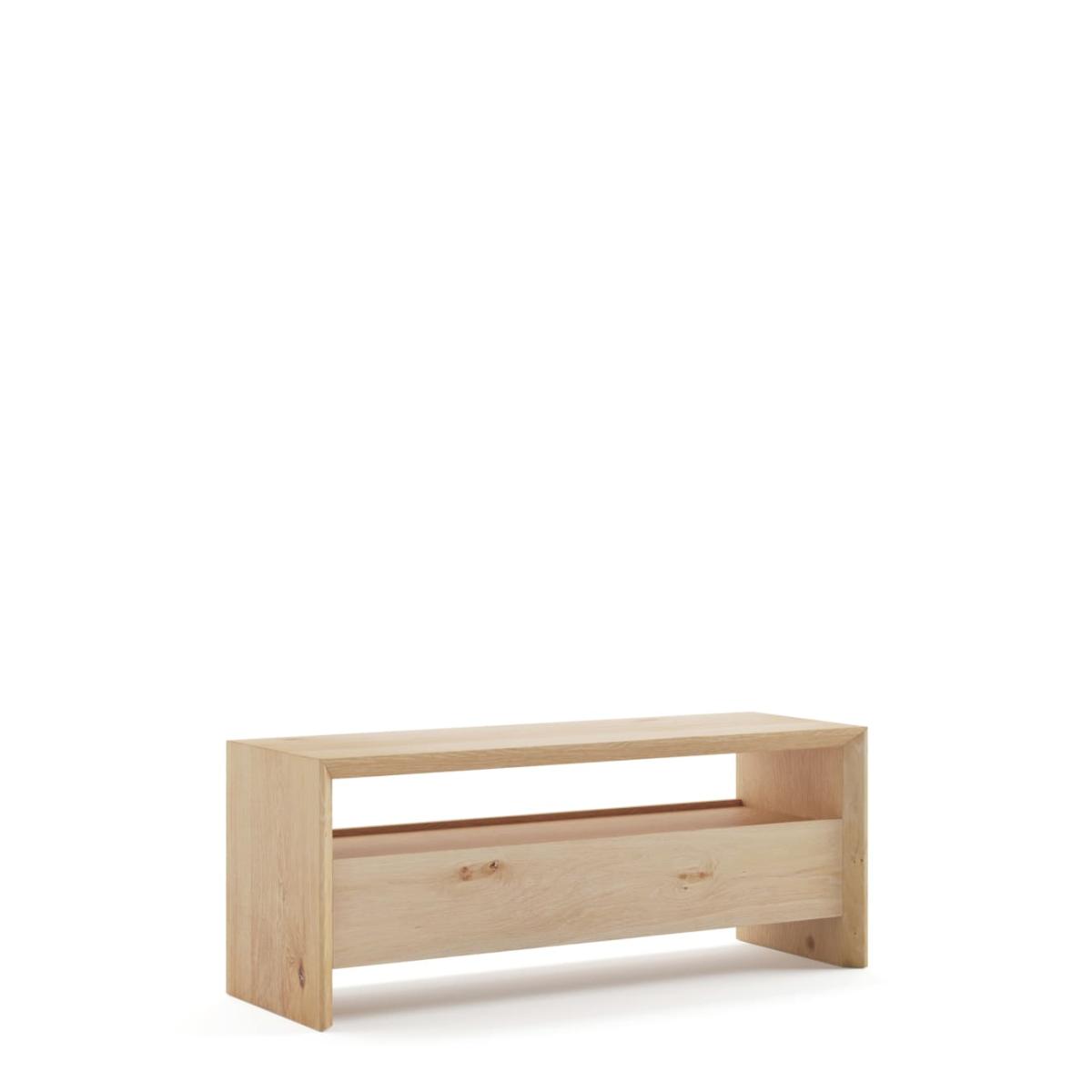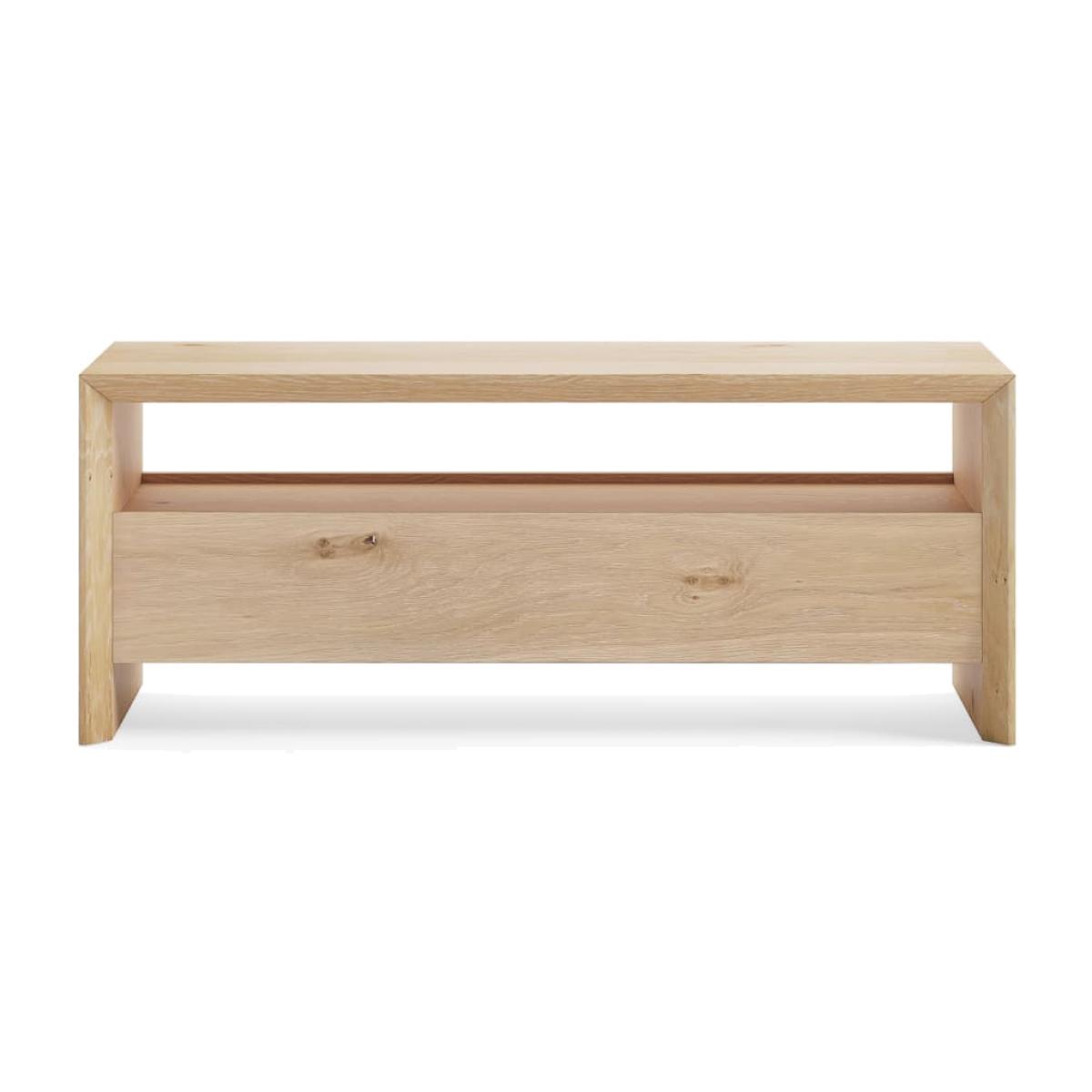 I love this TV stand for its clean, minimalist design and warm oak finish, which adds a touch of natural elegance to any living space. It's versatile enough to suit both modern and Scandinavian-inspired interiors, but also lends itself well to more eclectic or rustic setups when styled thoughtfully. Practical tips include using the open shelf for essential tech accessories or decorative items, while the storage drawer below keeps clutter out of sight. Pair it with muted textiles and neutral colours for a calm, cohesive look, or add pops of colour with accessories to create focal points. Its straightforward design makes it a great canvas for personalised styling without feeling overwhelming.