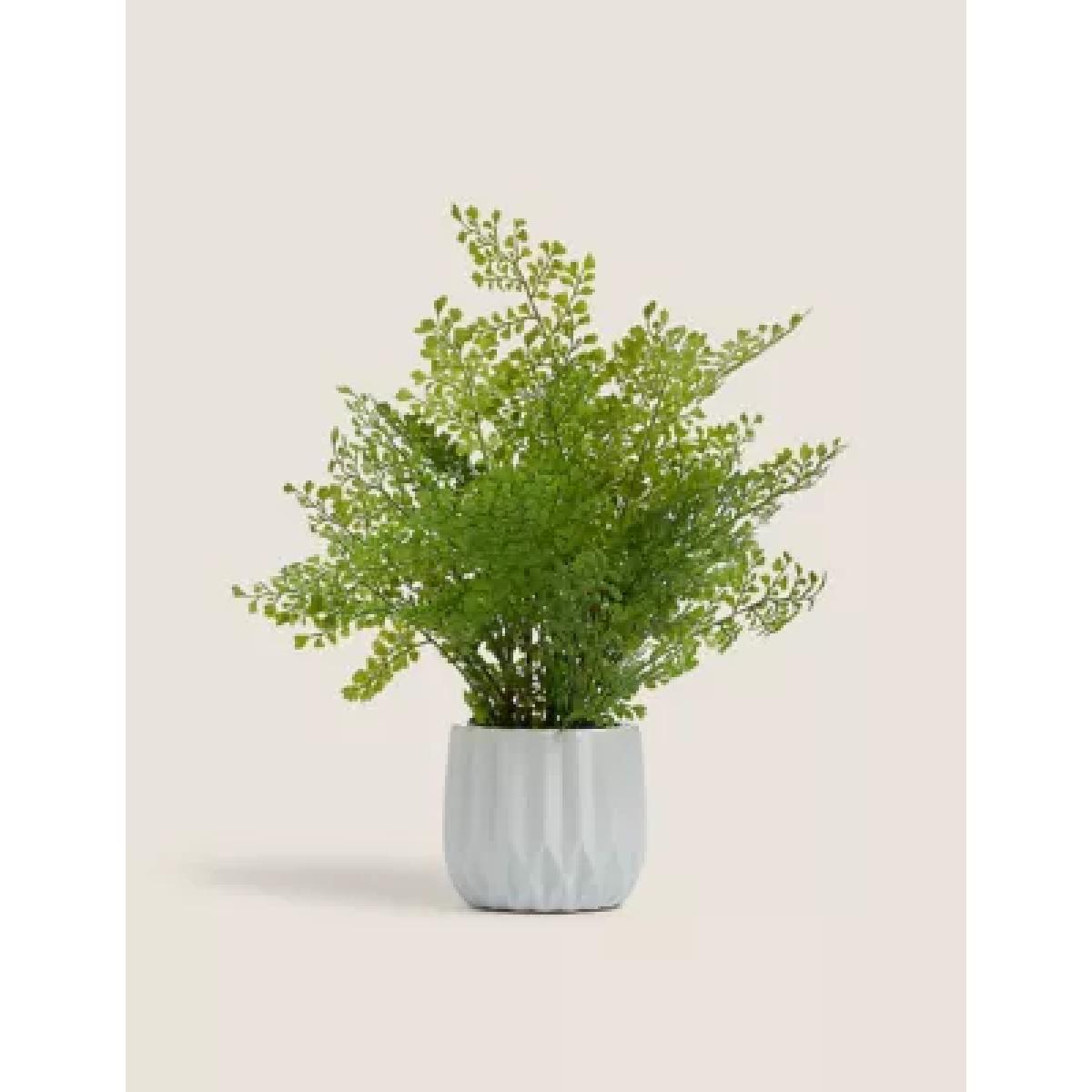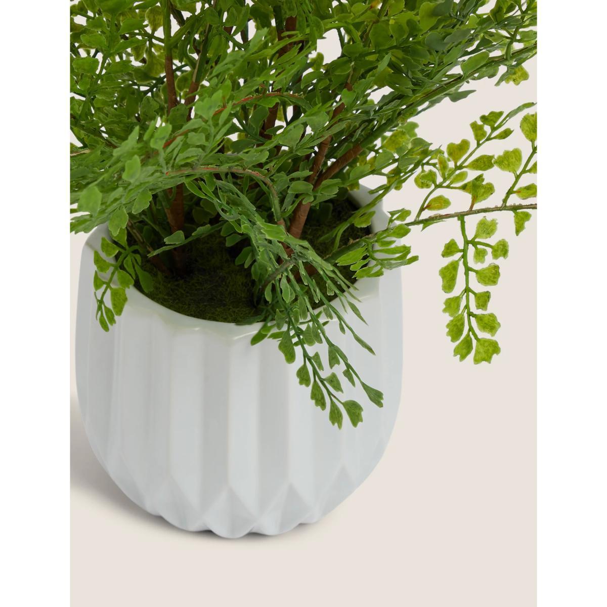This imitation fern will add a fresh botanical touch to any living space. The house plant is presented in a large ceramic pot.