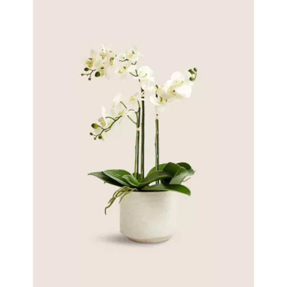 I love this fake orchid for its clean, elegant look that adds a touch of sophistication without the maintenance of real plants. It works particularly well in contemporary or minimalist interiors where it can serve as a statement piece on a side table, mantel, or windowsill. Its neutral white and subtle pink tones make it versatile, blending effortlessly with colour schemes from soft pastels to bold, contrasting shades. Practical styling tips include grouping it with other faux botanicals for a lush display or popping it into a statement pot for added visual impact. It’s a reliable choice for those who want vibrant greenery without the fuss, perfect for busy households or spaces with limited natural light.