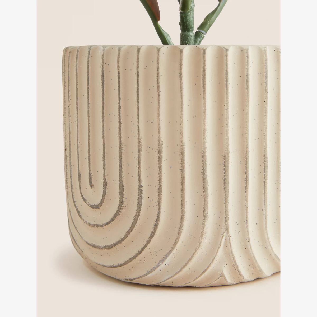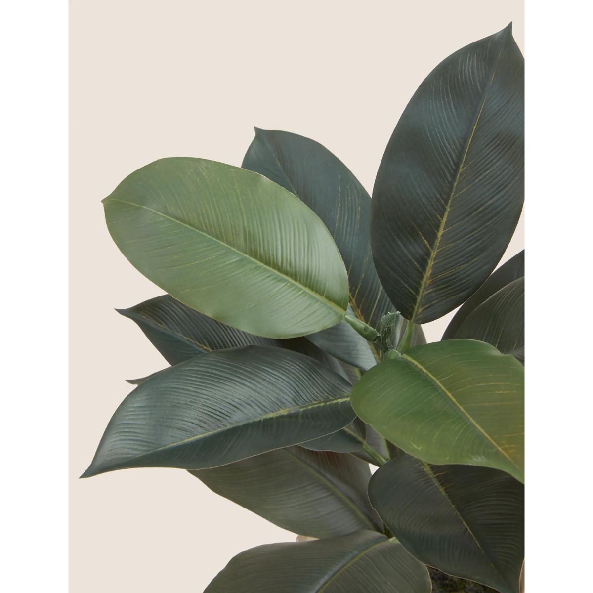 Make an impact in your living space with this artificial rubber plant. The leaves are made with realistic colours and textures. It's housed in a ribbed concrete pot for a stylish effect. Each pot is hand finished, meaning every item has a rustic look.