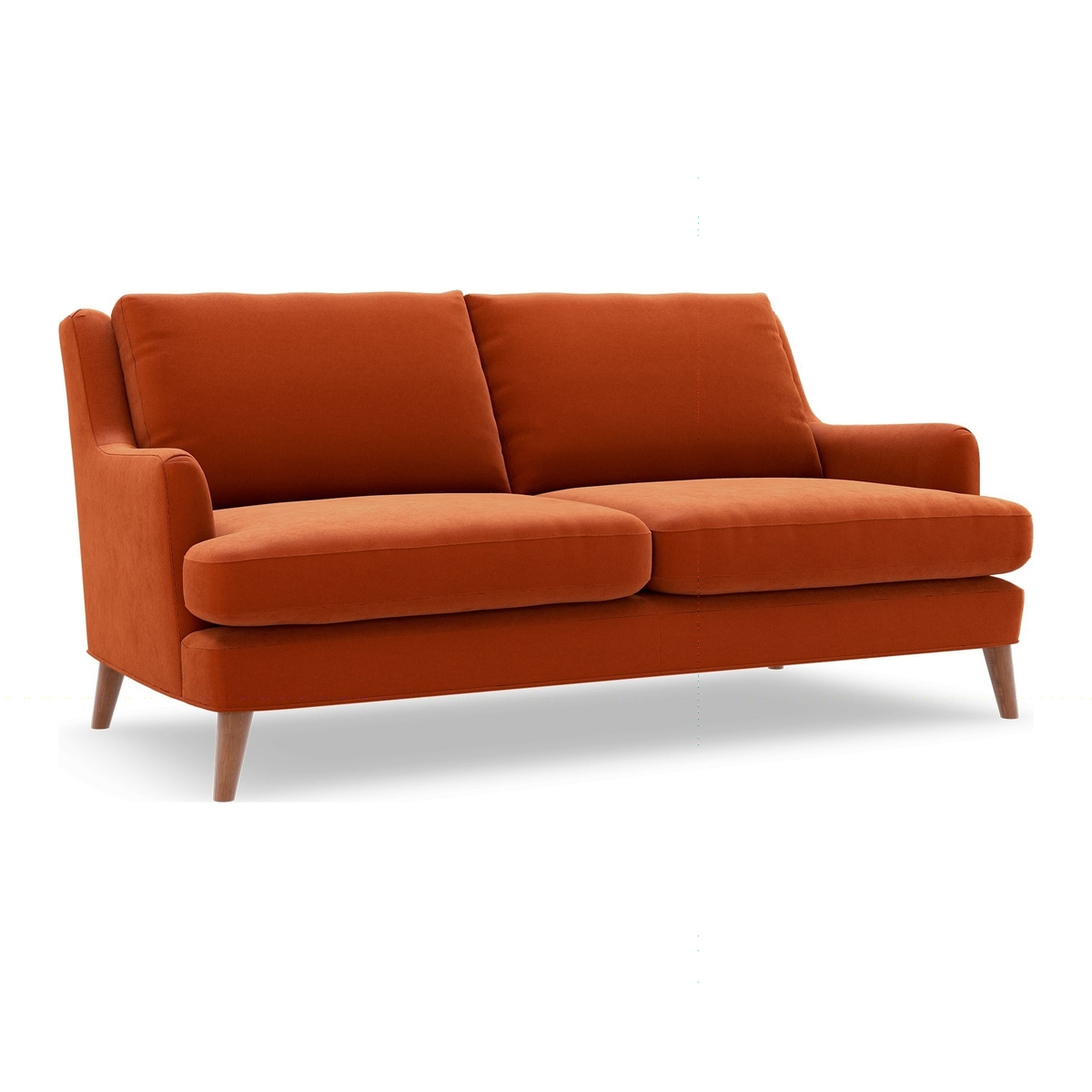 I love this medium sofa in a warm, rich terracotta hue - it's versatile enough to anchor both modern and vintage-inspired interiors. Its soft lines and tapered wooden legs lend a relaxed, approachable feel, making it a great focal point in living rooms that feature earthy tones or abstract patterns. Styling tips include pairing it with textured cushions in contrasting colours like navy, ochre, or blush, to add depth and interest. It works well in spaces that blend contemporary with mid-century elements, especially if complemented by natural materials like wood or linen curtains. For practicality, consider adding a cosy throw or slipcover in a neutral or coordinating colour to keep it looking fresh while making the space more inviting.