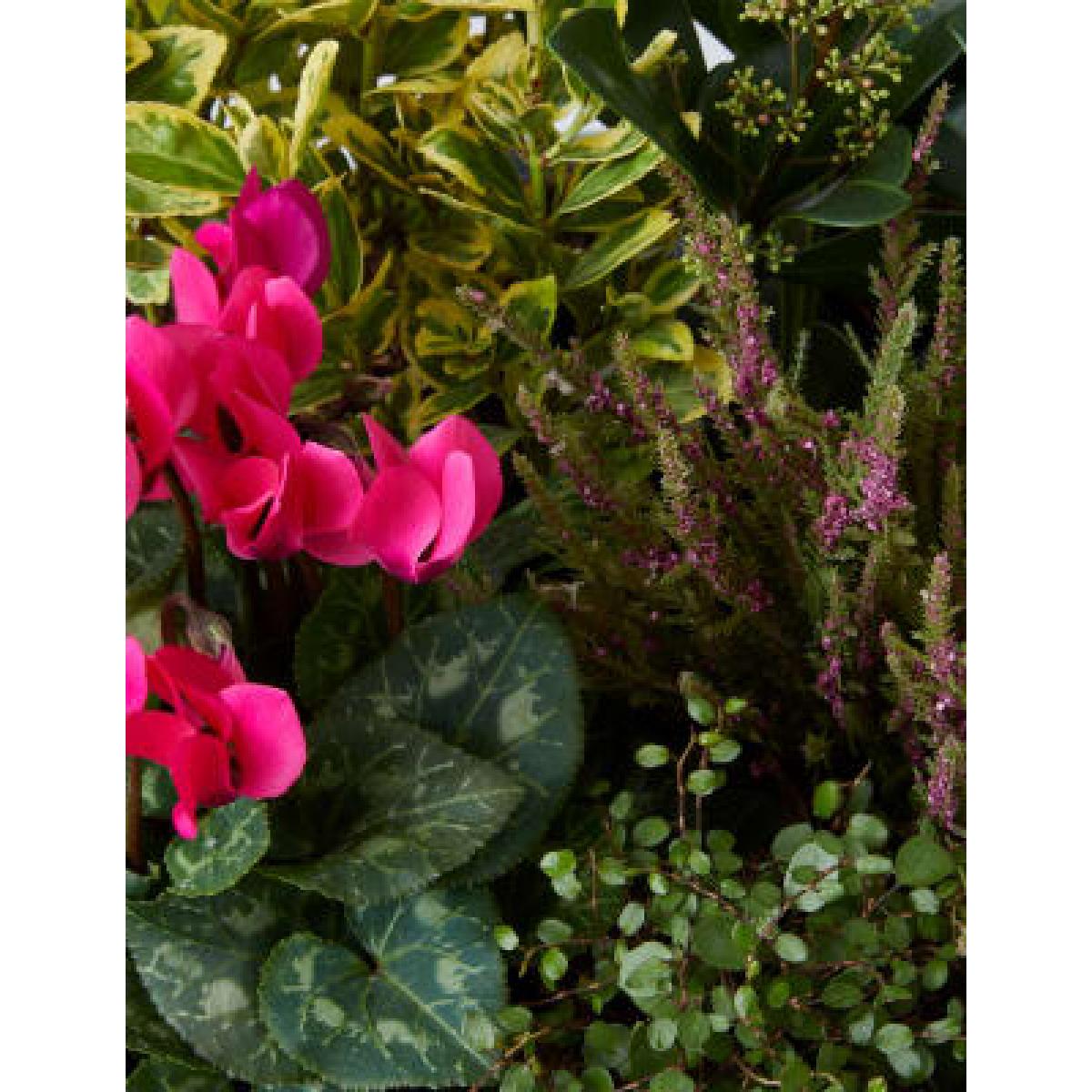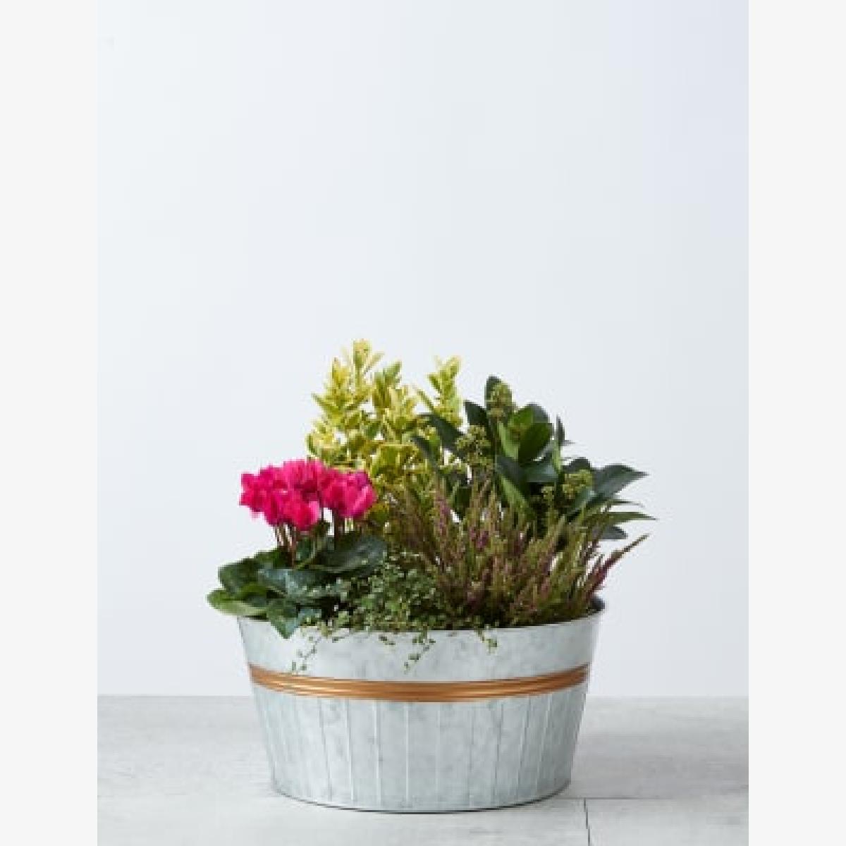 Show a loved one you care with this striking Autumn tin planter. This seasonal outdoor planter includes a stunning arrangement of plants displayed in a stylish copper banded tin. Colours may vary slightly throughout the season.