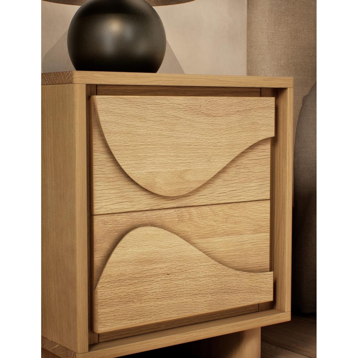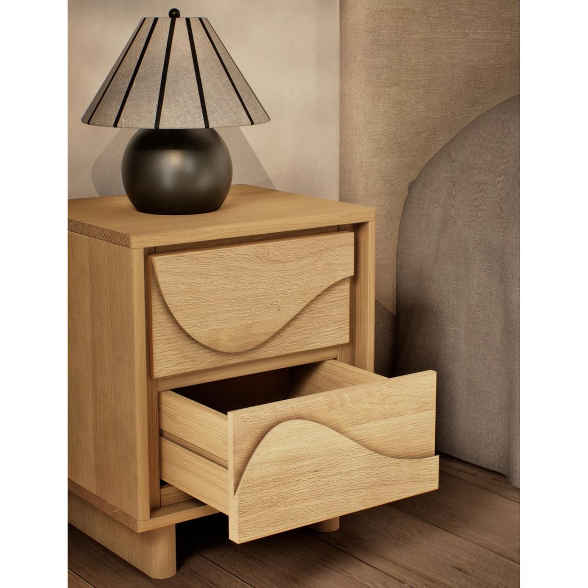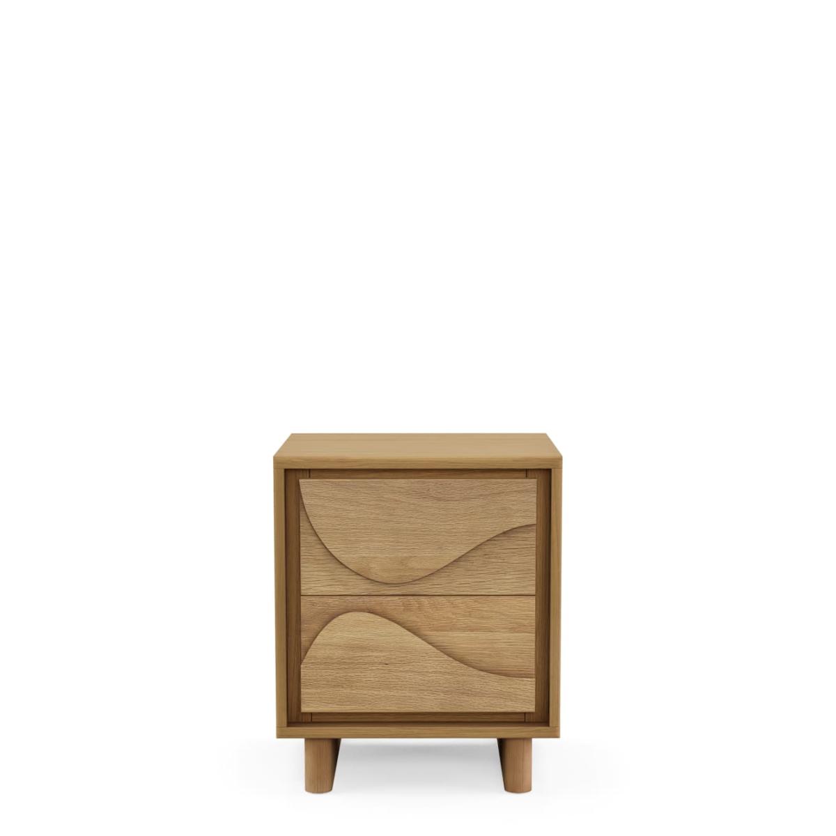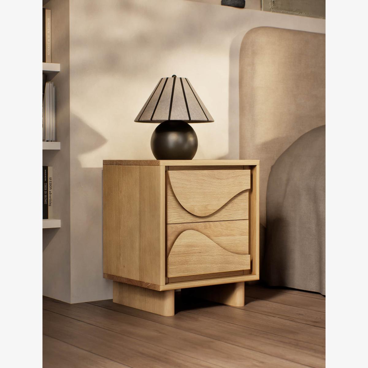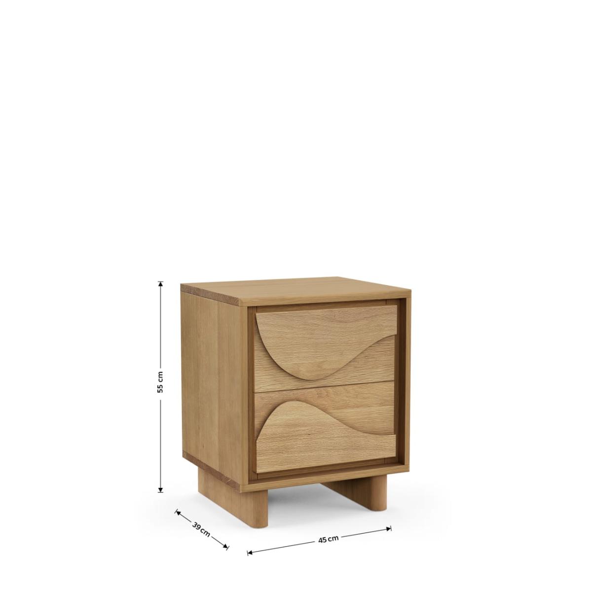 Bring a touch of modern artistry to your bedroom with the Avery bedside table. It features a sleek oak veneer finish and gently curved drawer detailing. This piece is elevated off the floor on sturdy oak legs to create a light and airy feel, while two spacious drawers provide ample storage for your nighttime essentials. We’re so confident our furniture is built to last, our industry-leading guarantee covers any manufacturing failure on all furniture. That’s our promise, and why our furniture comes with a 10-year guarantee that you can trust. Excludes: outdoor furniture and any issues that are a result of normal wear and tear, improper care or accidental damage.