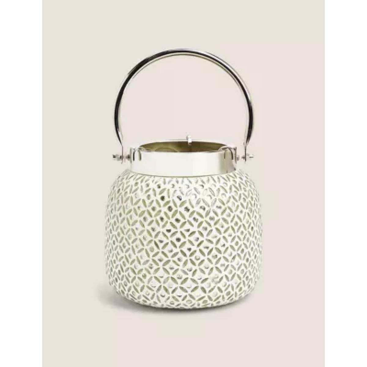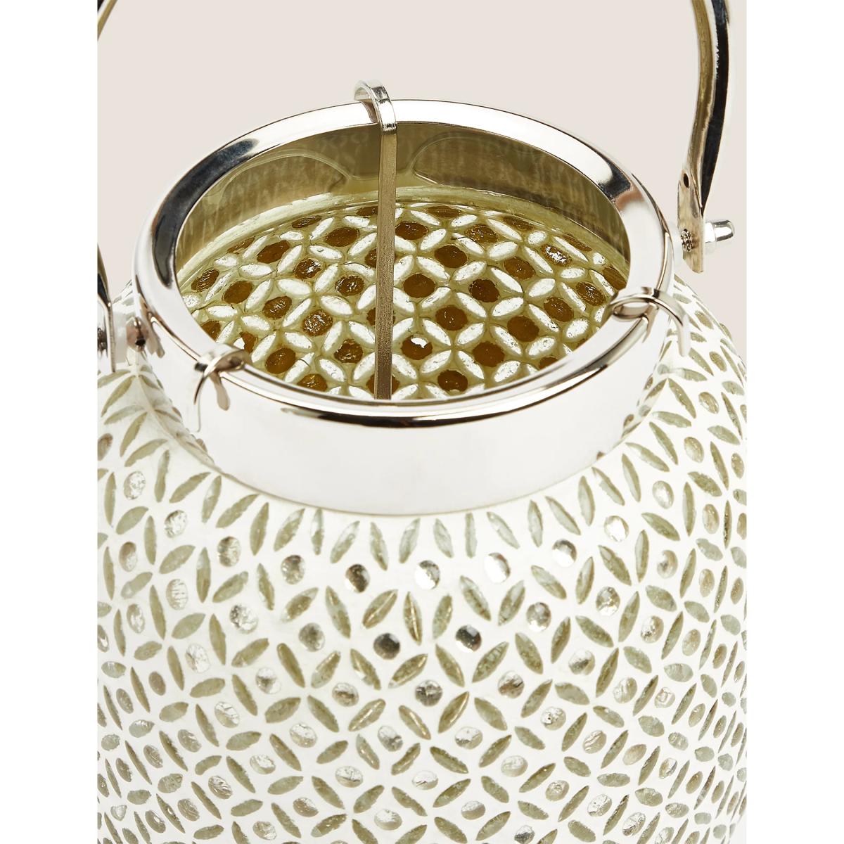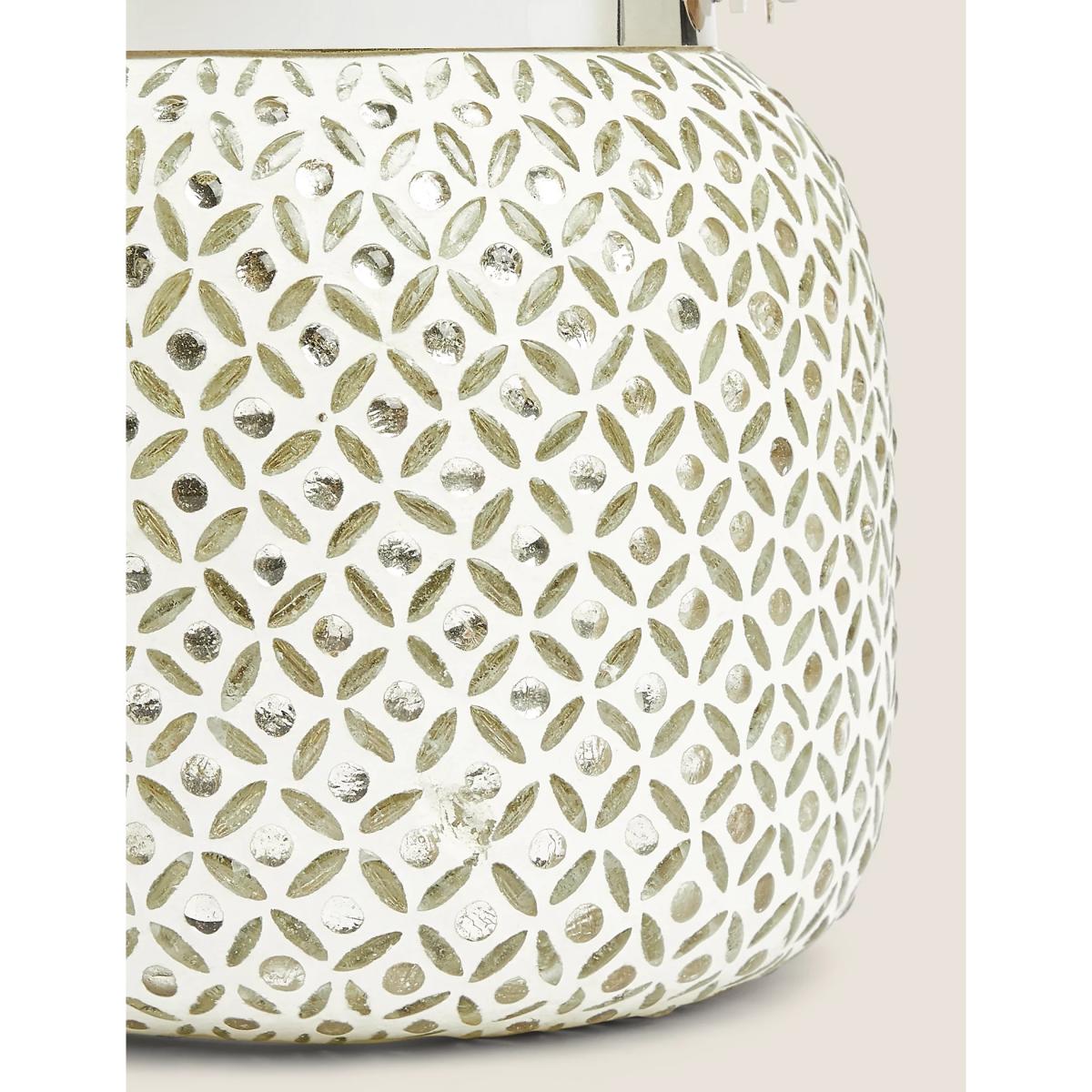 This beaded glass lantern will add a wonderful warm glow to your living room. It's embellished with delicate beading for a classic look that shines, with or without a candle to brighten it. It's fitted with a silver-tone handle and an easily removable tealight holder. Finished by hand, this is a unique decorative piece.
