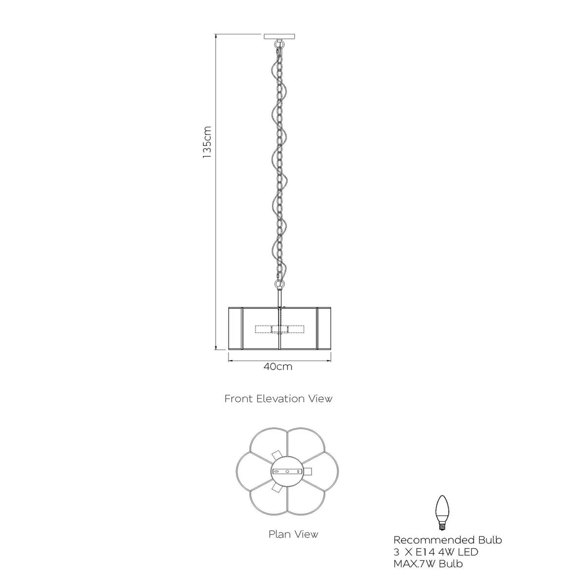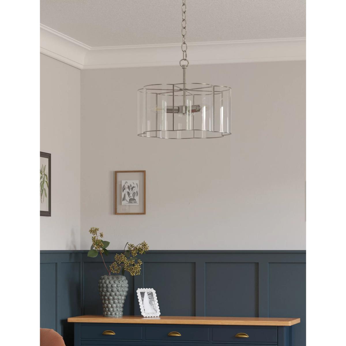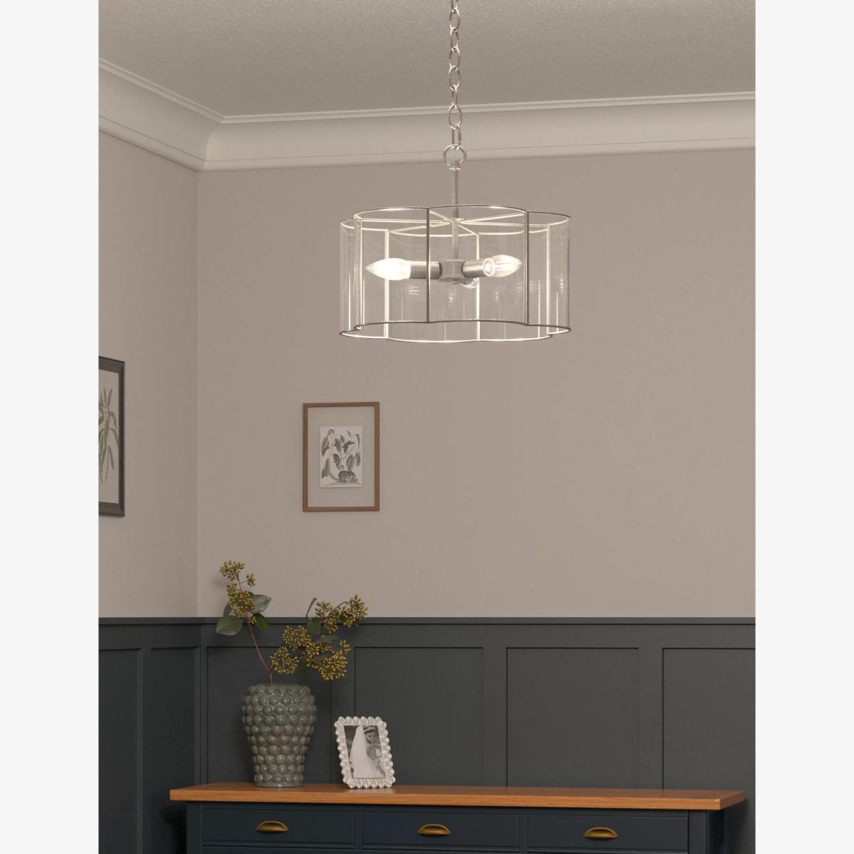 Make a statement in your living space with this metal and glass pendant light. The clear shade has a subtle floral shape, with curved panes that echo the organic design. It hangs from a chain with large links to offer an elegant take on the industrial look. A round metal ceiling fixture completes the sleek look.