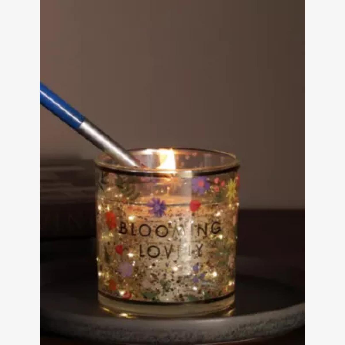 This candle blooms with colourful florals, silver glitter and glowing LED lights. It also features a cheerful 'Blooming Lovely' slogan at the front and comes scented with a zesty neroli, lime and bergamot fragrance. Simply light the wick to trigger the soft lights. This fragrance is part of the Herbal family of fragrances. Herbal scents are often considered to have soothing and relaxing qualities and may contain notes such as lavender, cedar wood, vetiver or eucalyptus.