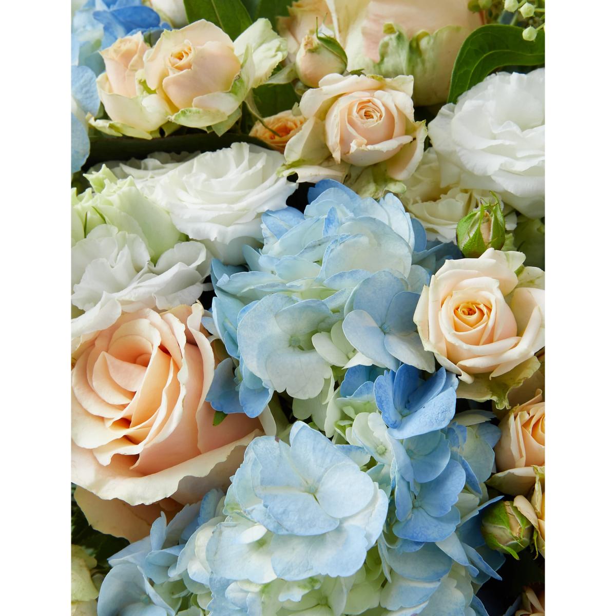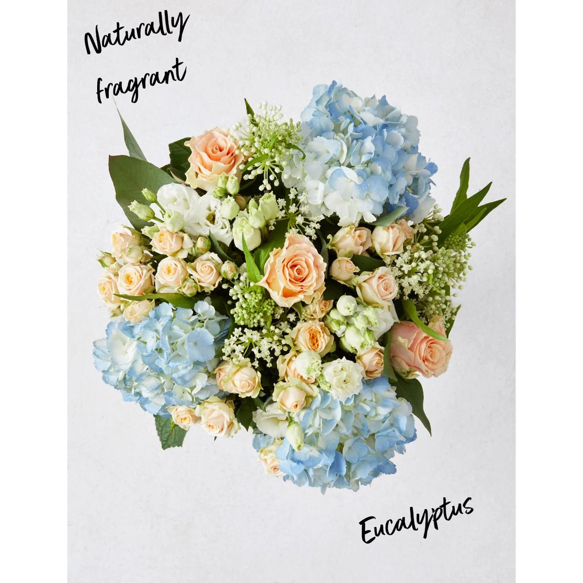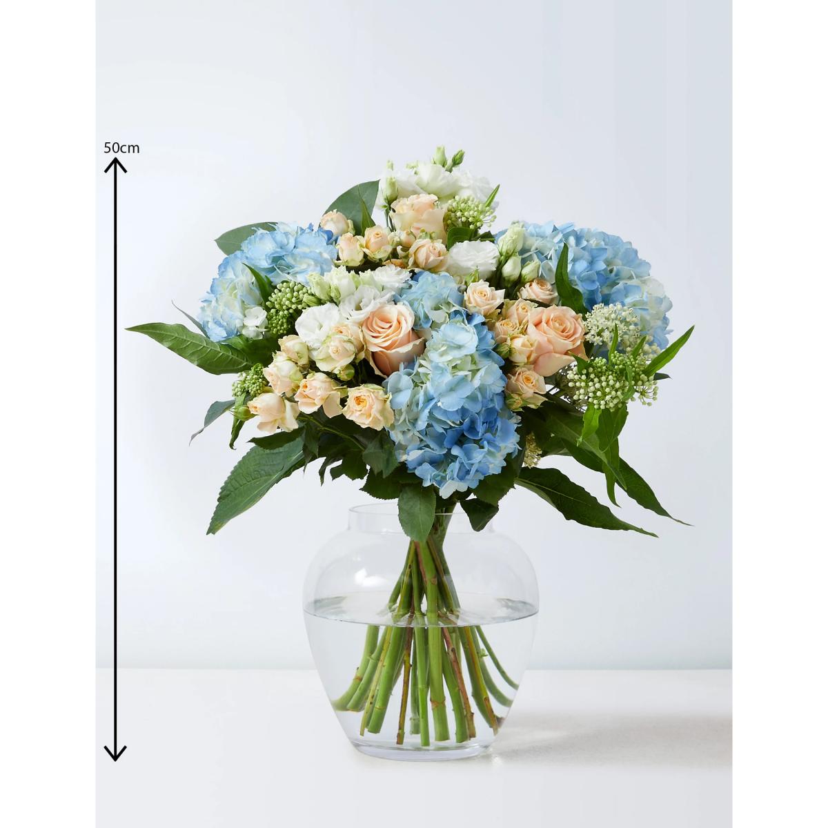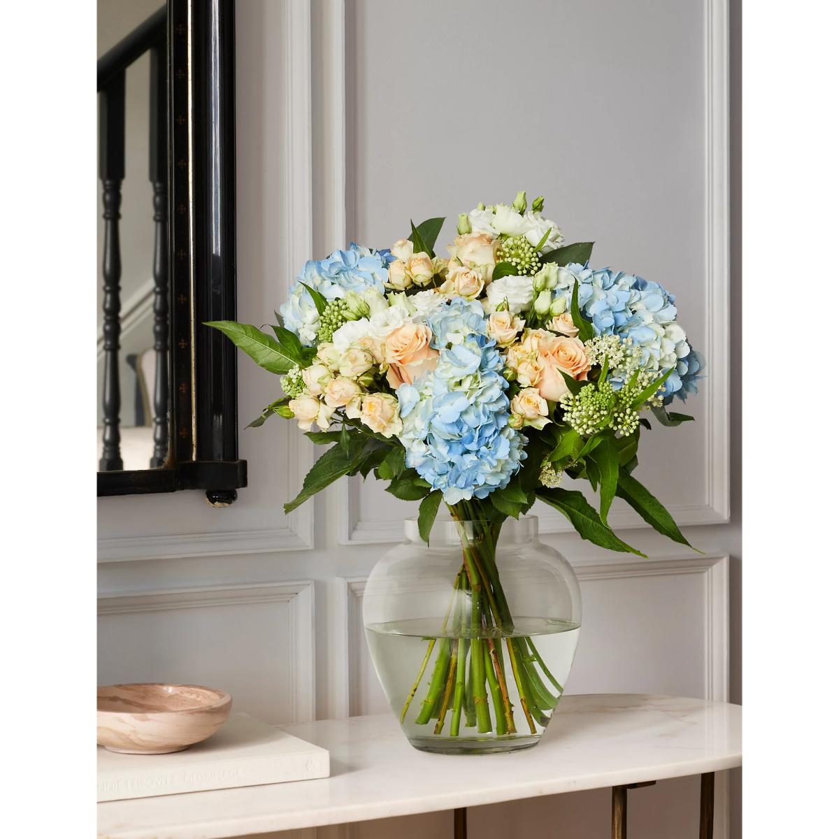 I love this arrangement for its realistic appearance and versatile colour palette. It works well in both traditional and modern interiors, adding a fresh, natural touch without the fuss of upkeep. The blue hydrangeas bring a subtle cool tone that pairs nicely with soft neutrals, while the rose accents add a hint of warmth. For styling, place it in a simple clear glass vase on sideboards, coffee tables, or mantlepieces to create an elegant focal point. Practical tip: mix it with a few real blooms or greenery for an effortless, curated look, or pair it with neutral-toned accessories to keep the room feeling calm and inviting.