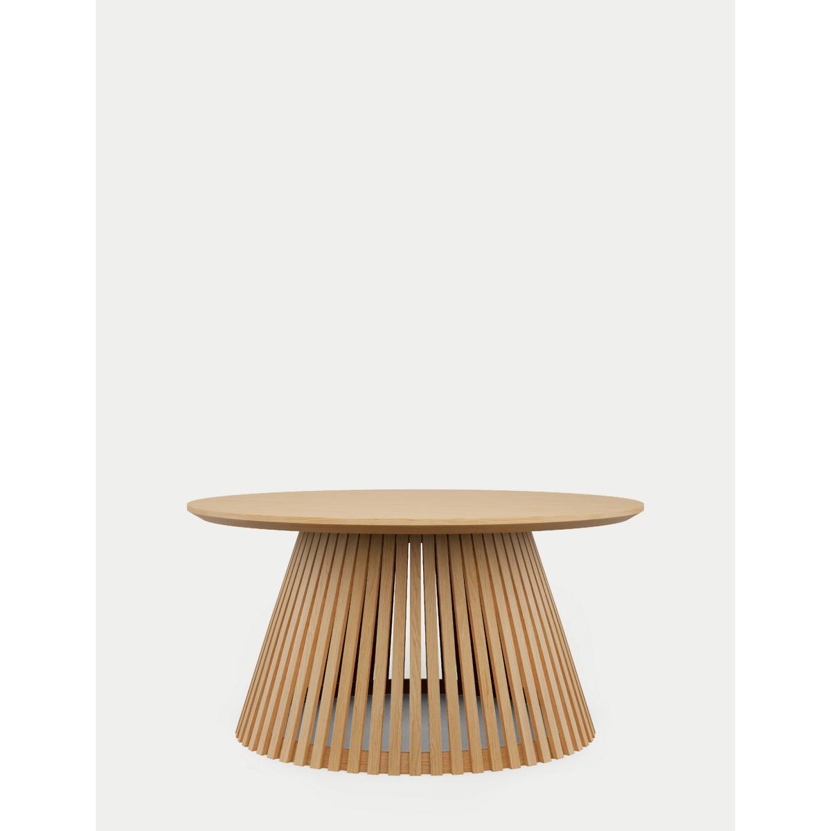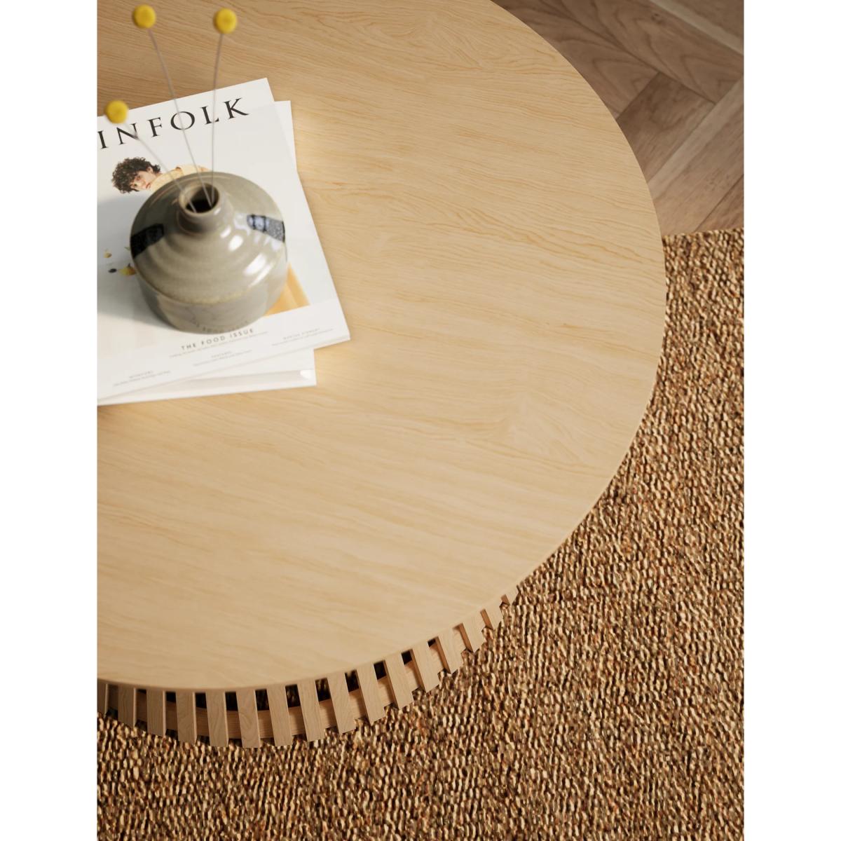I’m a fan of the Boardwalk table because its natural ash-tone finish and slatted base bring warmth and visual interest without overwhelming a room. Its low, round silhouette sits neatly in front of sofas in Scandi-inspired, coastal or modern minimalist living spaces, and the open structure keeps sightlines clear for a more spacious feel. To style it, start with a slim wooden or marble tray to corral a couple of coffee-table books and a small vase or sculptural object. Layer in texture with a woven basket tucked underneath for magazines or throws. Keep the top lightly arranged so the table’s elegant shape remains the focal point.