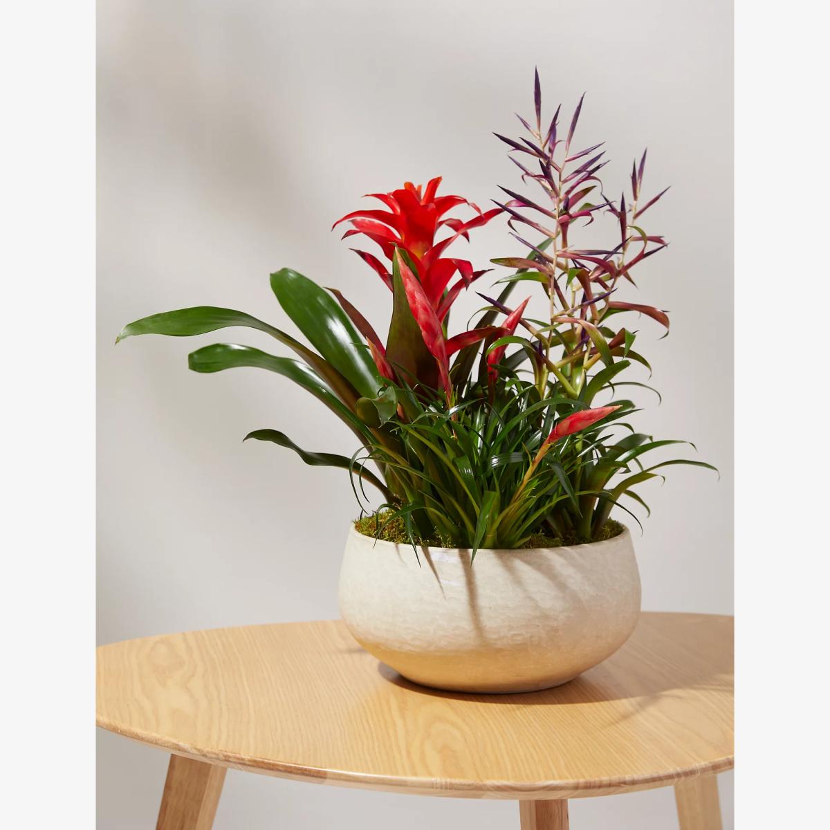 This clean and jungle like aesthetic of brightly coloured bromeliads makes for a gorgeous contemporary arrangement to suit any home. Planted in a modern concrete planter, these plants bloom for months to come. Colours may vary slightly throughout the season.